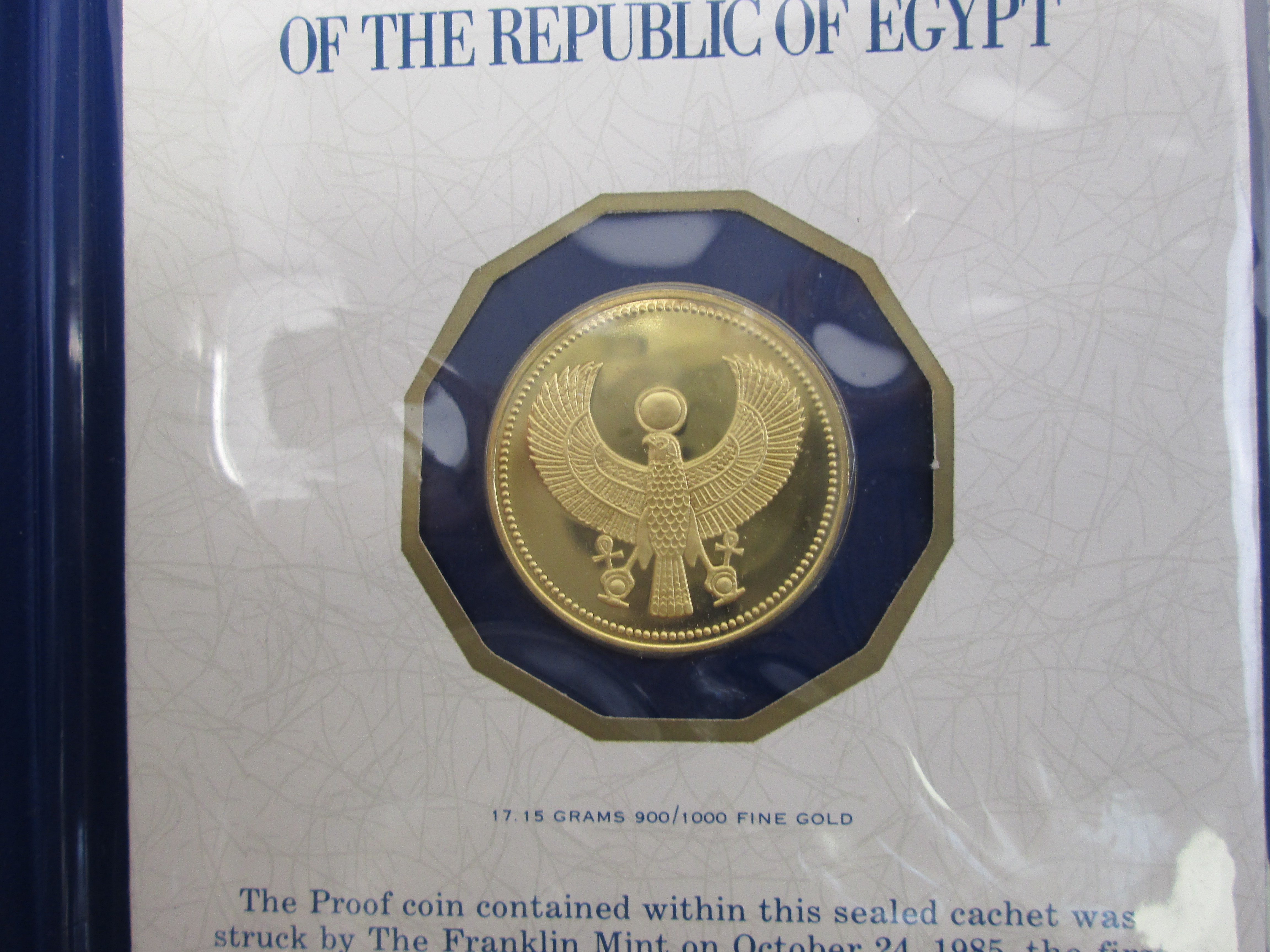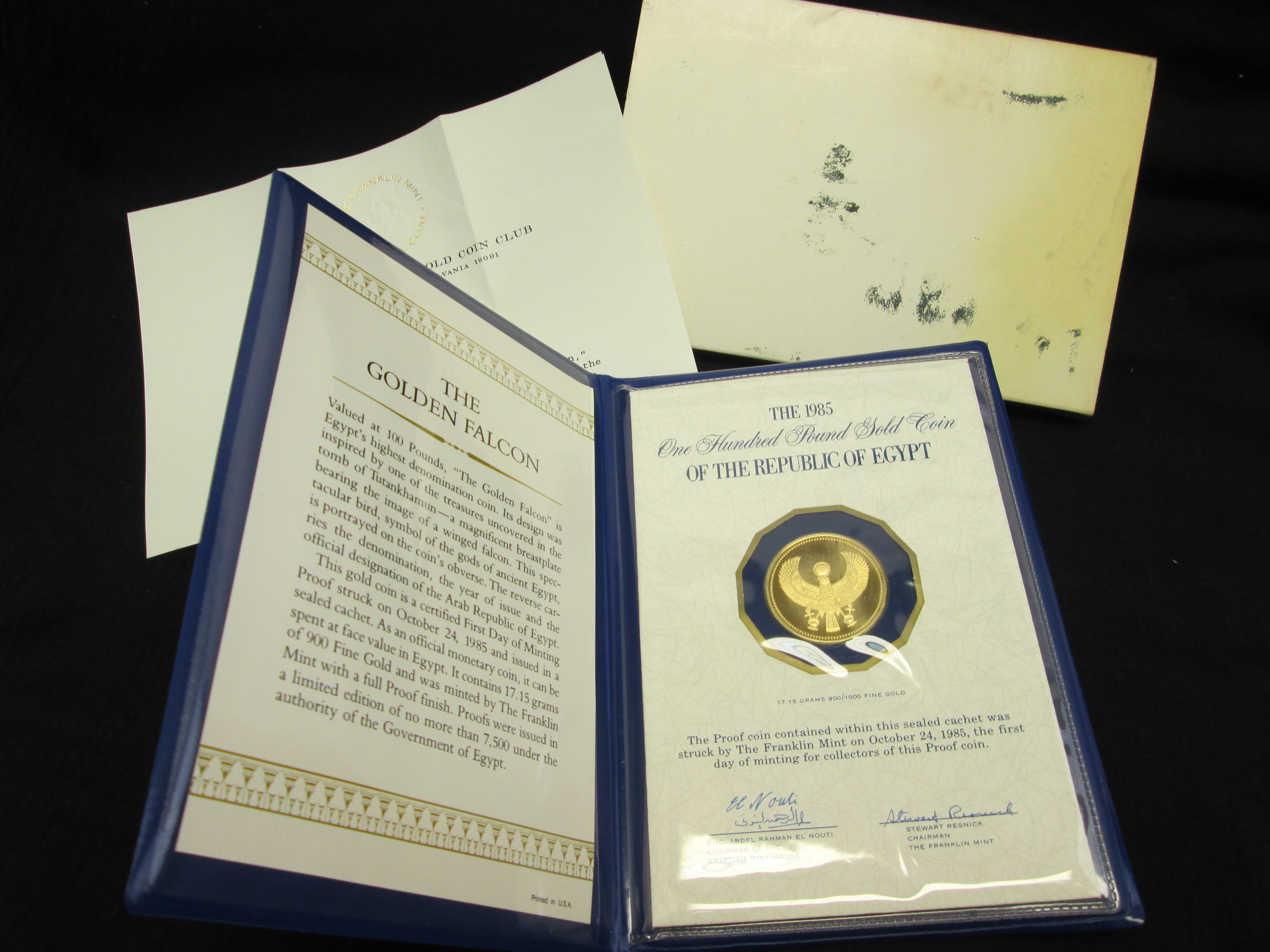 100 pound gold proof, 'The Golden Falcon', sealed within original cachet and housed in blue plastic wallet display. The coin is 17.15 grams of .900 fine gold. This gold coin is certified first day of minting October 24, 1985. Issued in a strictly limited edition of 7500 coins by The Franklin Mint under authority of the Government of Egypt.