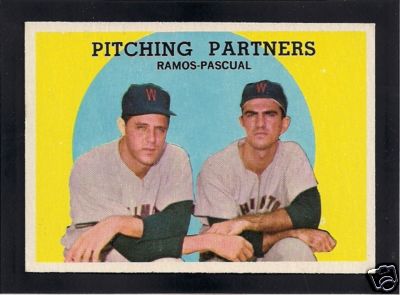 1959 Topps Baseball Card # 291 Pitching Partners (Camilo Pascual, Pedro Ramos)
