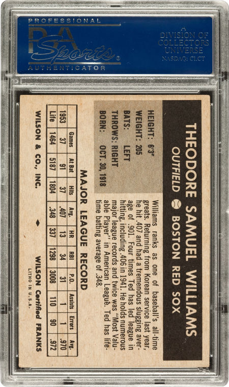 December 04, 2025 - 2 5/8" by 3 3/4" Unnumbered. Front: Colorized portraits, player's name, team and position at top, facsimile autograph and color image of package of Wilson Franks. Back: Personal biography, 1953 statistics and career statistics.