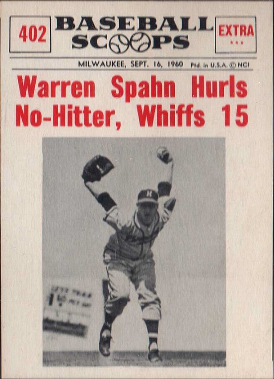 You have: 1961 Nu-Card Scoops Baseball Card #402 "Warren Spahn Hurls No-Hitter, Whiffs 15"