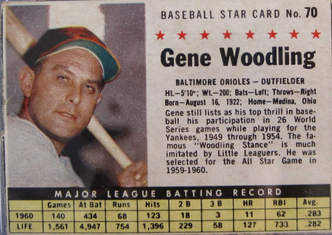 1961 Post Cereal Box Baseball Card #70 Gene Woodling (box)