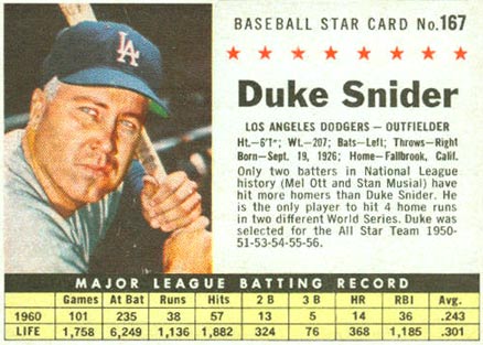 You have: 1961 Post Cereal Box Baseball Card #167b Duke Snider (company) (Hall of Fame)