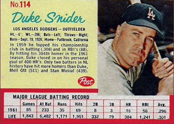 You have: 1962 Post Cereal Box Baseball Card #114 Duke Snider (Hall of Fame)