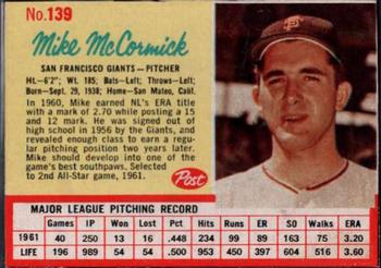 1962 Post Cereal Box Baseball Card #139 Mike McCormick