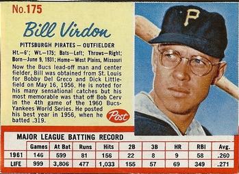 1962 Post Cereal Box Baseball Card #175 Bill Virdon