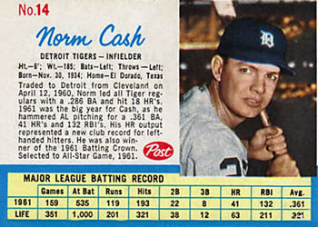 1962 Post Cereal Box Baseball Card #14b Norm Cash (throws left)