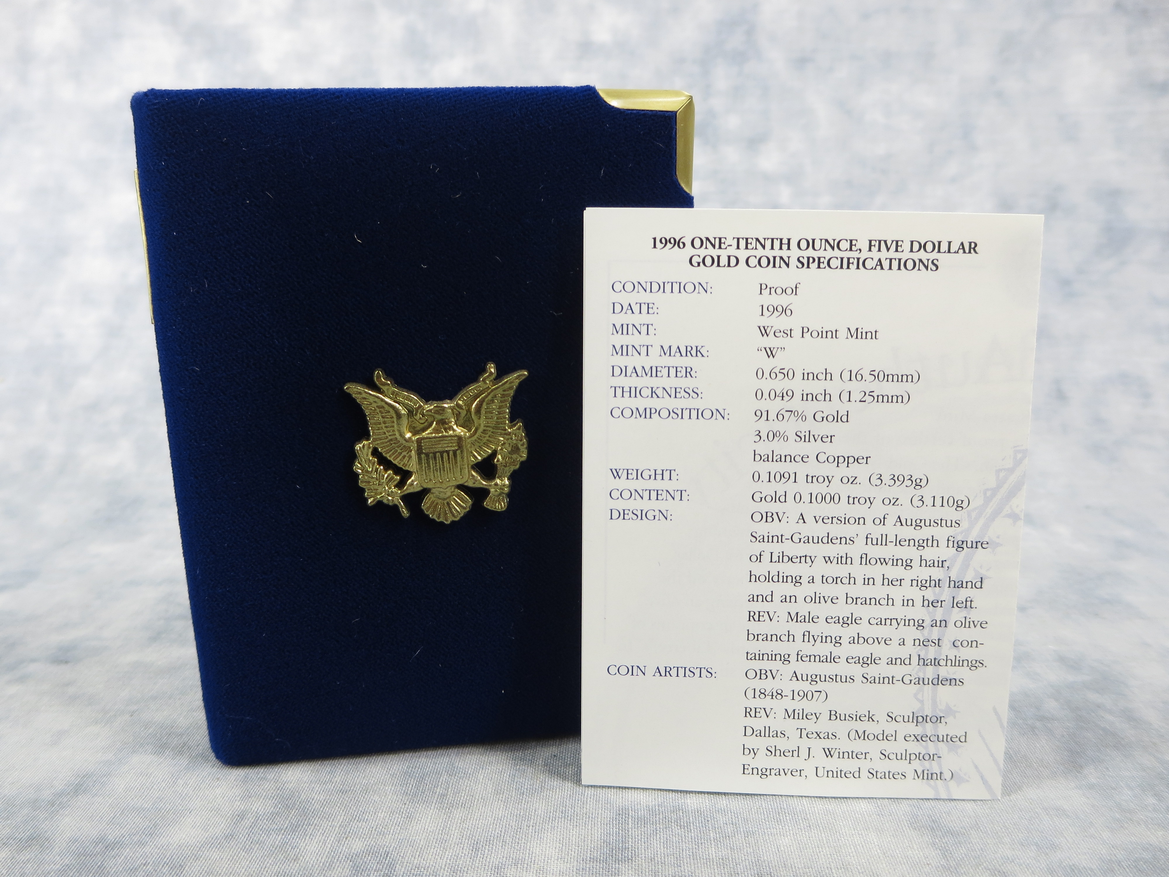 December 04, 2025 - Includes 91.6% gold $5 (West Point Mint) coin proof housed in a US mint felt-lined display, with certificate of authenticity and US Mint box.