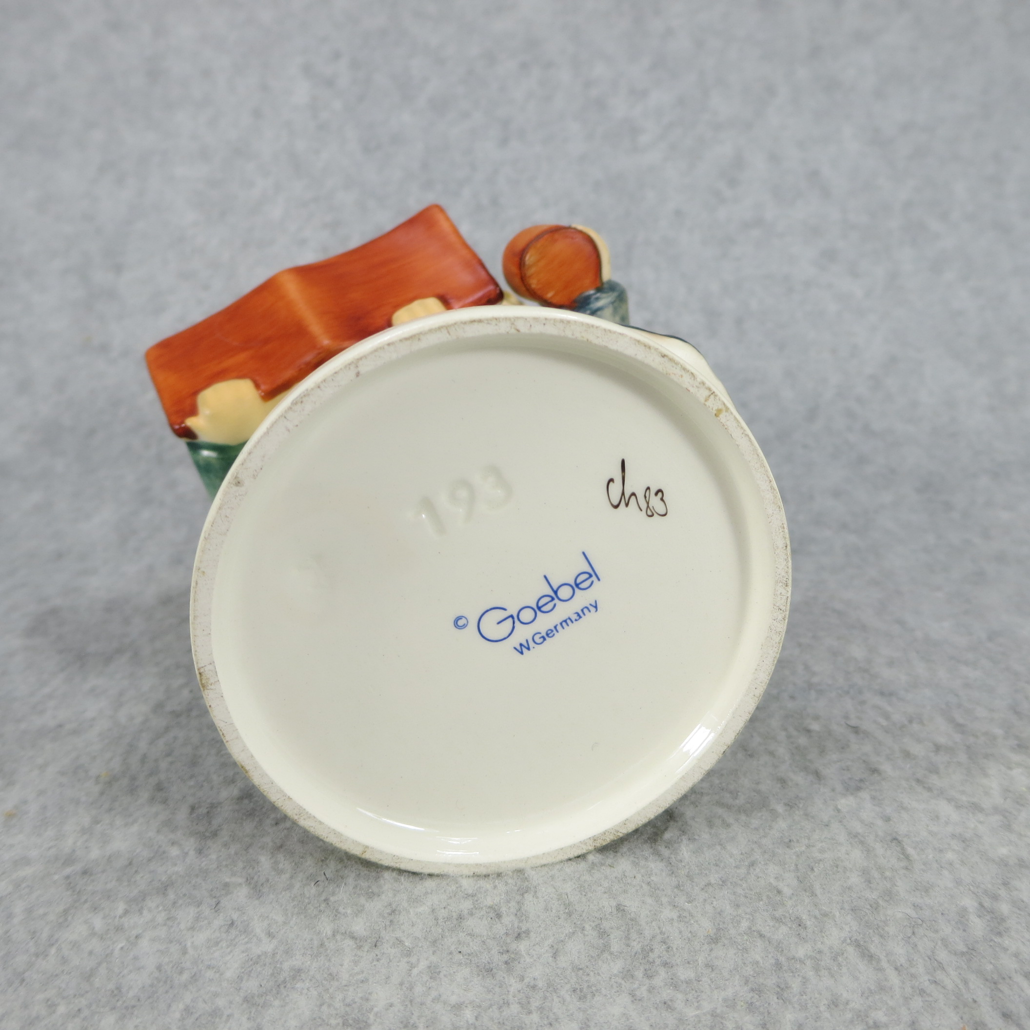 February 03, 2026 - 5-1/4 inches tall. Base is incised 193. Goebel TMK 6 trademark imprinted in blue on bottom of base. Artist hand initialed and dated in black ink.