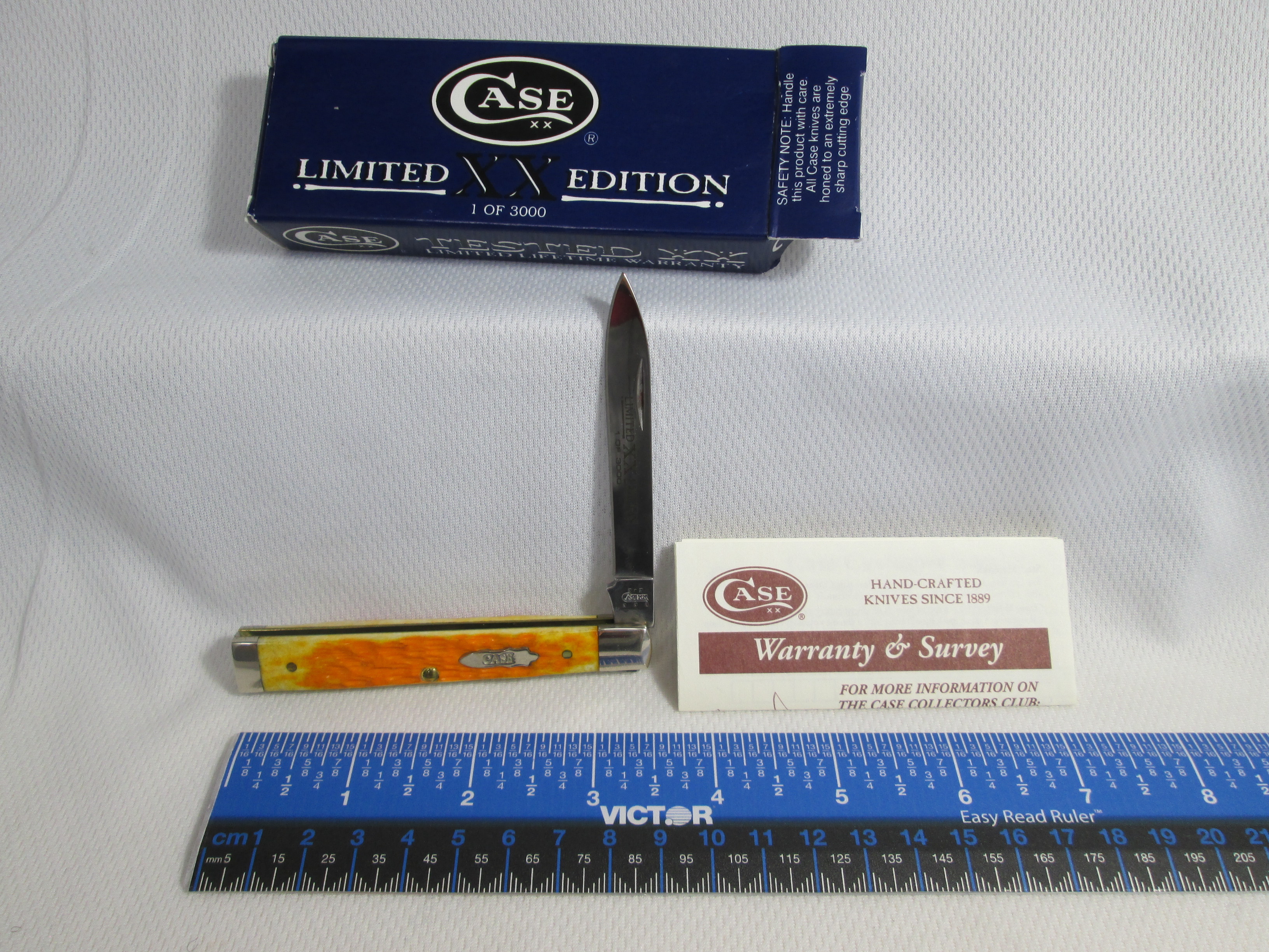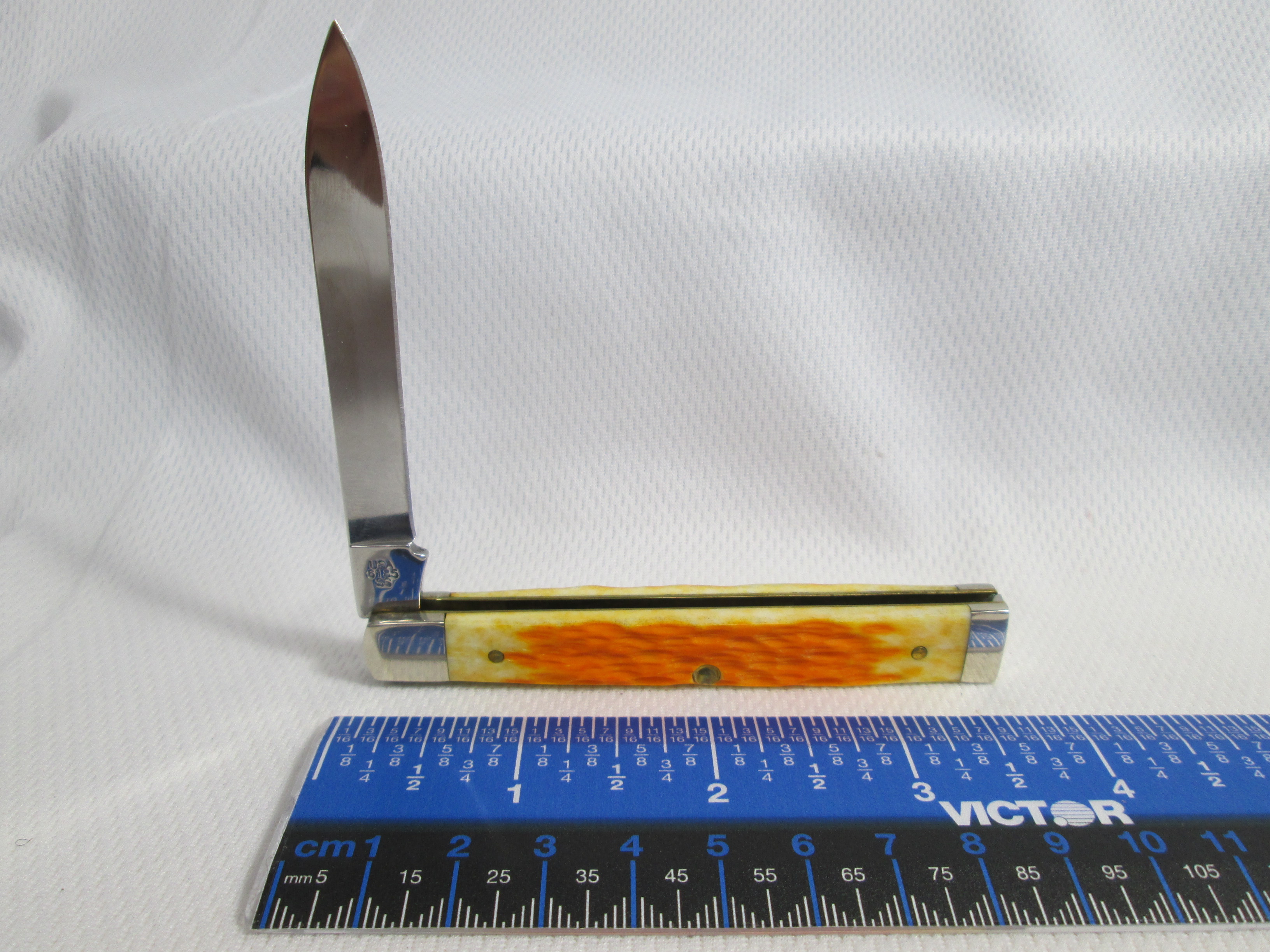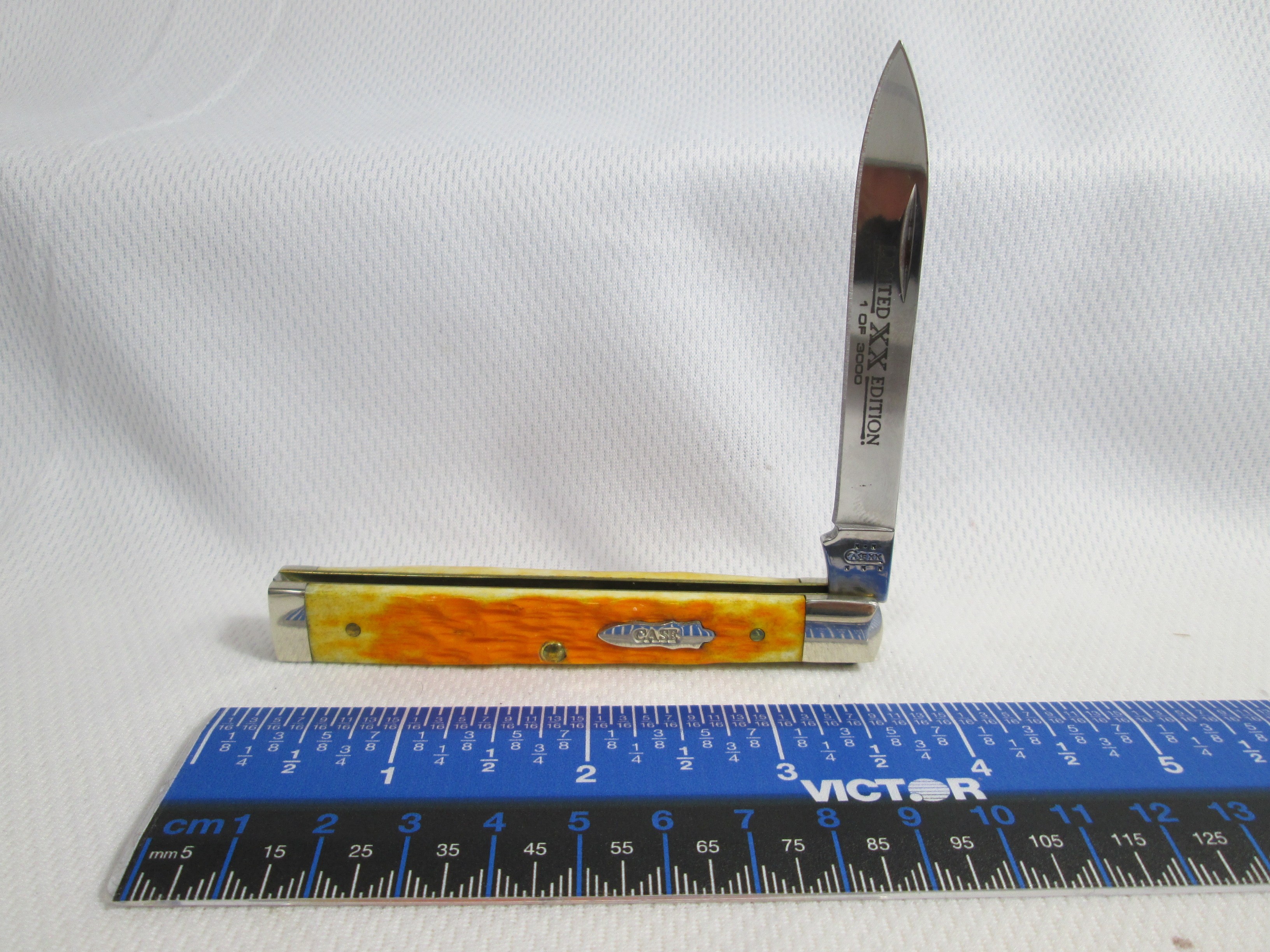 October 26, 2025 - 3-5/8 inches closed. 6-3/4 inches open. Made in USA. Front Tang: x*x CASE XX x x x (Longtail-C, Lightning Bolt S) ; Rear Tang: USA 6185 SS. CASE Bomb shield. Stainless Steel blade. Front Blade 1 etch: LIMITED XX EDITION 1 OF 3000. Orange Peel Jigged Bone handle. Nickel Silver bolsters. Brass liner.