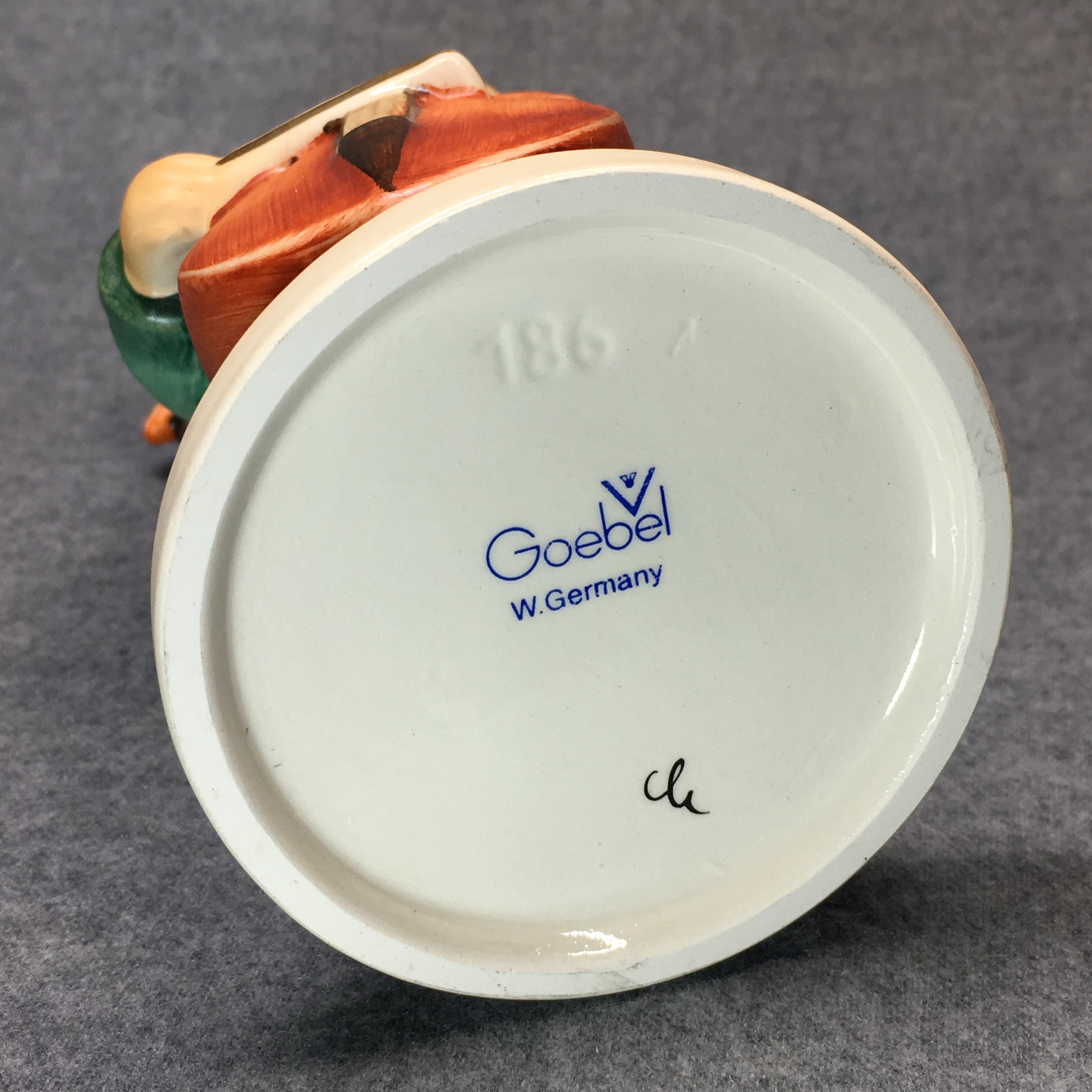 March 16, 2026 - 5 inches tall. Base is incised 186. Goebel TMK 5 trademark imprinted in blue on bottom of base. Artist hand initialed in black ink.