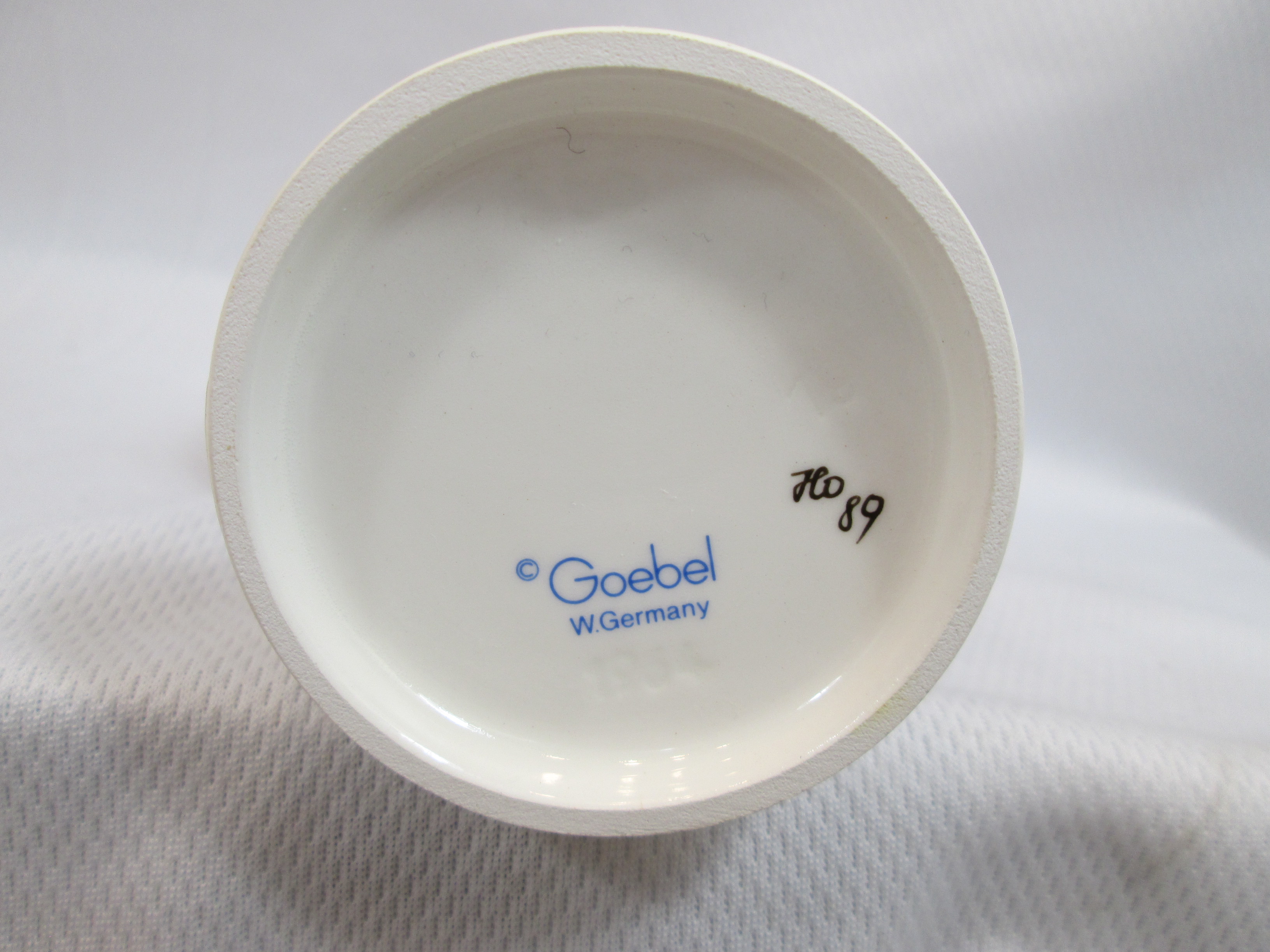 February 03, 2026 - 4 3/4 inches tall. Base is incised 355 and 1964. Goebel TMK 6 trademark imprinted in blue on bottom of base. Painter hand-initialed and dated in black ink on bottom of base.