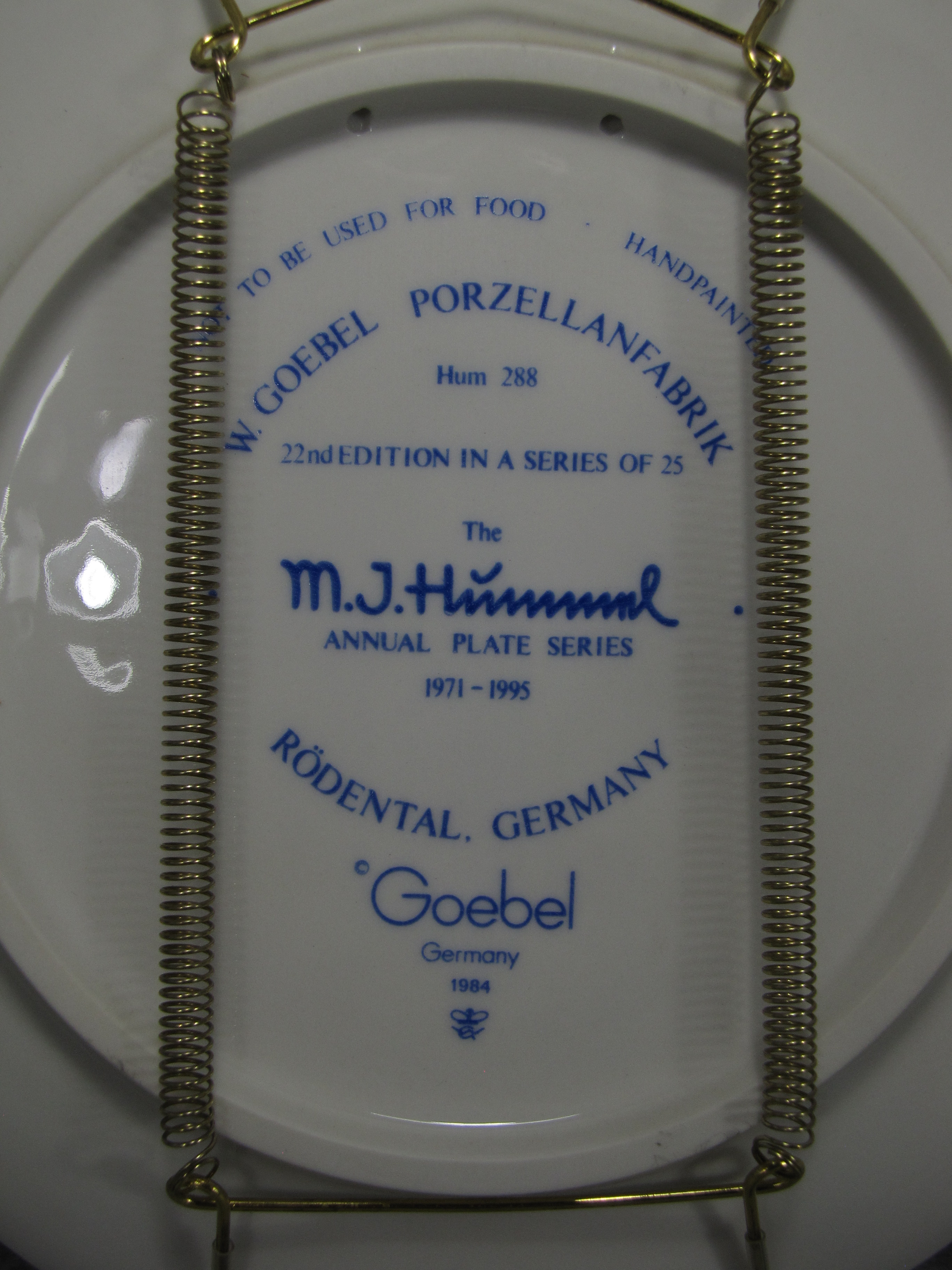 April 05, 2026 - 7-1/2 inches in diameter. The following is imprinted in blue on the bottom of the base: Hum 288, Goebel TMK 7 trademark, HANDPAINTED, W. GOEBEL PORZELLANFABRIK, RODENTAL, GERMANY, 22ND EDITION IN A SERIES OF 25, THE M.I. HUMMEL ANNUAL PLATE SERIES 1971-1995