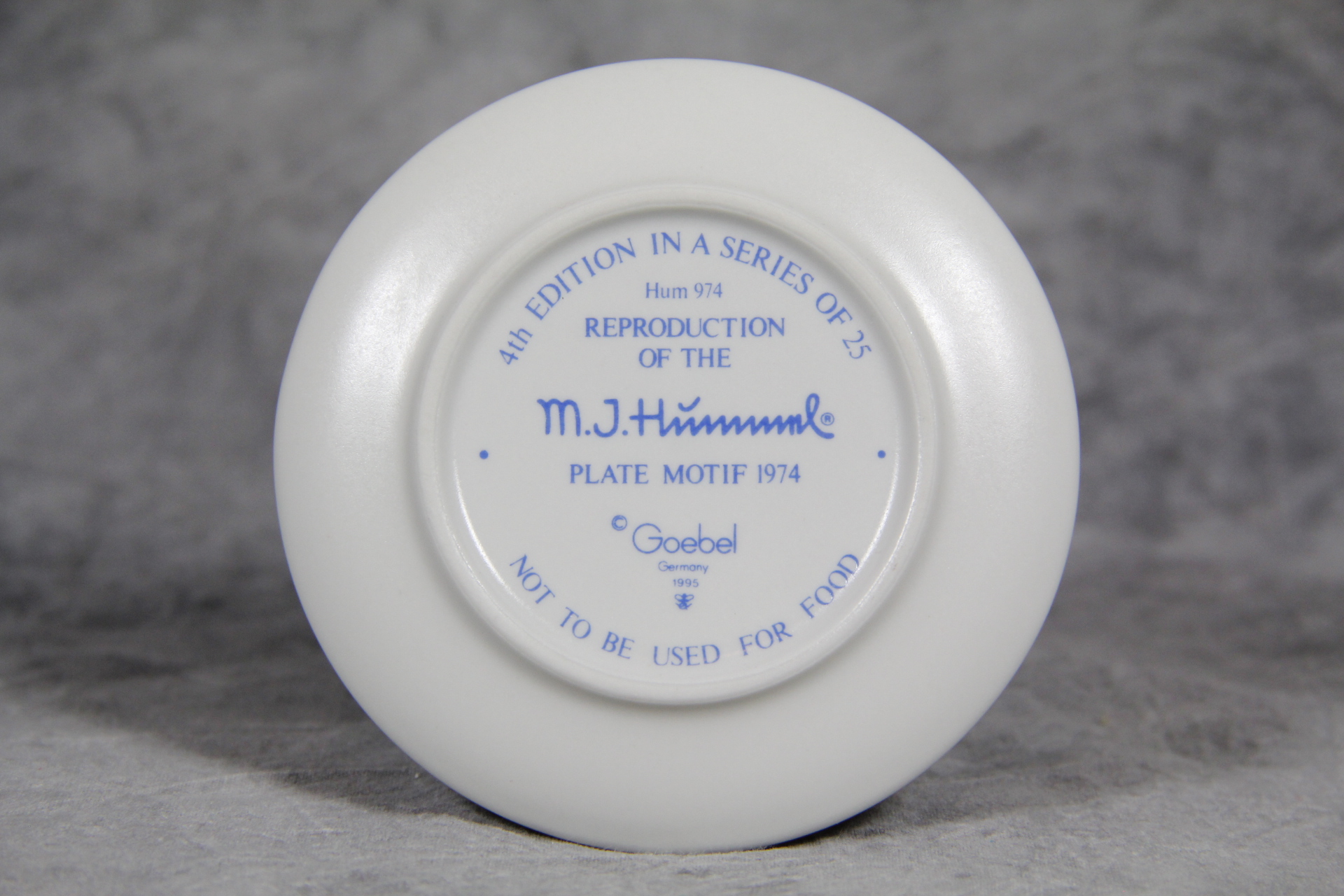 April 25, 2026 - 3-1/4 inches in diameter. The following is imprinted in blue on bottom of plate: Goebel TMK 7 trademark, '4th Edition in a series of 25, Hum 974, Reproduction of the M.I. Hummel Plate Motif 1974'.