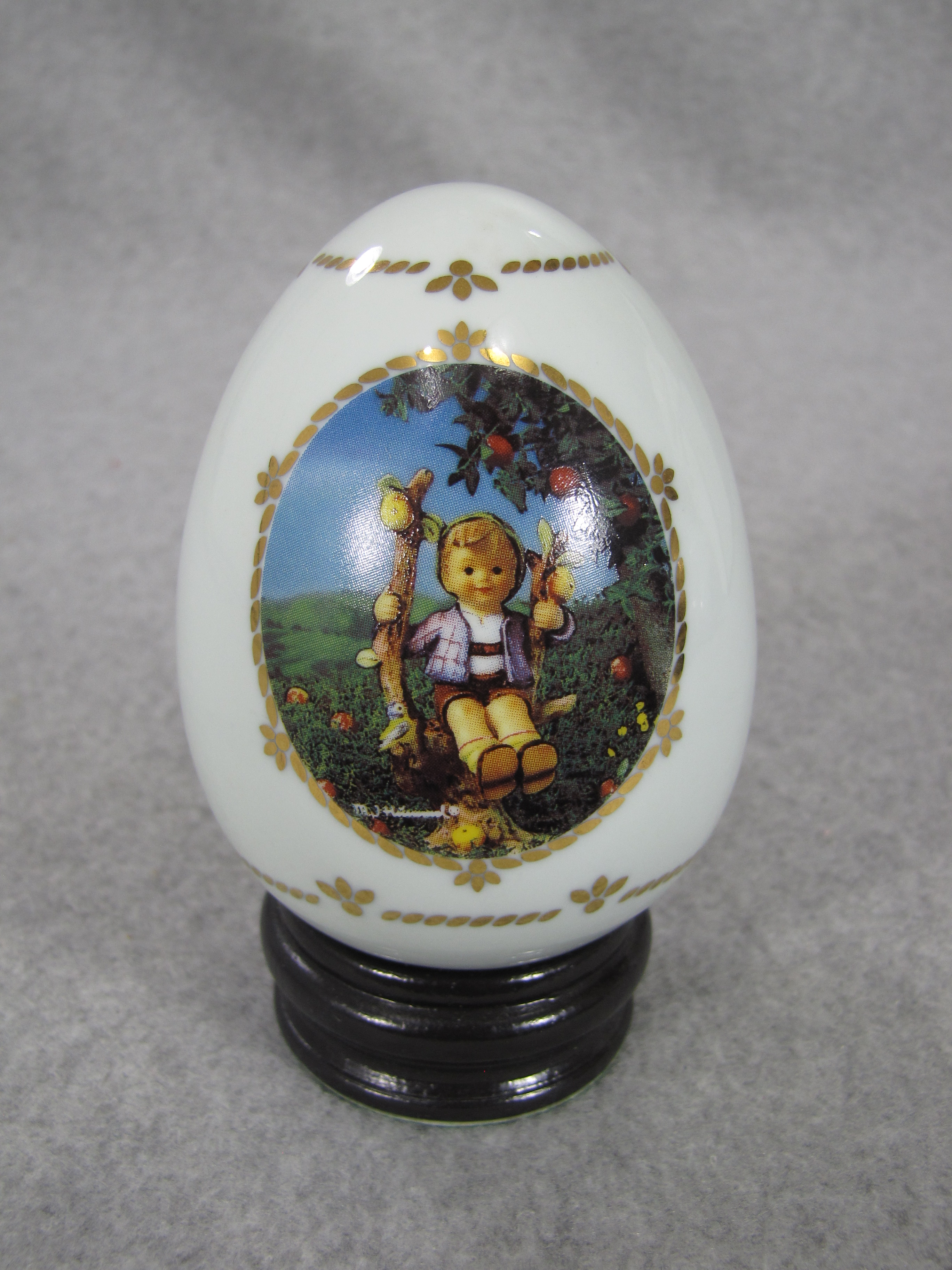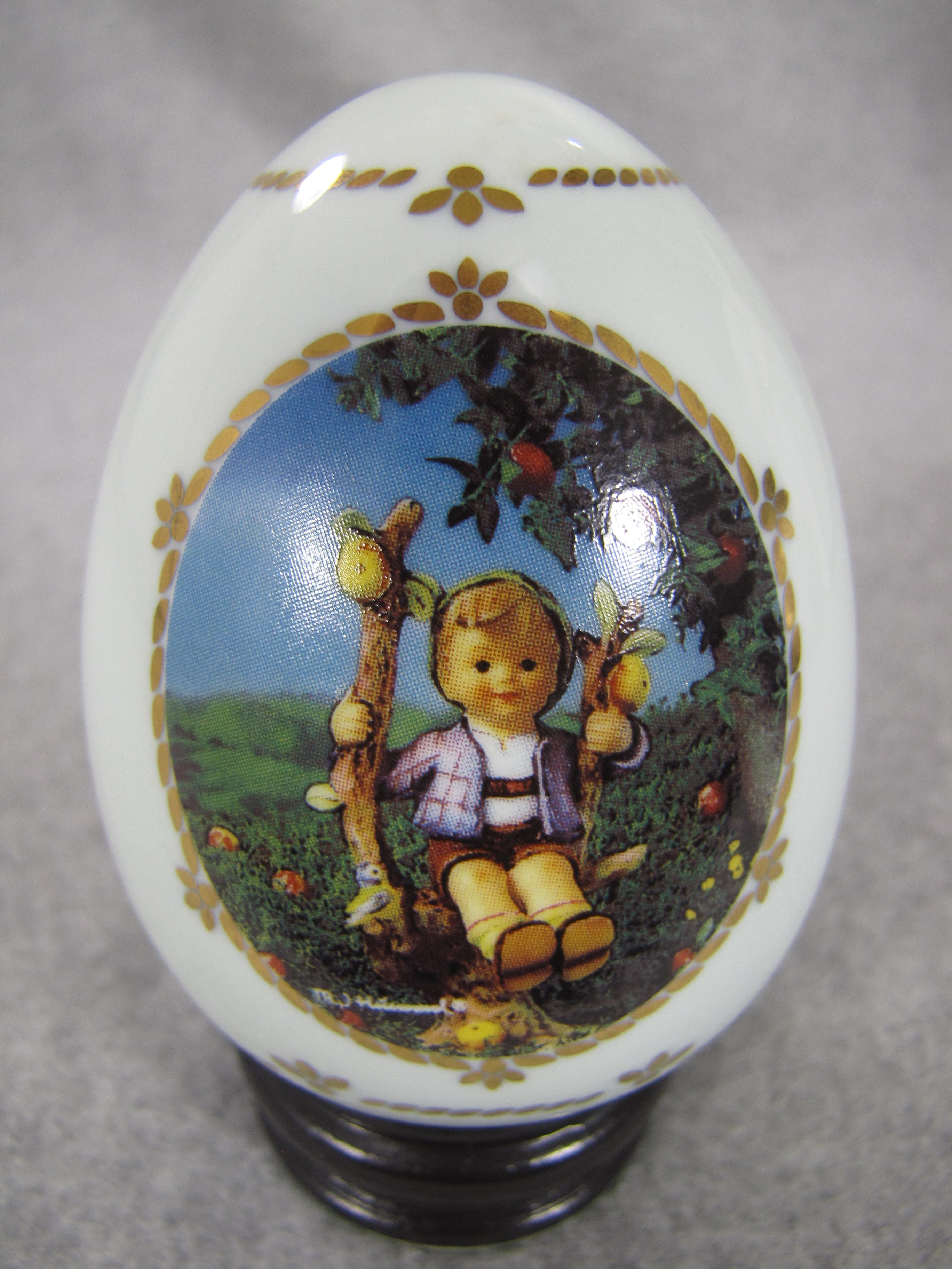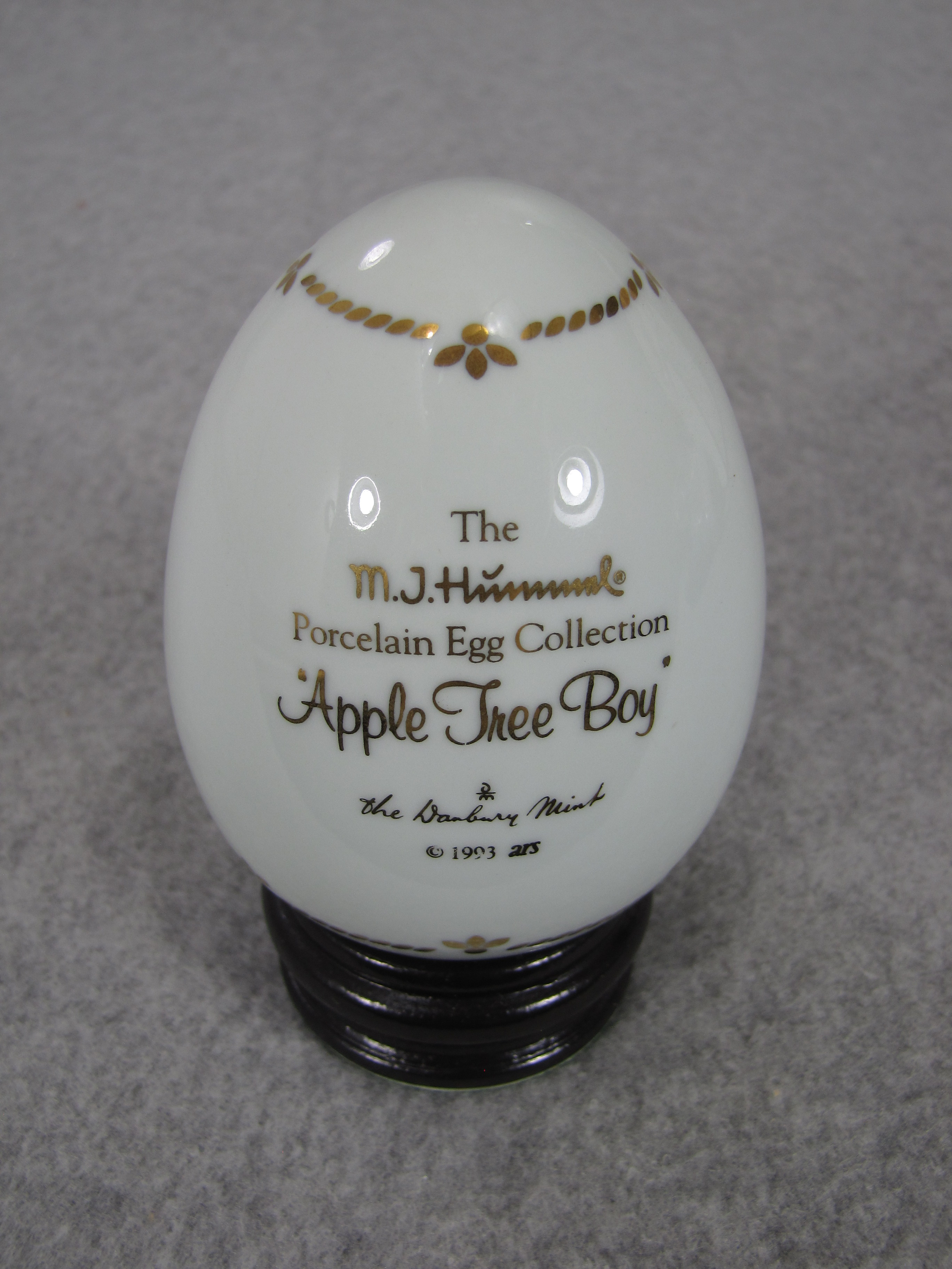 February 23, 2026 - 3-1/2 inches tall (4-1/4 inches tall with included base). From the M.I. Hummel Porcelain Egg Collection, titled "Apple Tree Boy". 'The Danbury Mint © 1993 ARS' is imprinted on back of egg in gold.