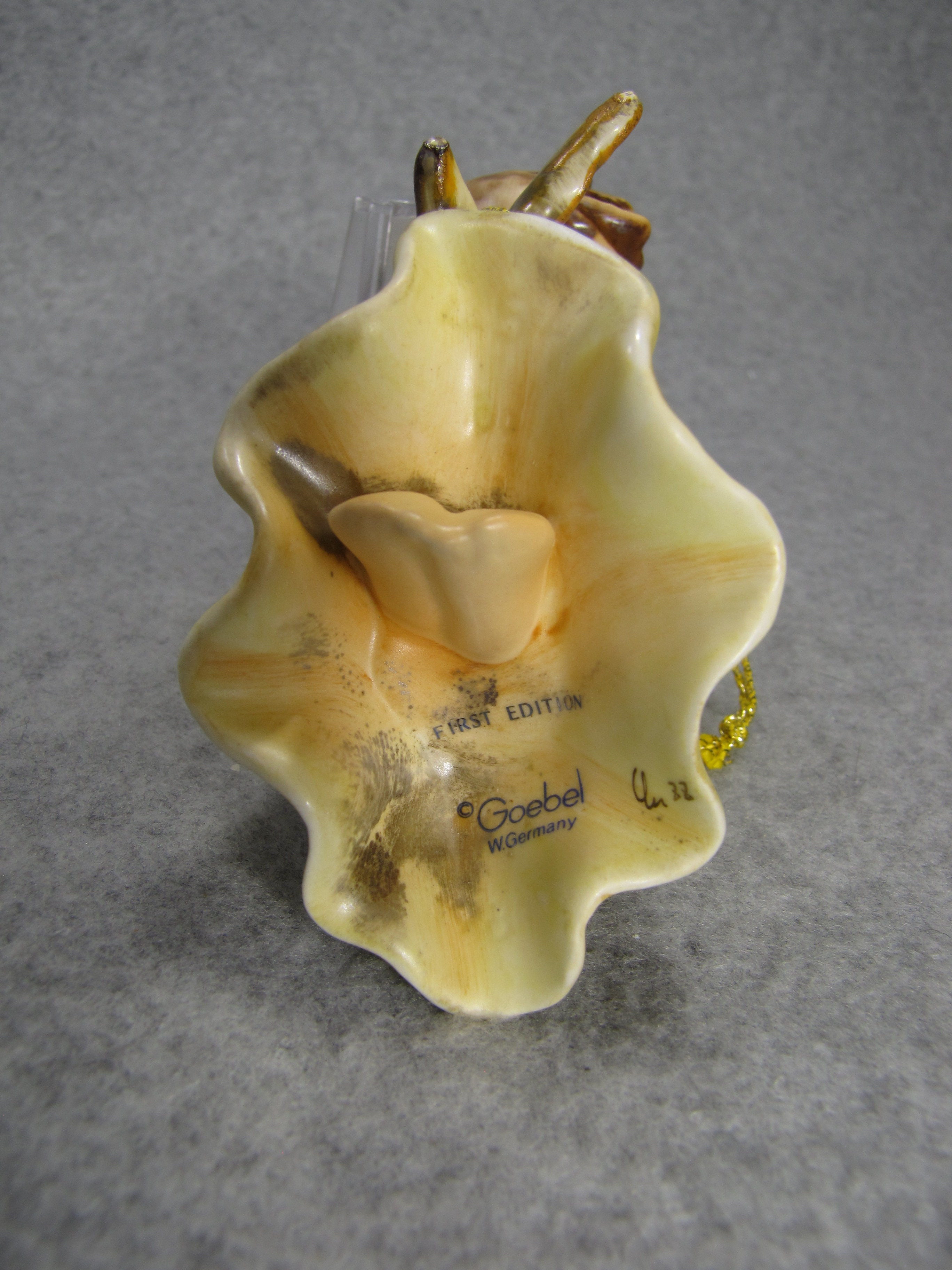February 23, 2026 - 3 inches tall by 4 1/4 inches wide. Side is stamped with '1988'. Goebel TMK 6 trademark imprinted in blue on end of figurine. Artist hand initialed and dated in black ink. Comes with original box, outer sleeve and COA.
