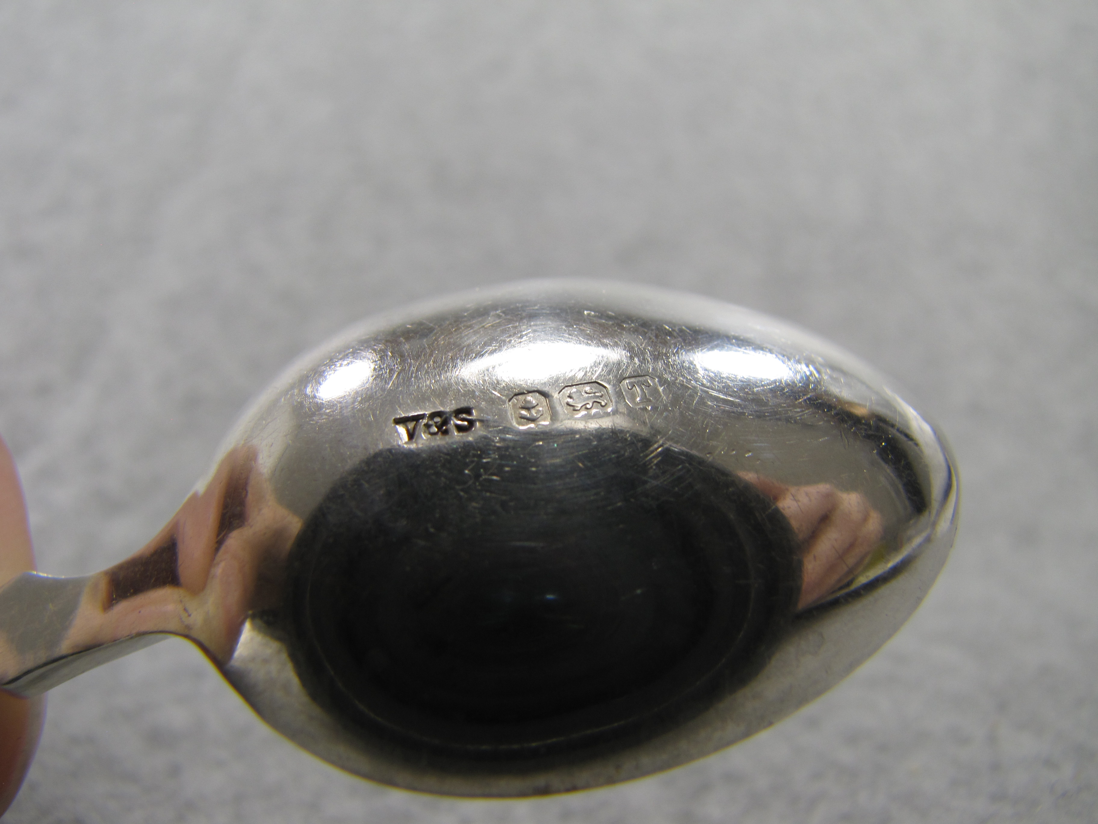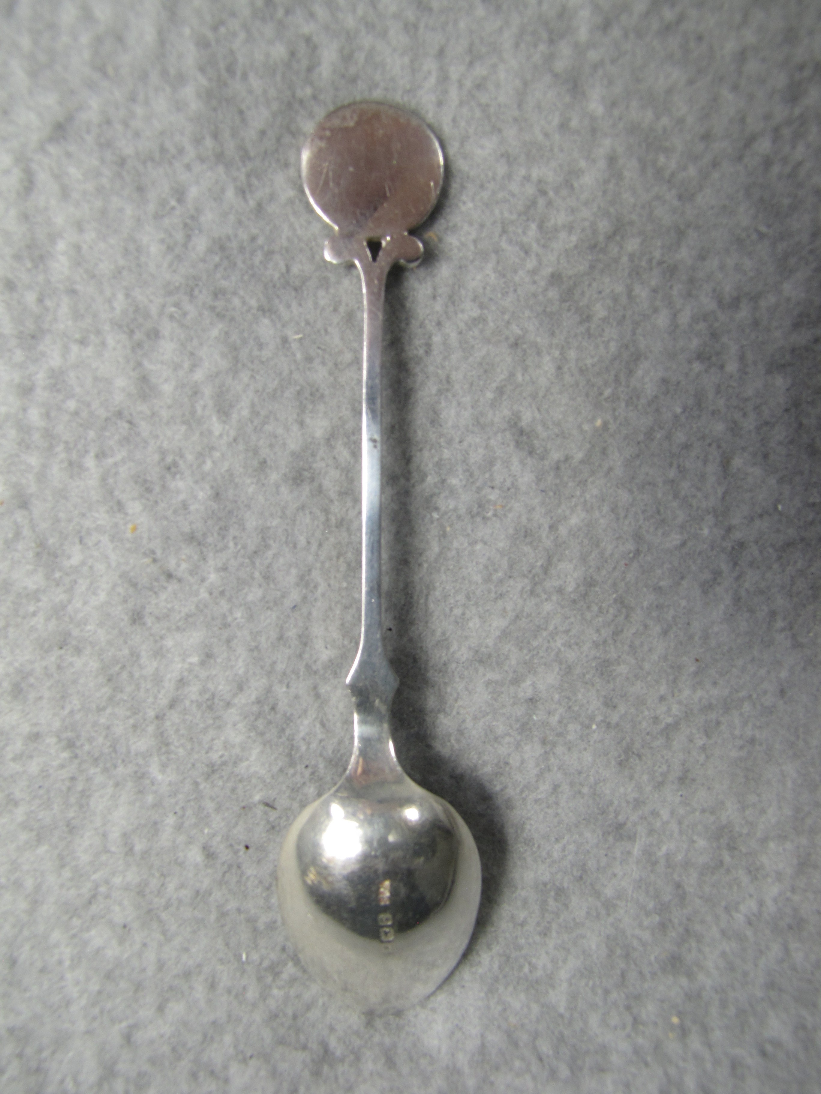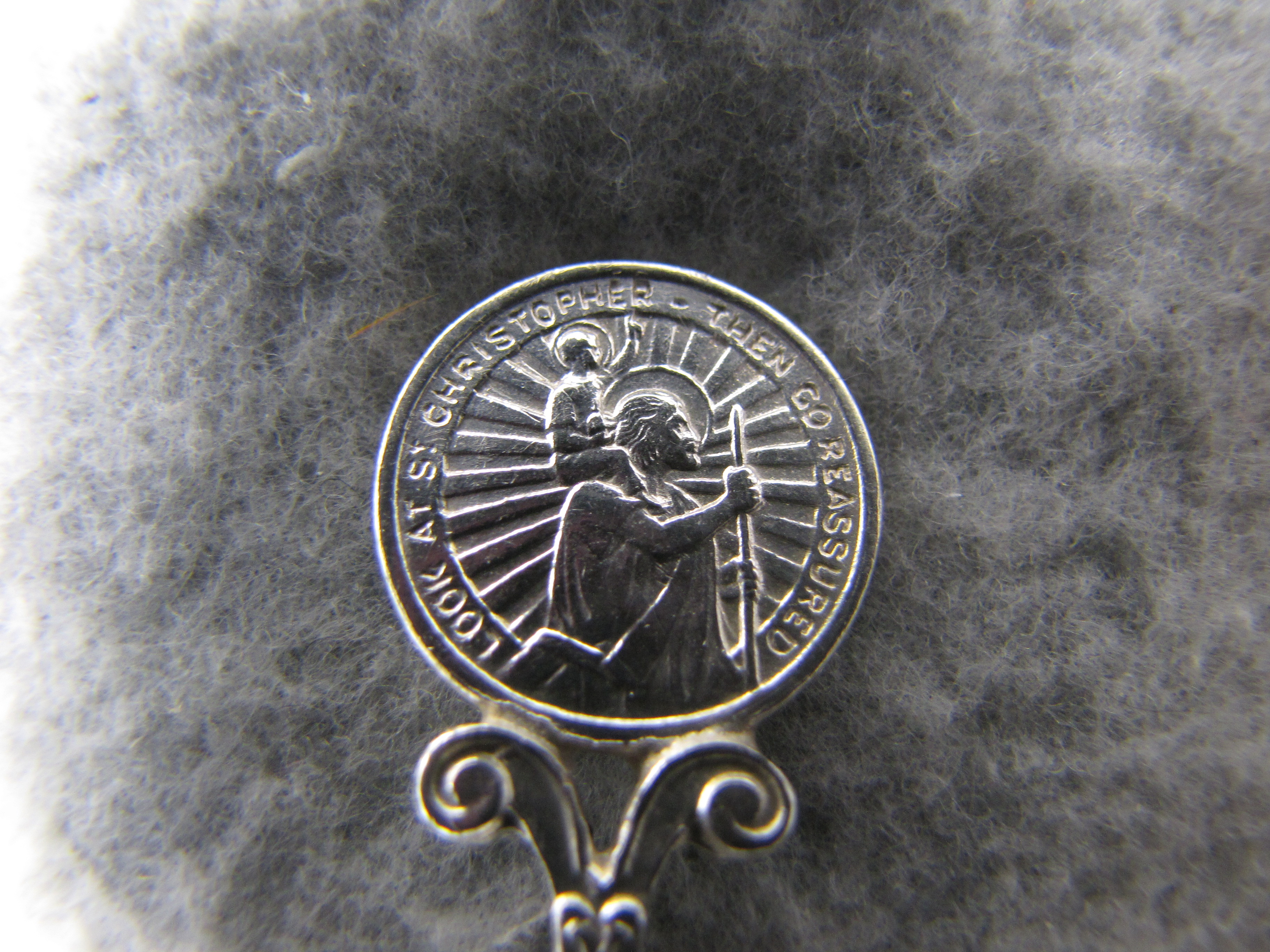 December 04, 2025 - Solid Sterling Silver. Raised relief of St. Christopher on the top of the handle which reads, 'Look at St. Christopher - Then go reassured.' Vaughton & Son's backstamp with the lion and anchor hallmarks on the back of the spoon.