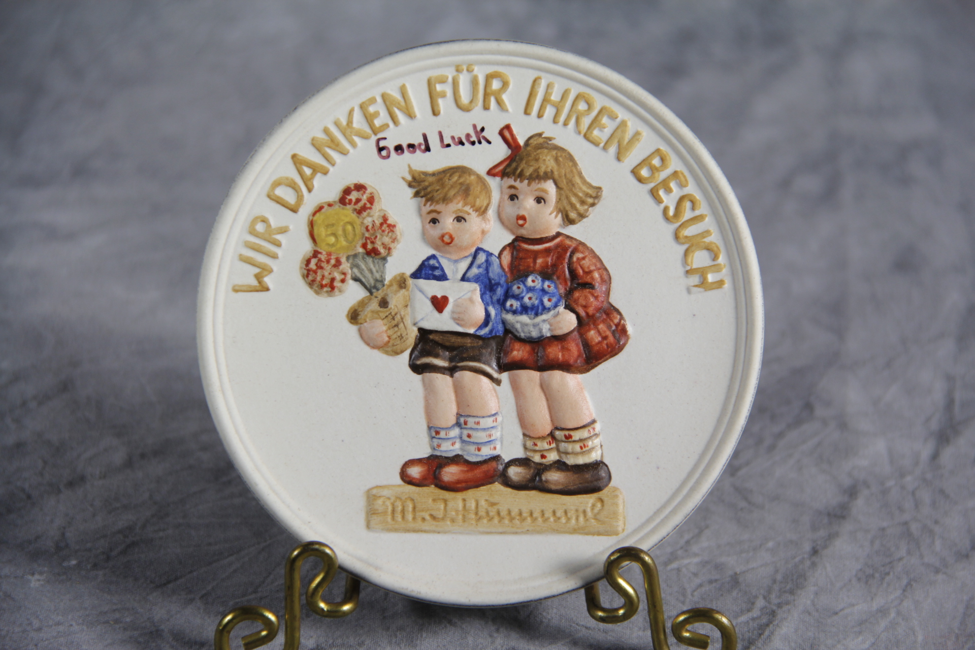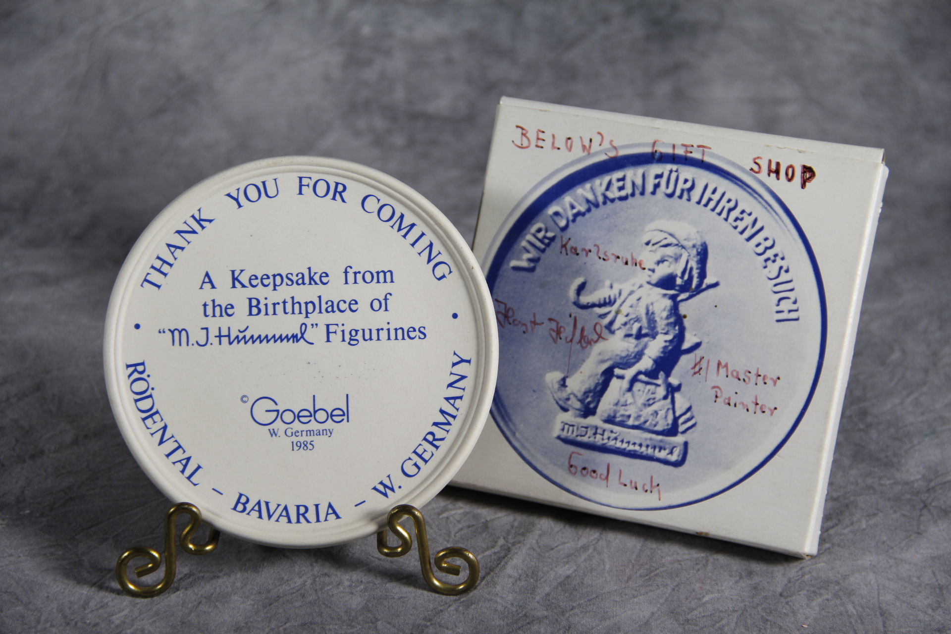 October 28, 2025 - 4 inches in diameter. Front is embossed 'Wir Danken Fur Ihren Besuch' (translates 'Thank You For Your Visit') and a hand-painted image of the special limited edition Hummel figurine entitled Jubilee (Hummel 416). The following is imprinted in blue on back of plaque: The Goebel TMK 6, 1985, 'Thank You For Coming - Rodental - Bavaria - W. Germany'; and 'A Keepsake from the Birthplace of M.I. Hummel Figurines'.