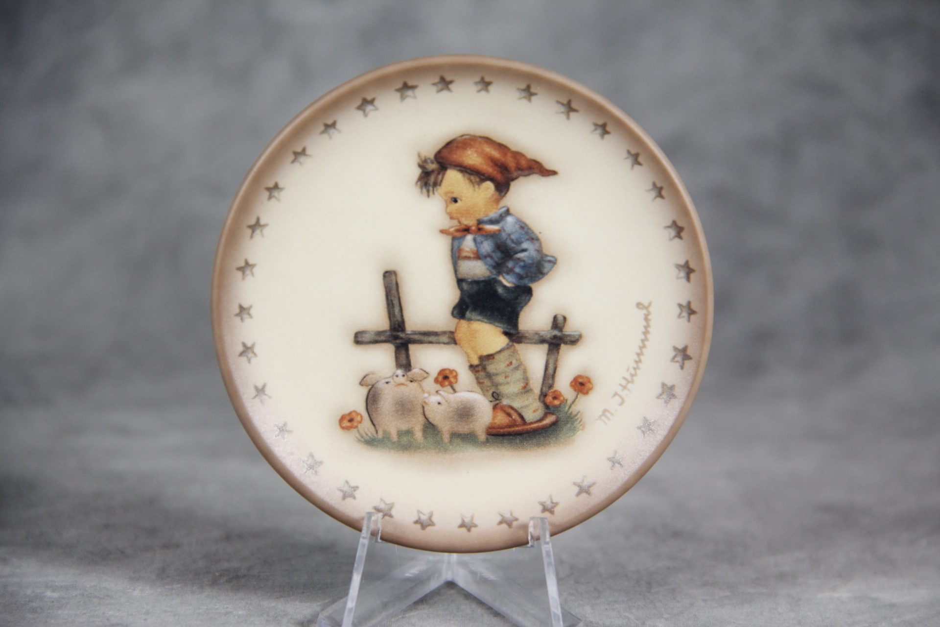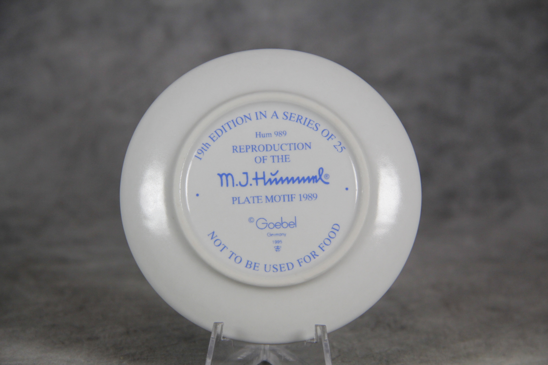 April 05, 2026 - 3-1/4 inches in diameter. The following is imprinted in blue on bottom of plate: Goebel TMK 7 trademark, '19th Edition in a series of 25, Hum 989, Reproduction of the M.I. Hummel Plate Motif 1989'.