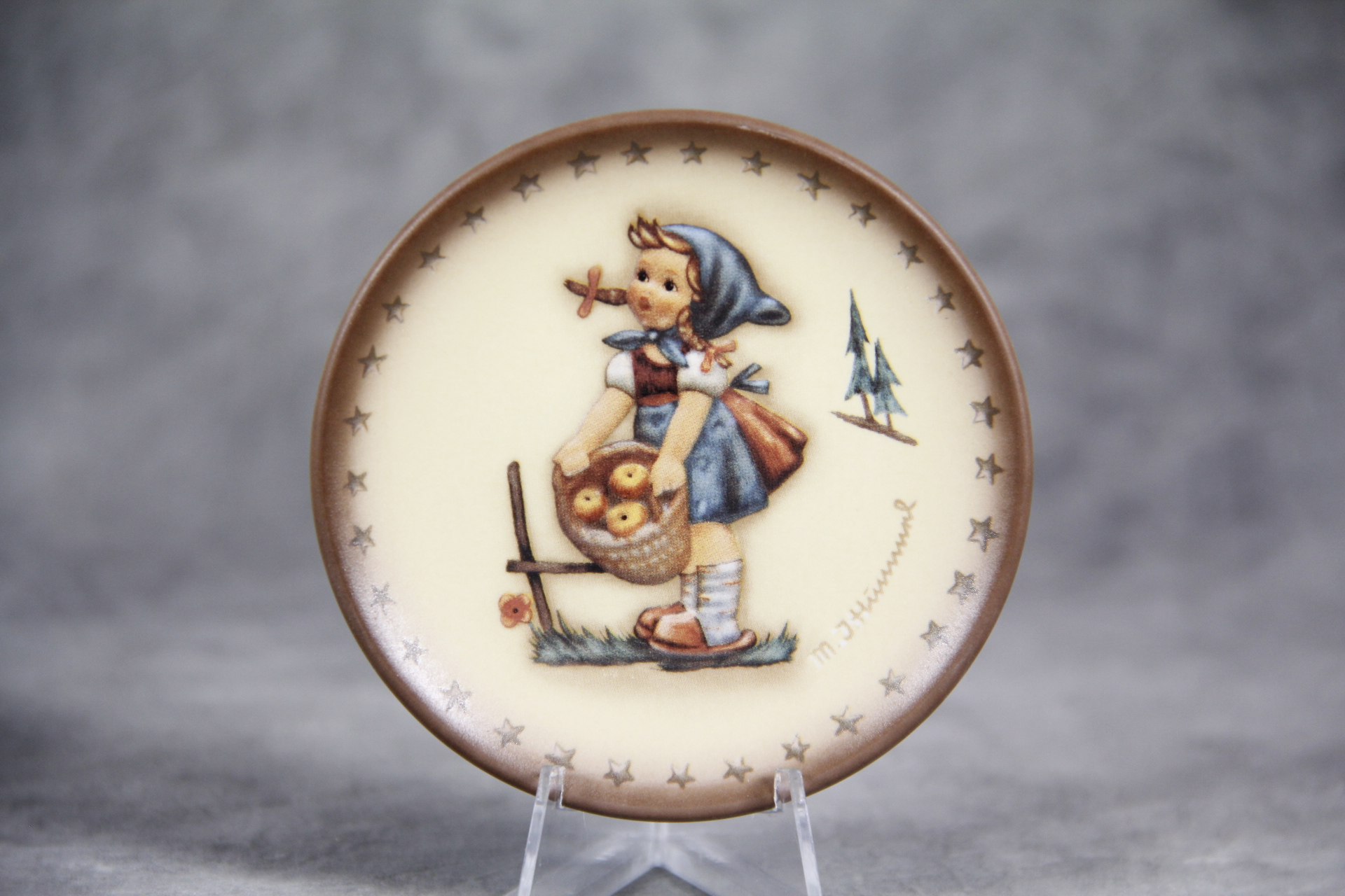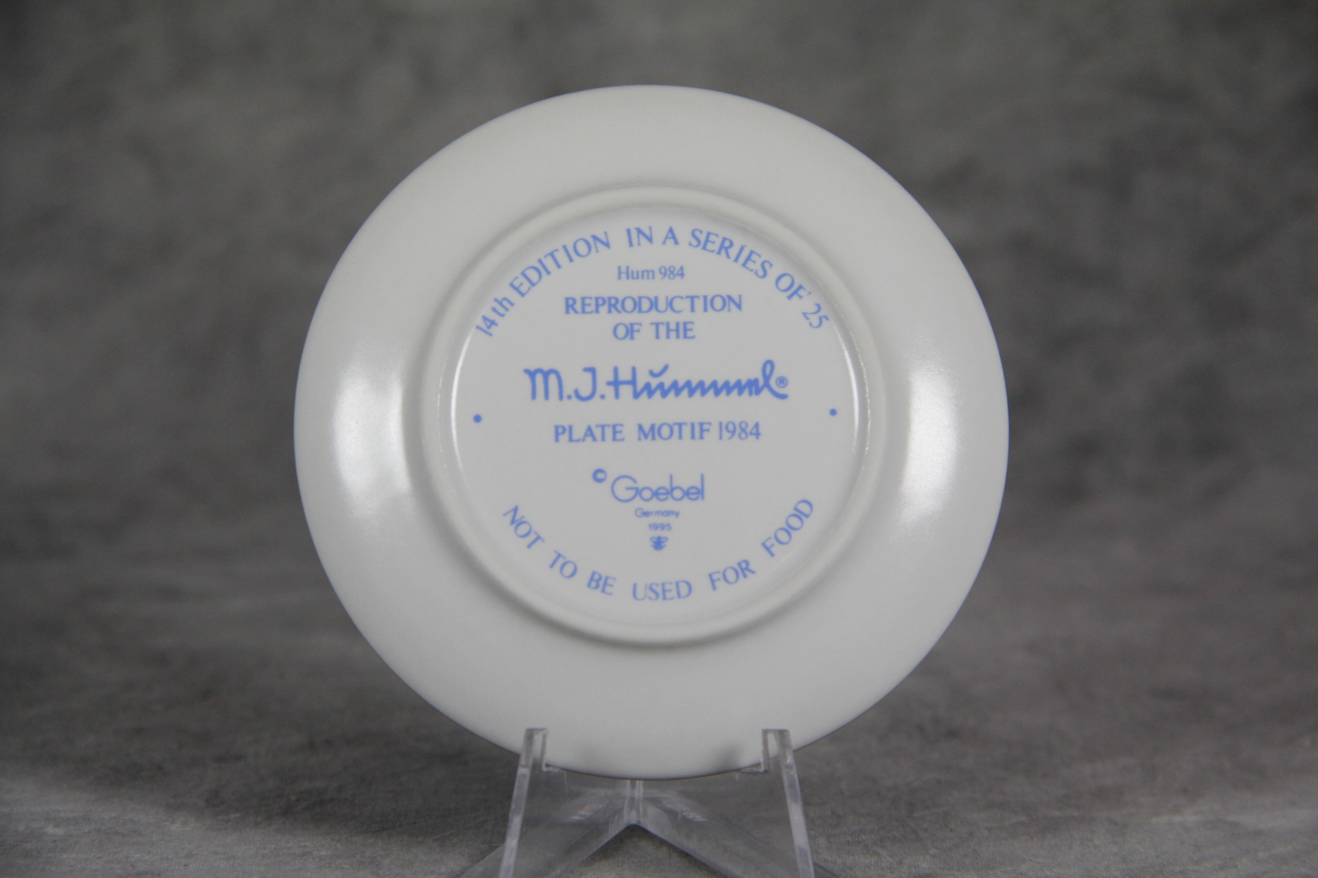 October 28, 2025 - 3-1/4 inches in diameter. The following is imprinted in blue on bottom of plate: Goebel TMK 7 trademark, '14th Edition in a series of 25, Hum 984, Reproduction of the M.I. Hummel Plate Motif 1984'.