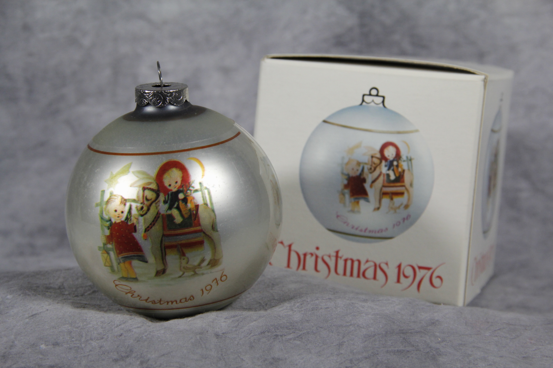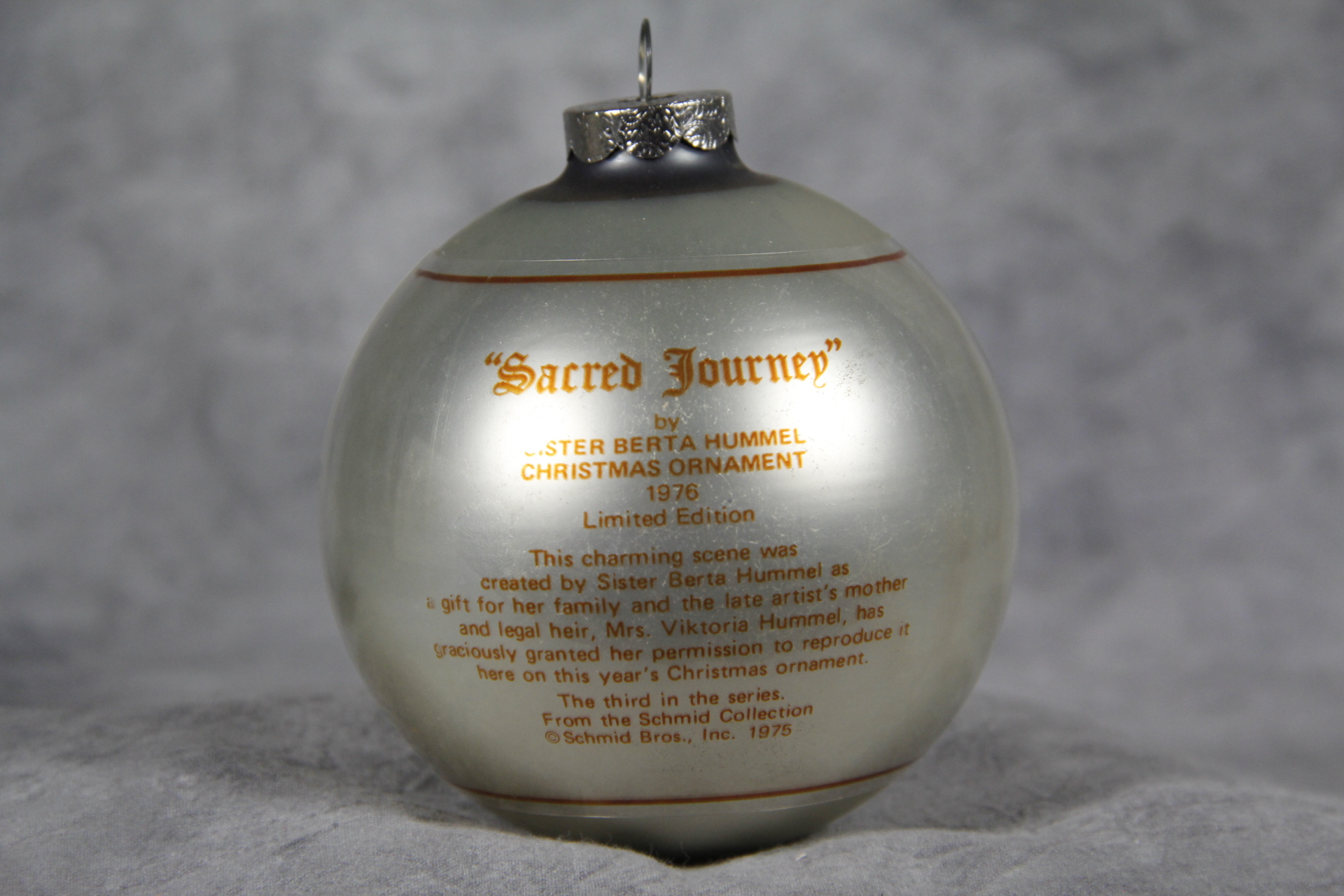 April 05, 2026 - 3 inches in diameter. Ornament reads '"Sacred Journey" by Sister Berta Hummel Christmas Ornament 1976  Limited Edition'. Third in The Collector Series portraying the authentic works of Sister Berta Hummel. (c) Schmid Bros. Inc. 1975.