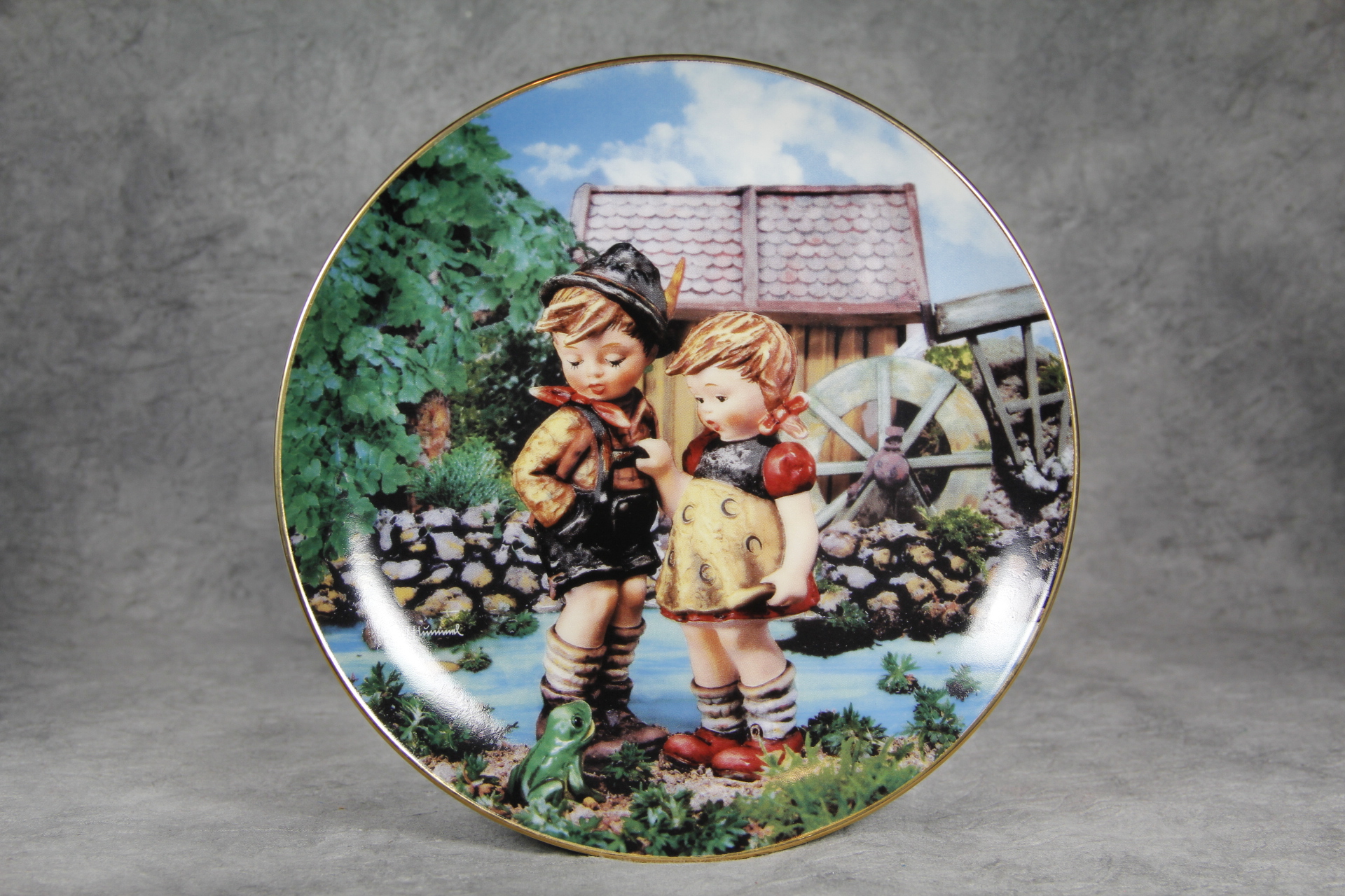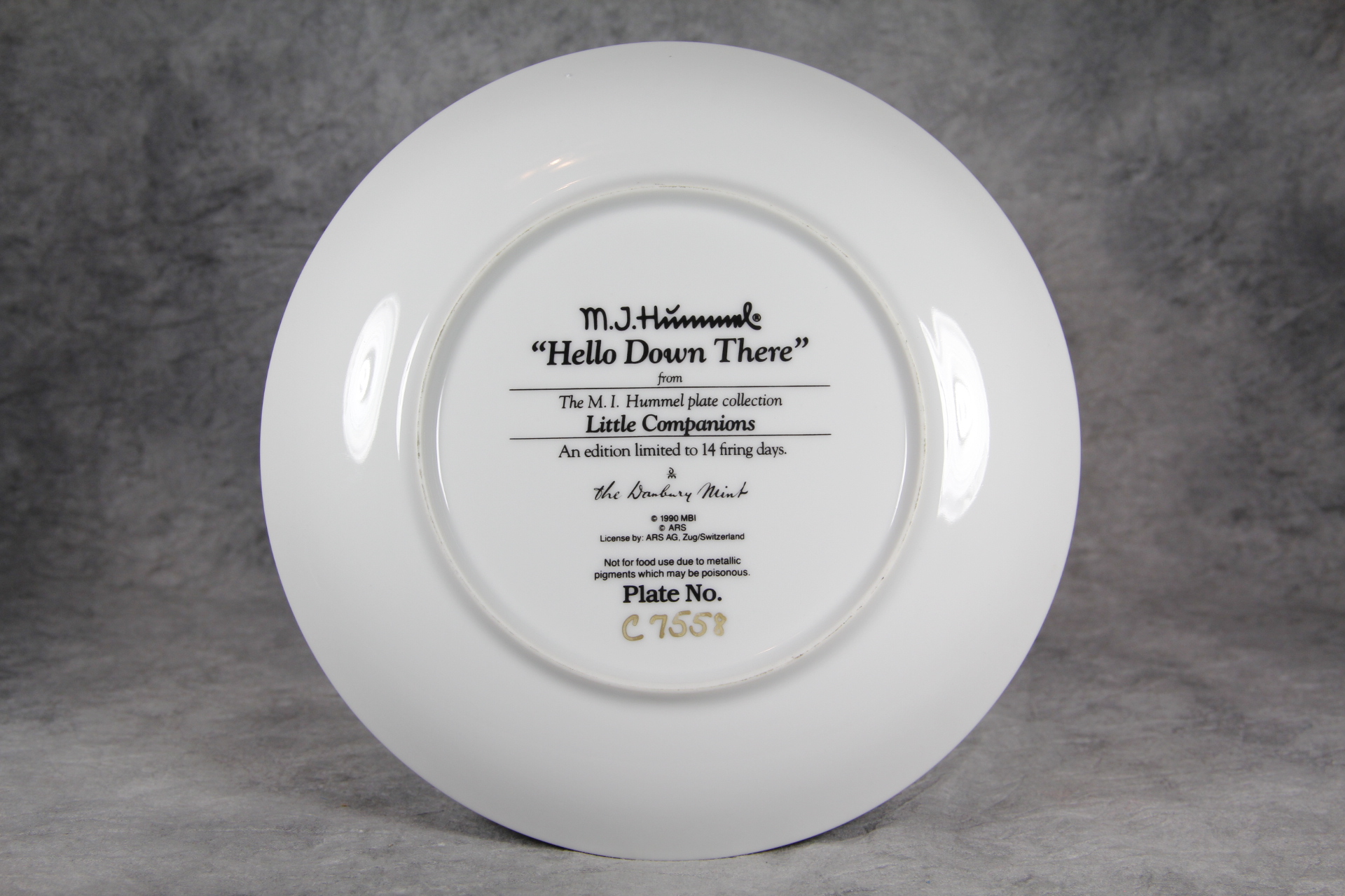 March 16, 2026 - 8-1/8 inches in diameter. Trimmed in 23kt gold. Created exclusively for the Danbury Mint as part of a limited edition. The following is imprinted in black on bottom of plate: 'M.I. Hummel "Hello Down There" from The M.I. Hummel plate collection "Little Companions"; An edition limited to 14 firing days; The Danbury Mint; (c) 1990 MBI; (c) ARS; License by ARS AG, Zug/Switzerland'. The Plate No. _____ is hand-written in gold. In original box.