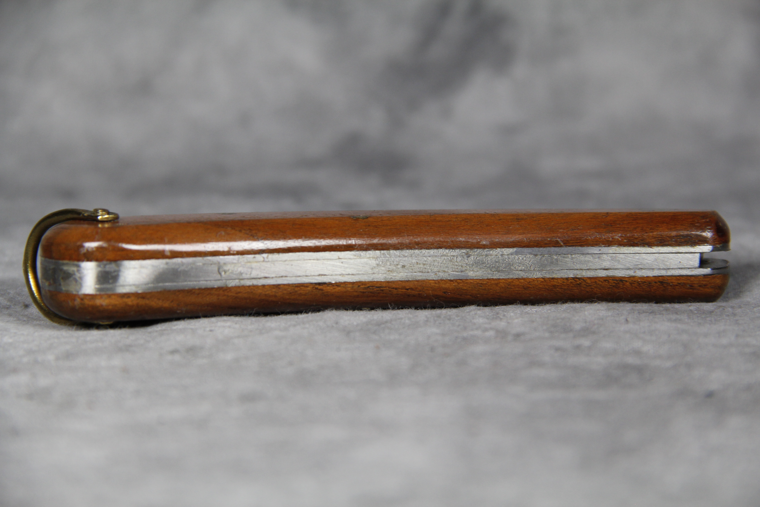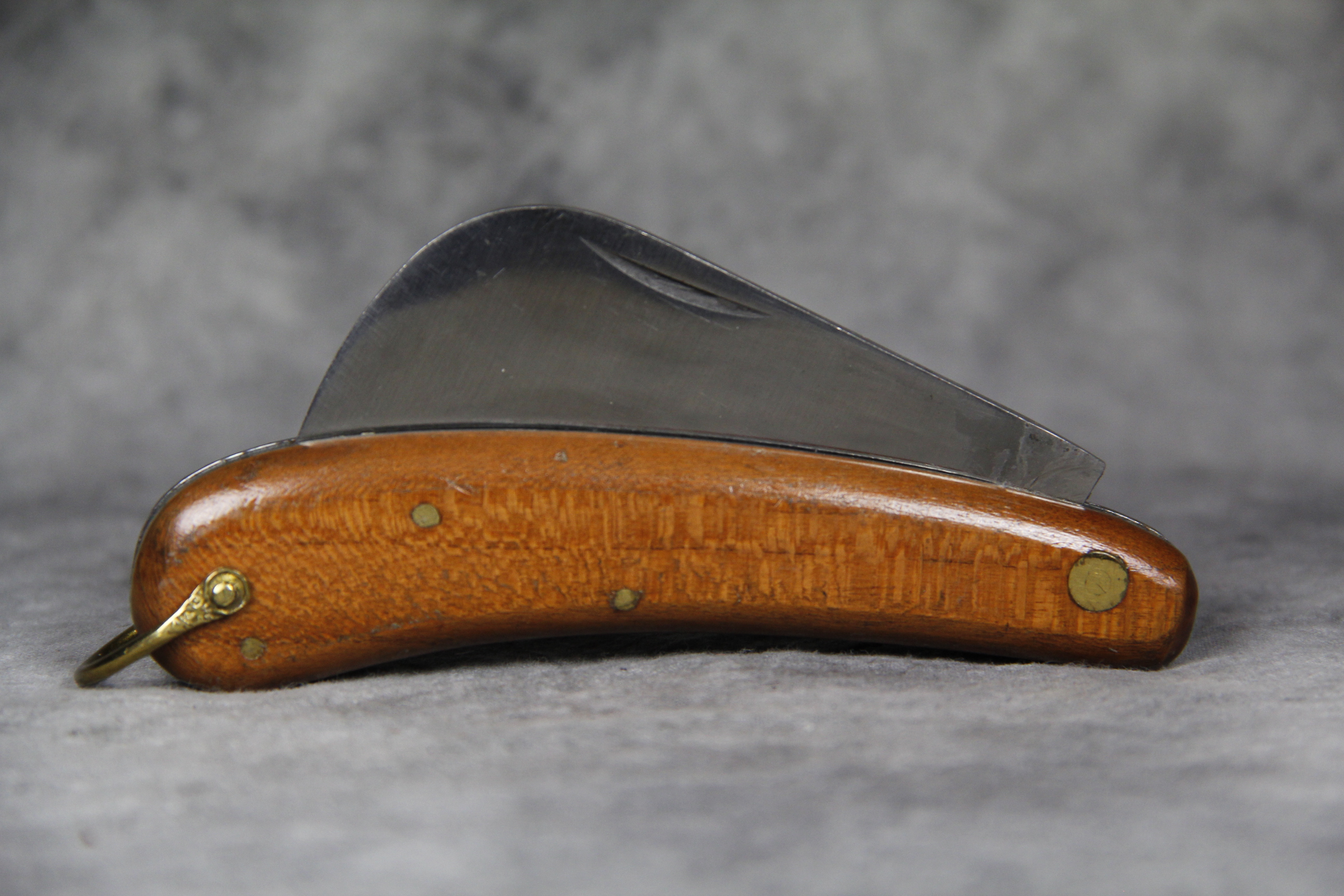 December 04, 2025 - Pruning Knife. 4-1/4 inches closed. 7 inches open. 'Made in Spain' tang stamp. Wood handle. Nickel Silver liner. Brass pins.