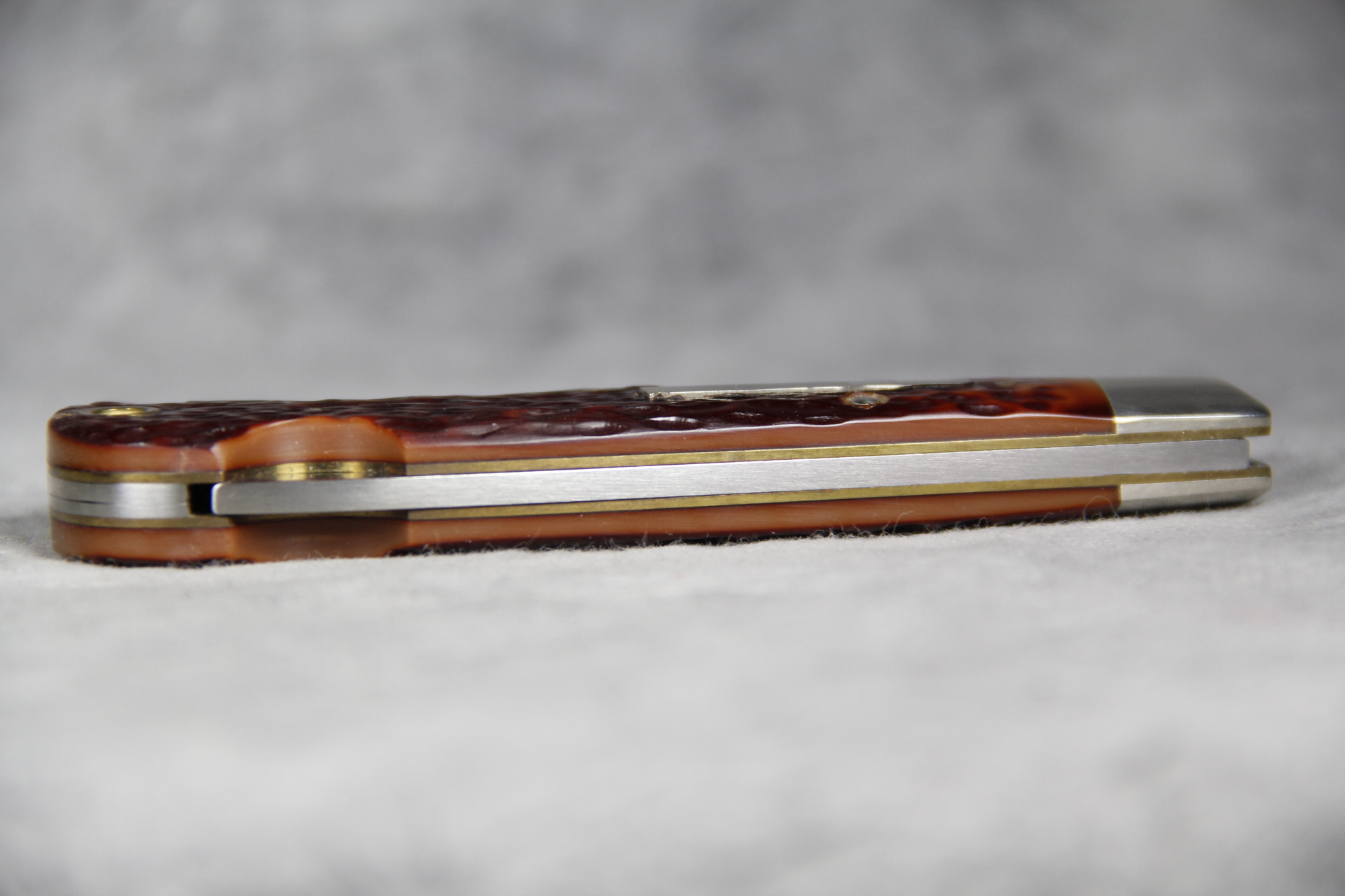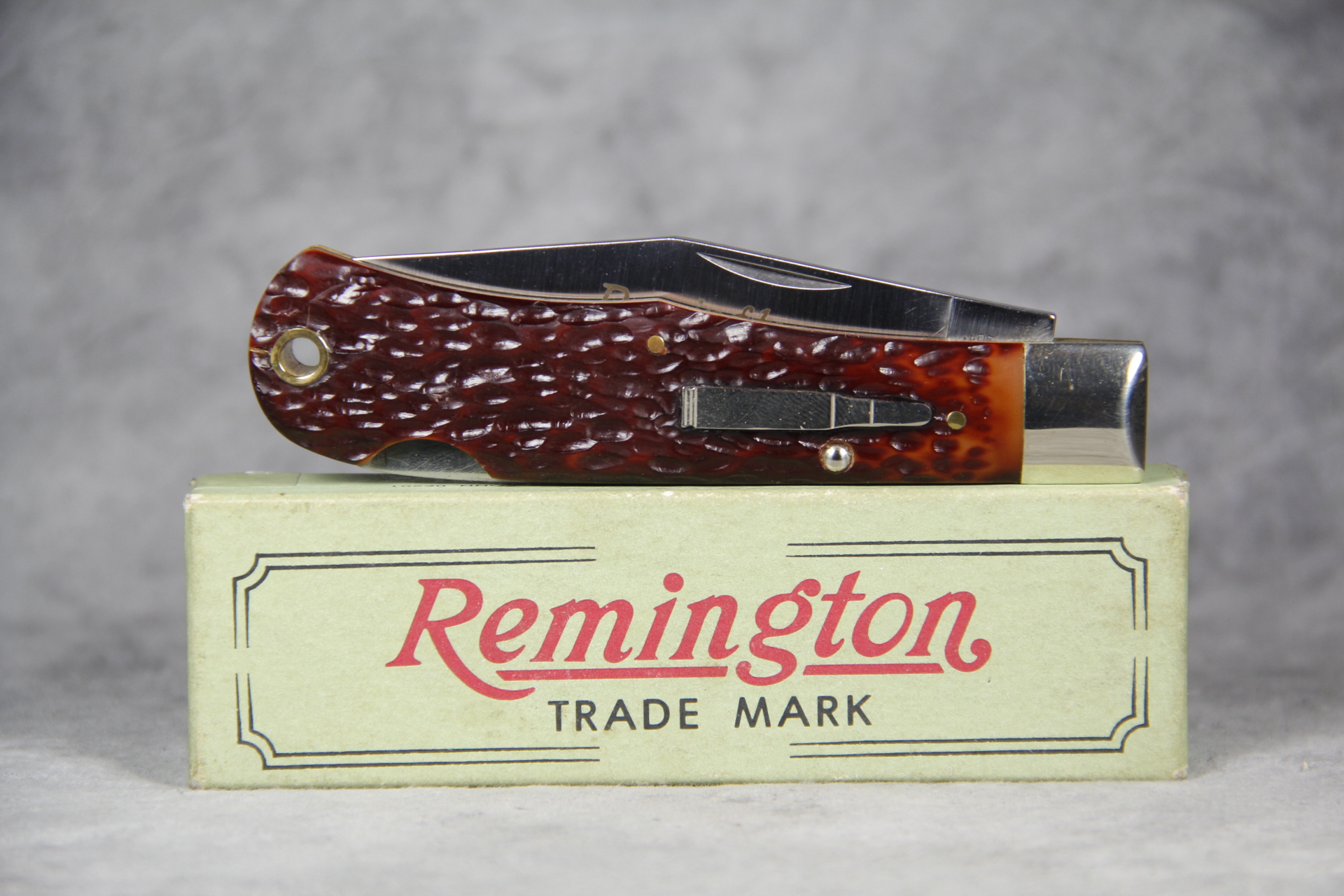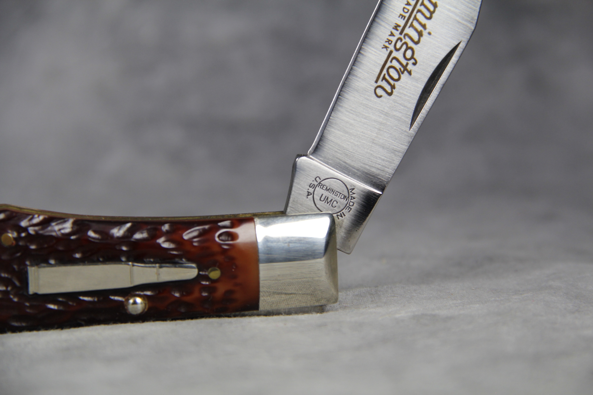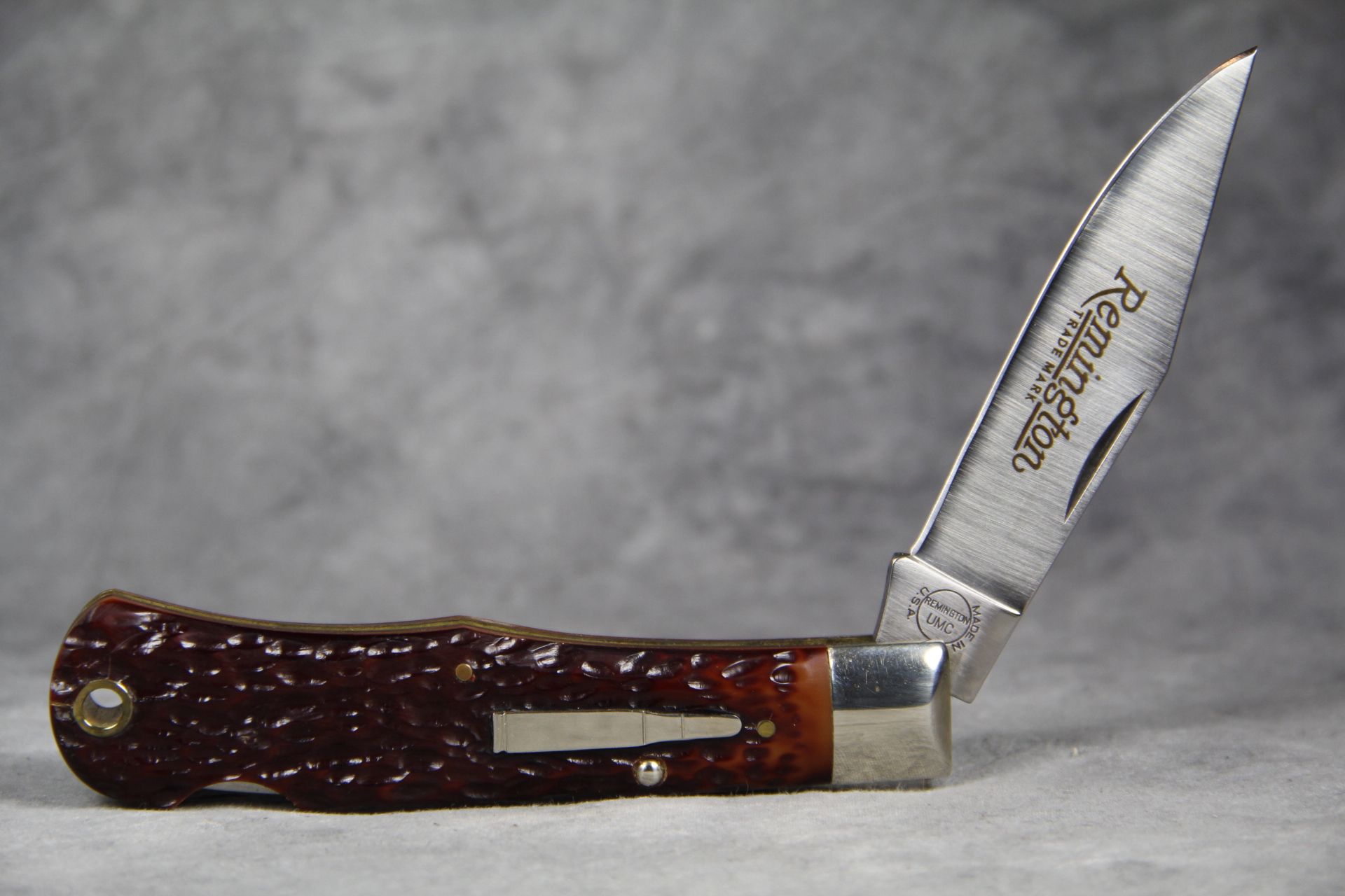 October 26, 2025 - Single Blade Special Edition Bullet Lockback Knife. 4-3/8 inches closed. 7-3/4 inches open. Made in USA. 'Remington UMC Made in USA' and 'R1303 1984' tang stamps. Bullet shield. Stainless Steel blades. Delrin handle. Nickel Silver bolsters. Brass liner. With original box and paperwork.