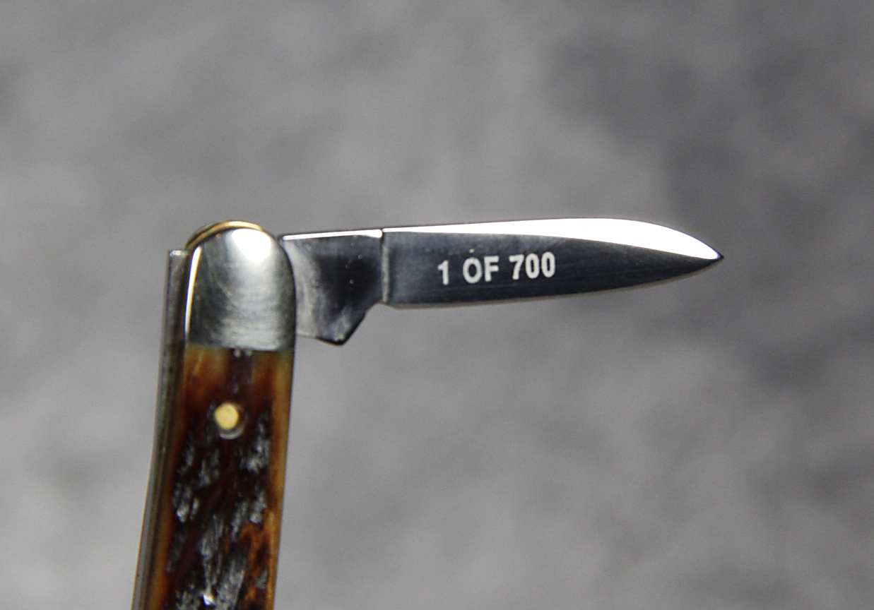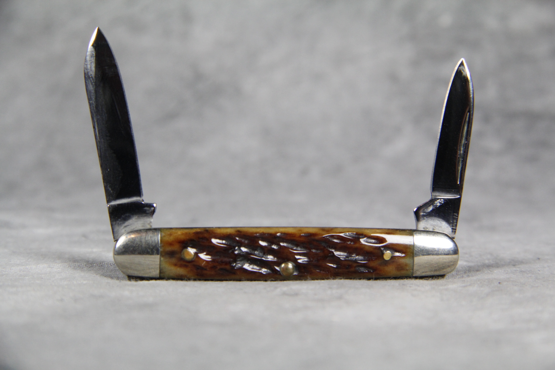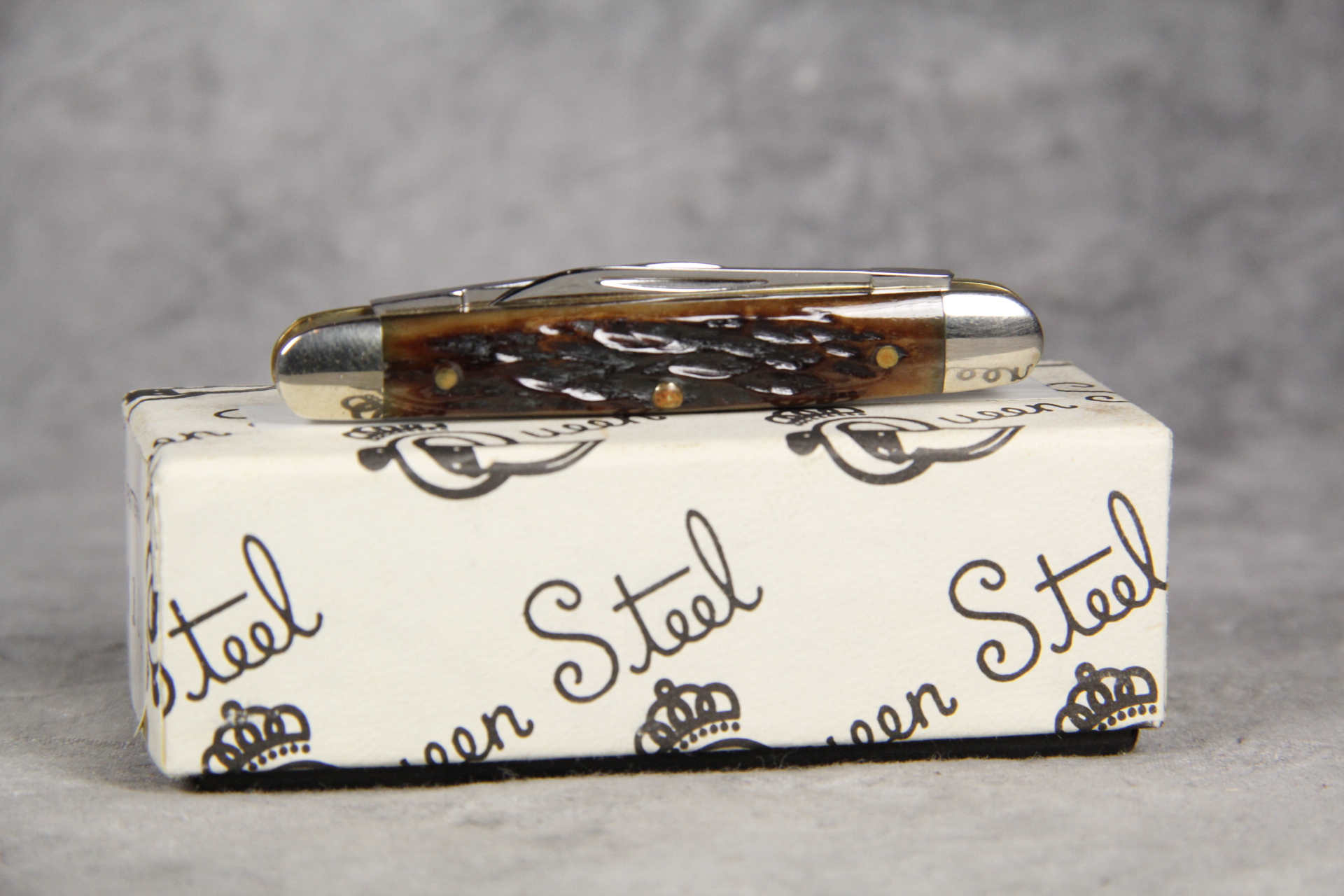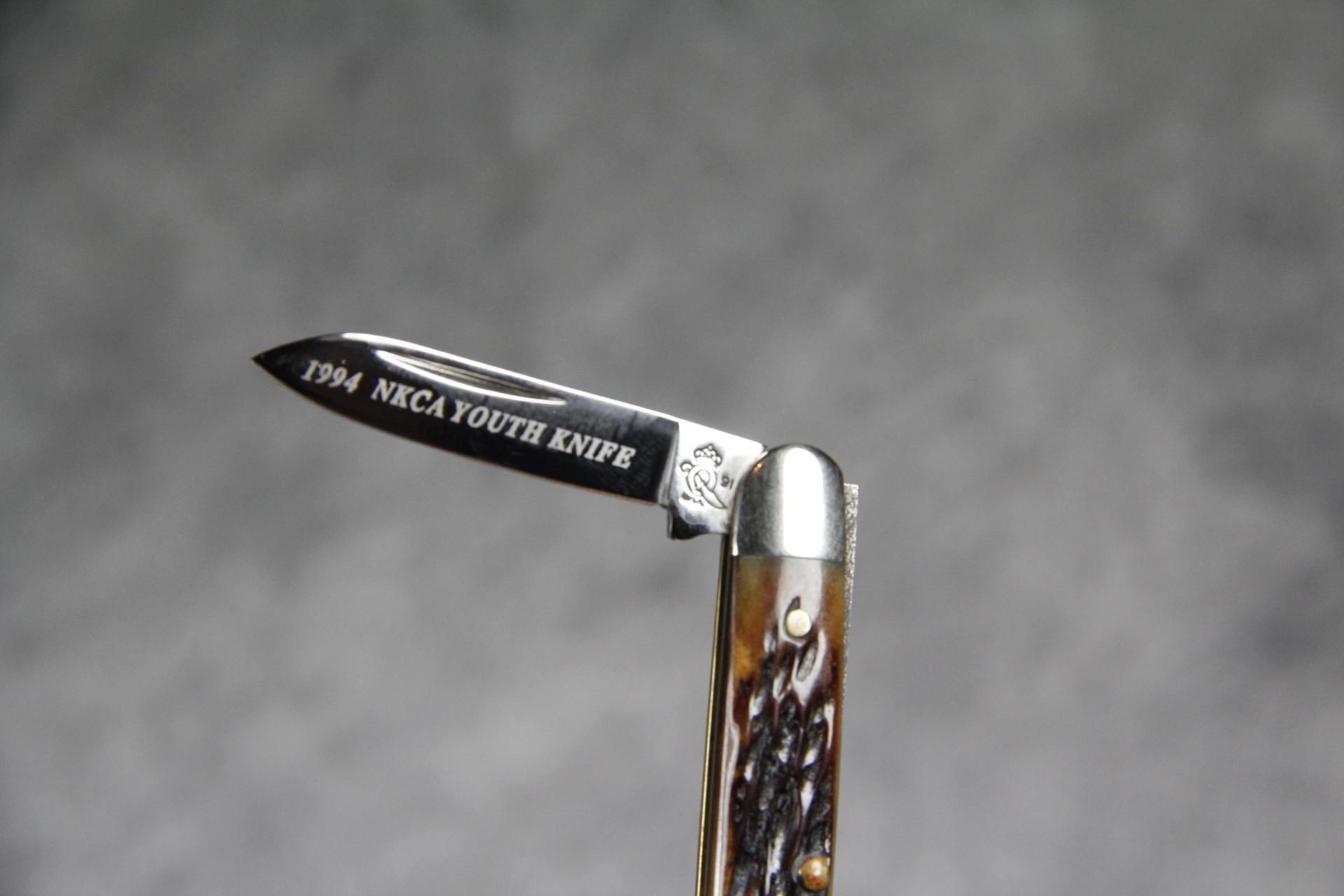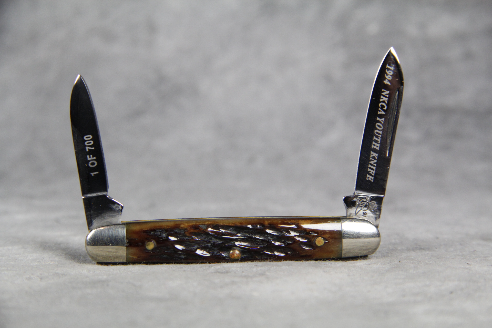 January 14, 2026 - 2-1/2 inches closed. 3-7/8 inches open. Made in USA. Queen Logo and 'USA 91' tang stamp. Stainless Steel blades etched '1994 NKCA Youth Knife' and '1 of 700'. Jigged Bone handle. Nickel Silver bolsters. Brass liner. With original box.
