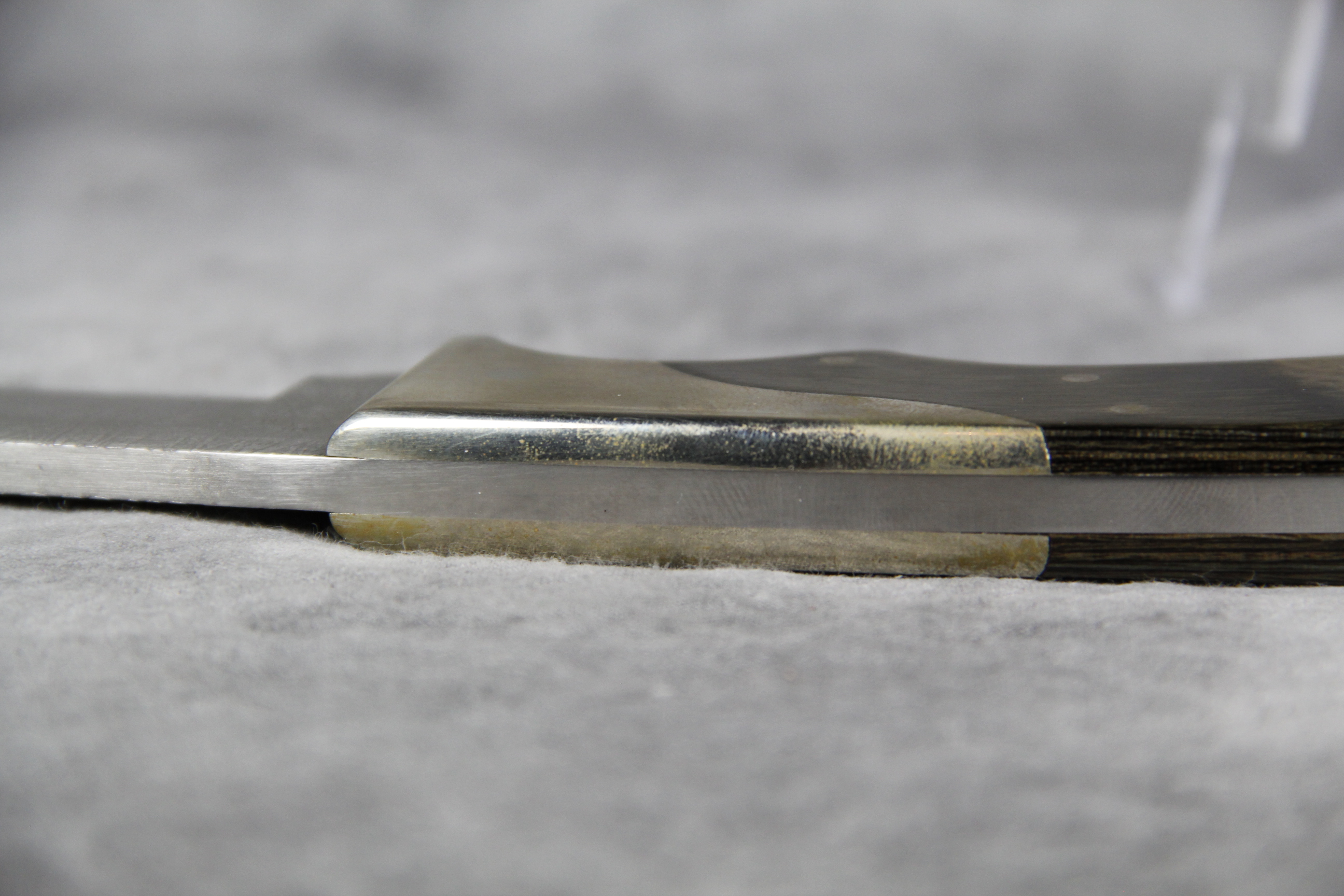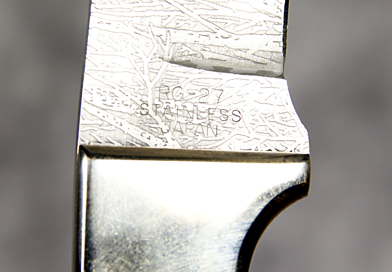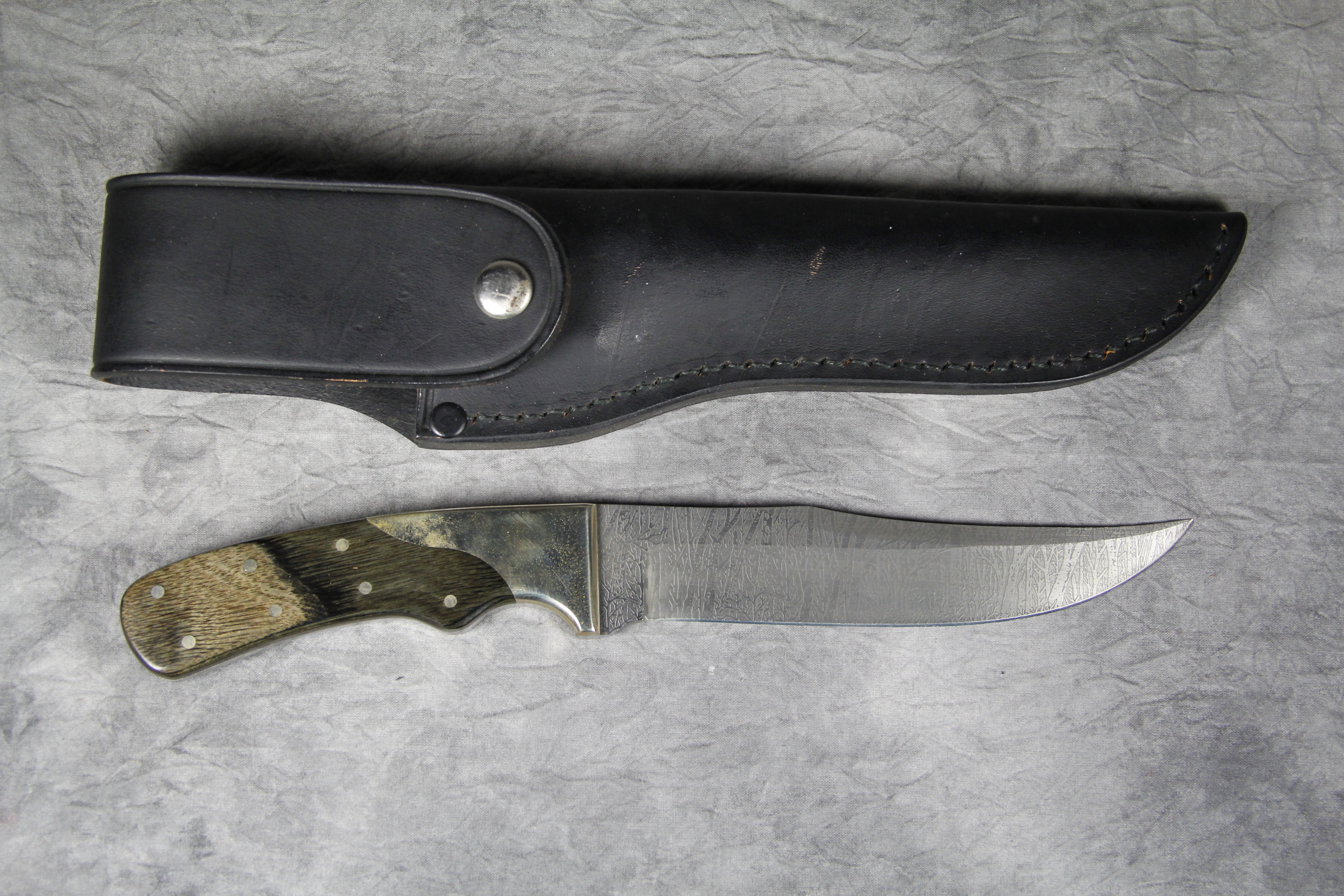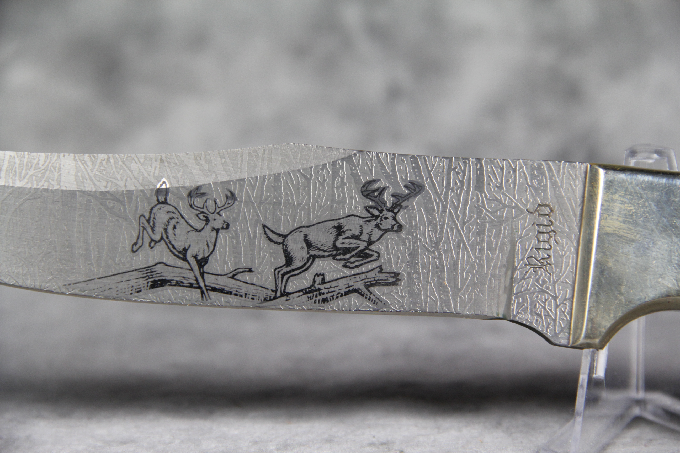 February 23, 2026 - Fixed Blade Fixed Blade Bowie Hunting Knife. 10-1/2 inches closed. Made in Japan. 'Rigid' and 'RG-27 Stainless Japan' tang stamp. Stainless Steel blades etched with Deer and Woods. Laminated Wood handle. Nickel Silver bolsters. With original leather sheath.