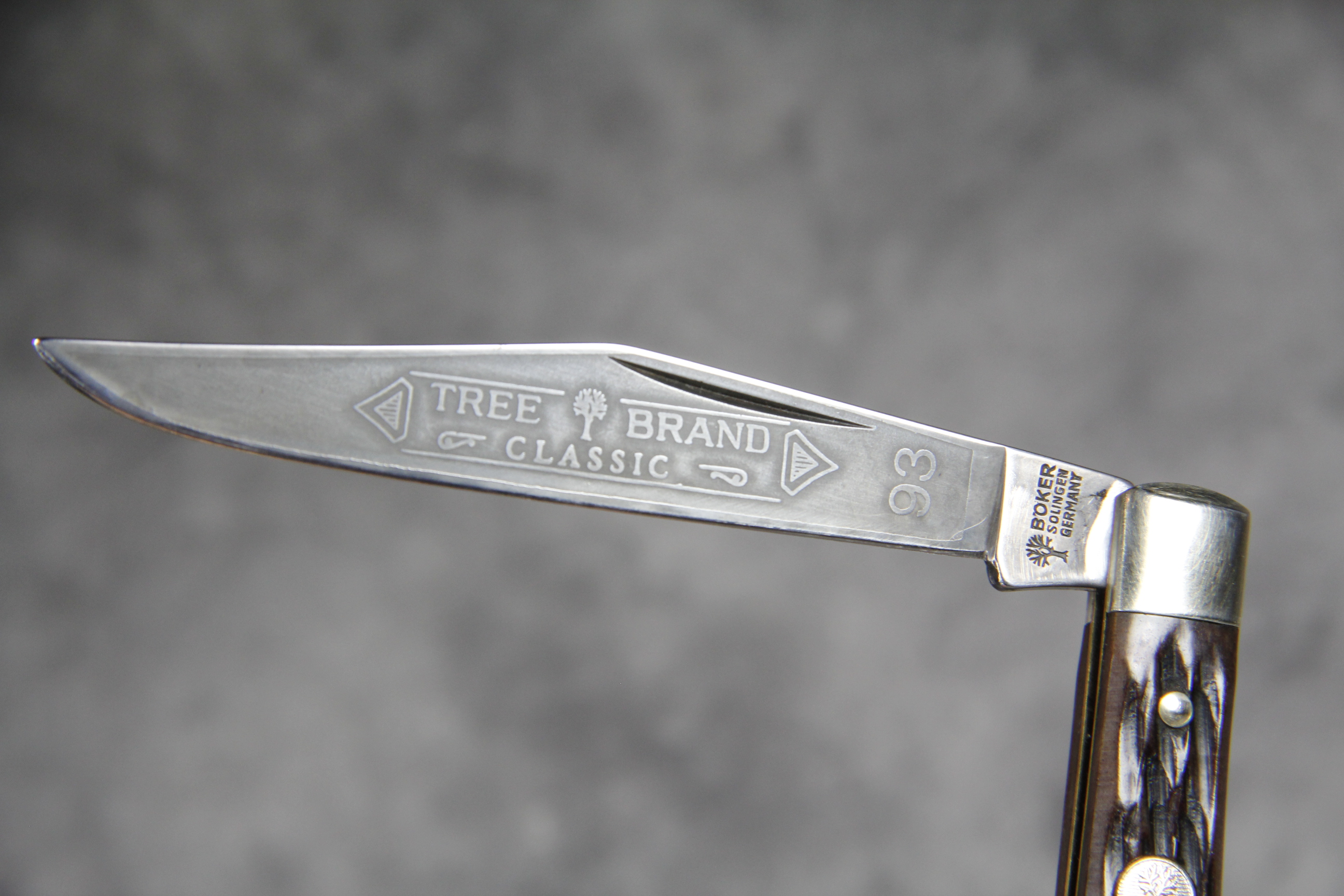 December 04, 2025 - 4 inches closed. 7-1/4 inches open. 'Tree Brand Classic' and '93' etched onto blade; 'Boker Solingen Germany' tang stamp. Circle Tree Solingen shield. Stainless Steel blades. Bone handle. Nickel Silver bolsters. Brass liner.