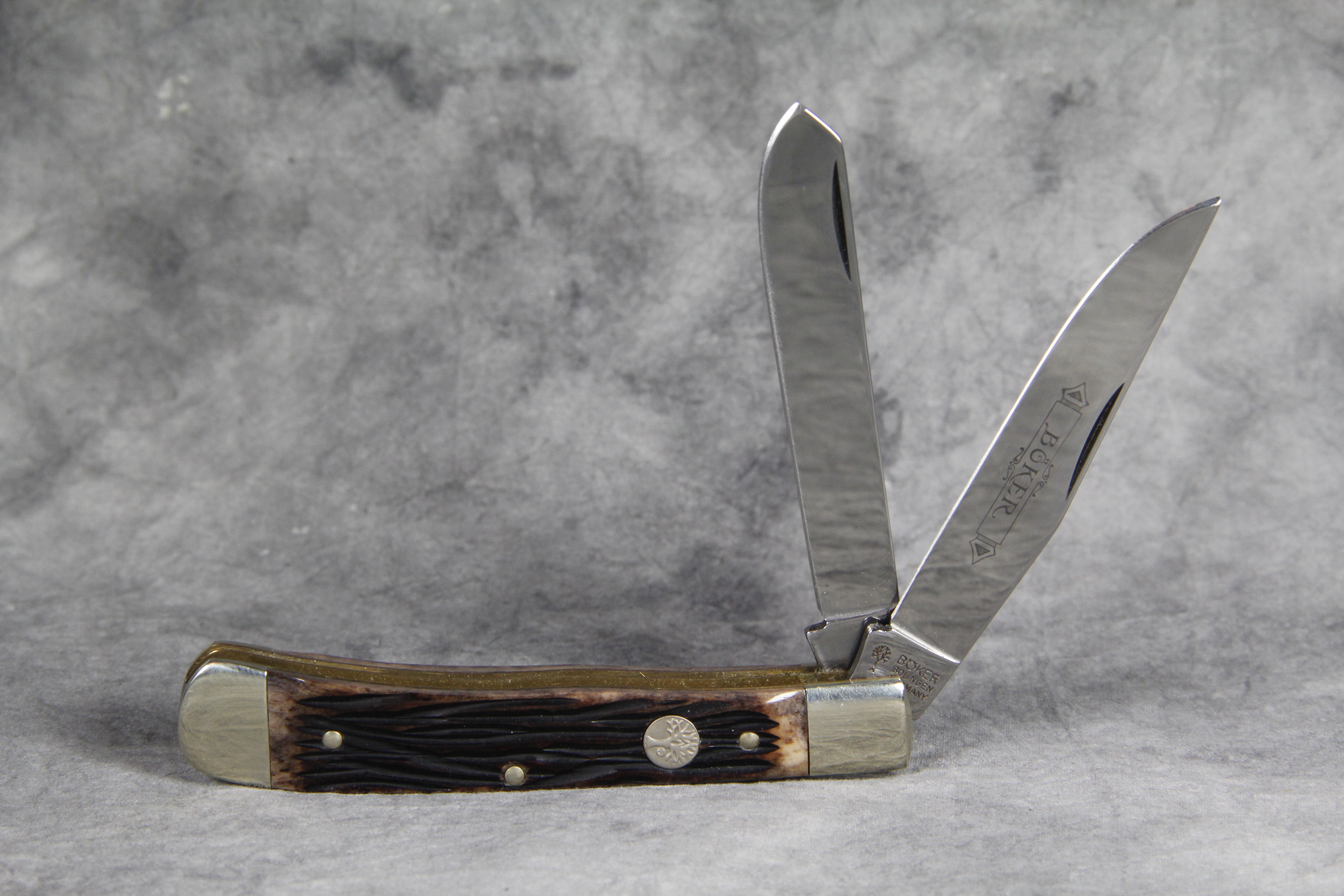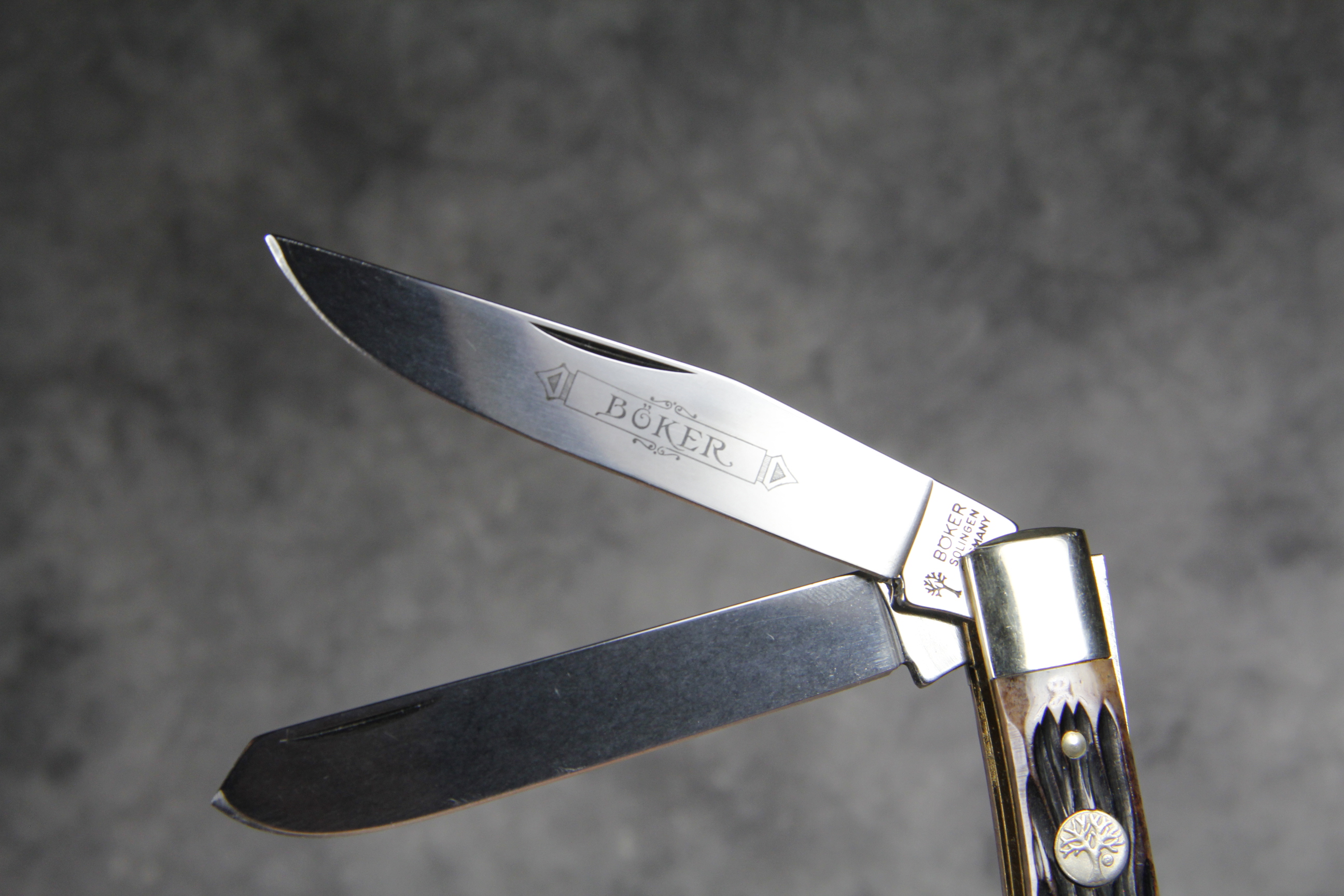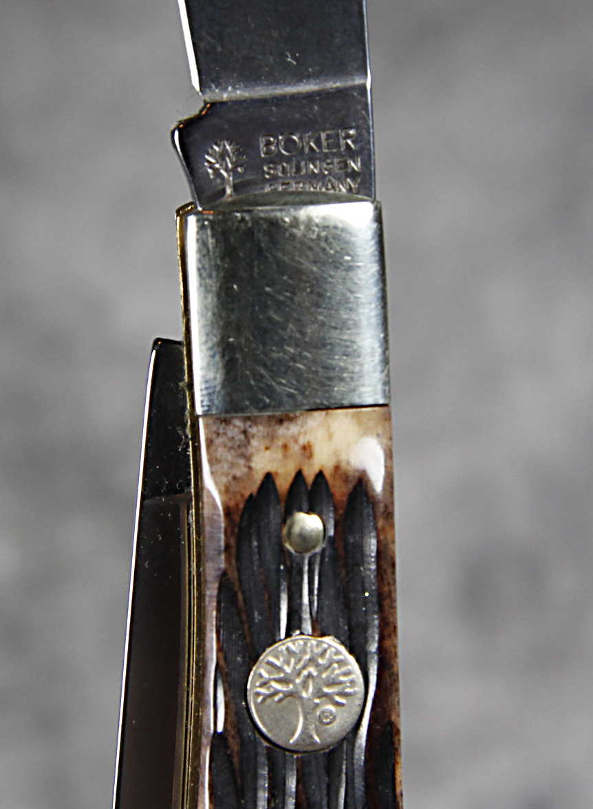 January 14, 2026 - 4-1/8 inches closed. 7-3/8 inches open. 'Boker' etched onto blade; 'Boker Solingen Germany' tang stamp. Circle Tree shield. Stainless Steel blades. Jigged Bone handle. Nickel Silver bolsters. Brass liner.