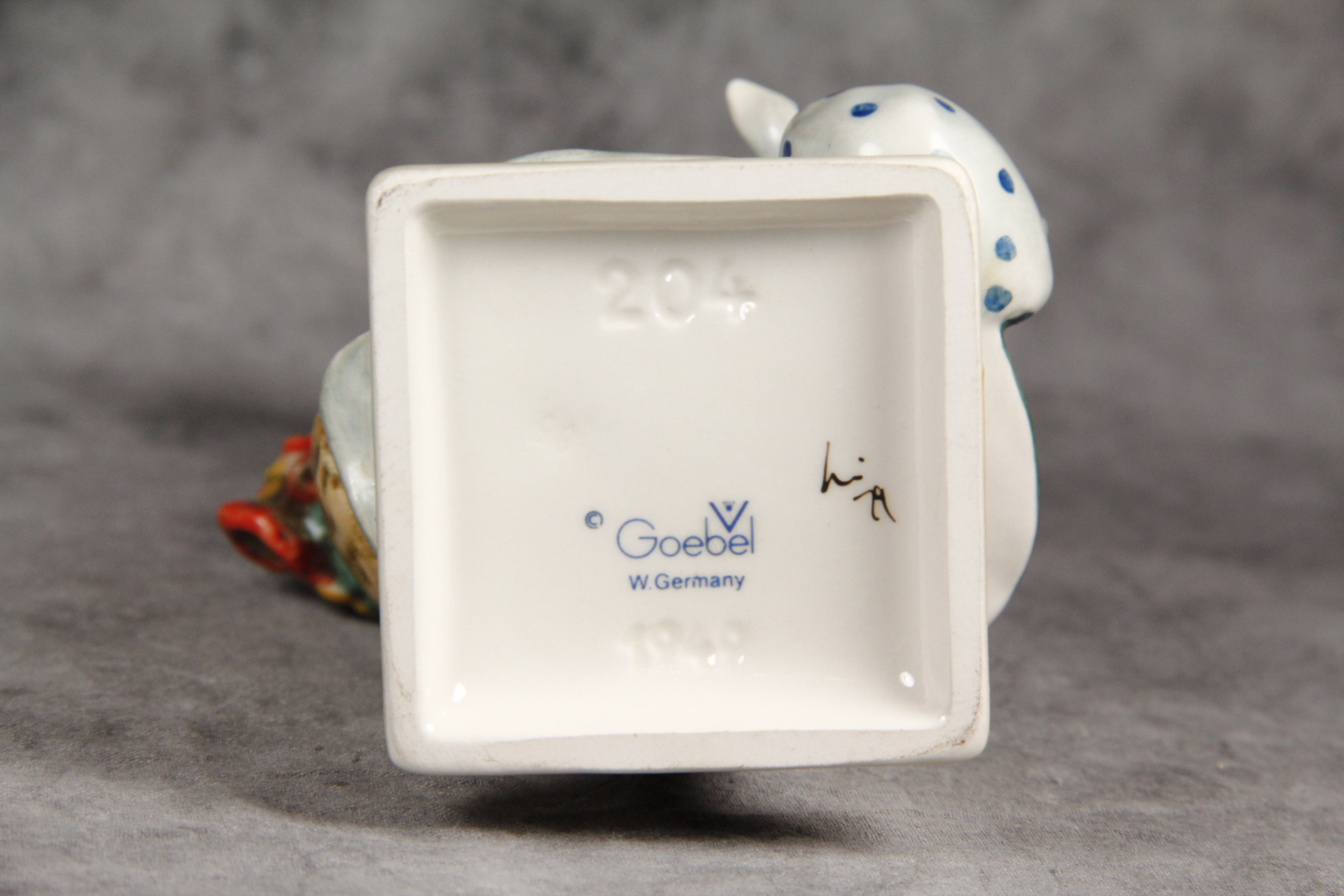April 25, 2026 - 5-3/4 inches tall. Base is incised 204 and 1949. Goebel TMK 5 trademark imprinted in blue on bottom of base. Painter hand-initialed and dated in black ink on bottom of base.