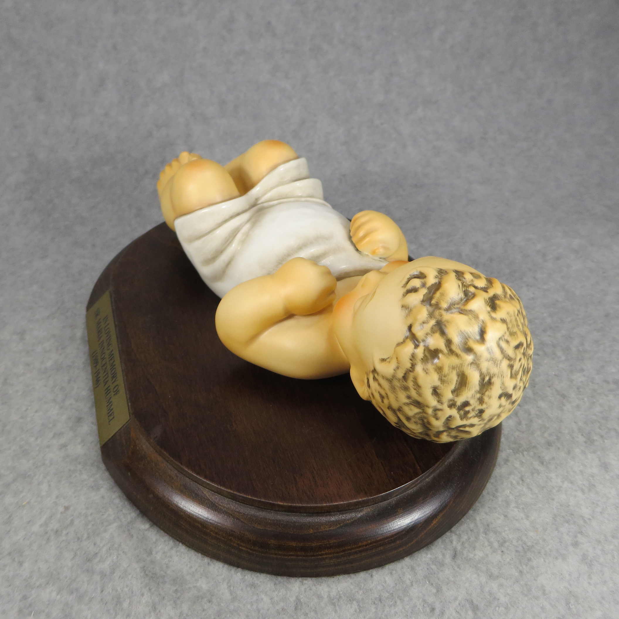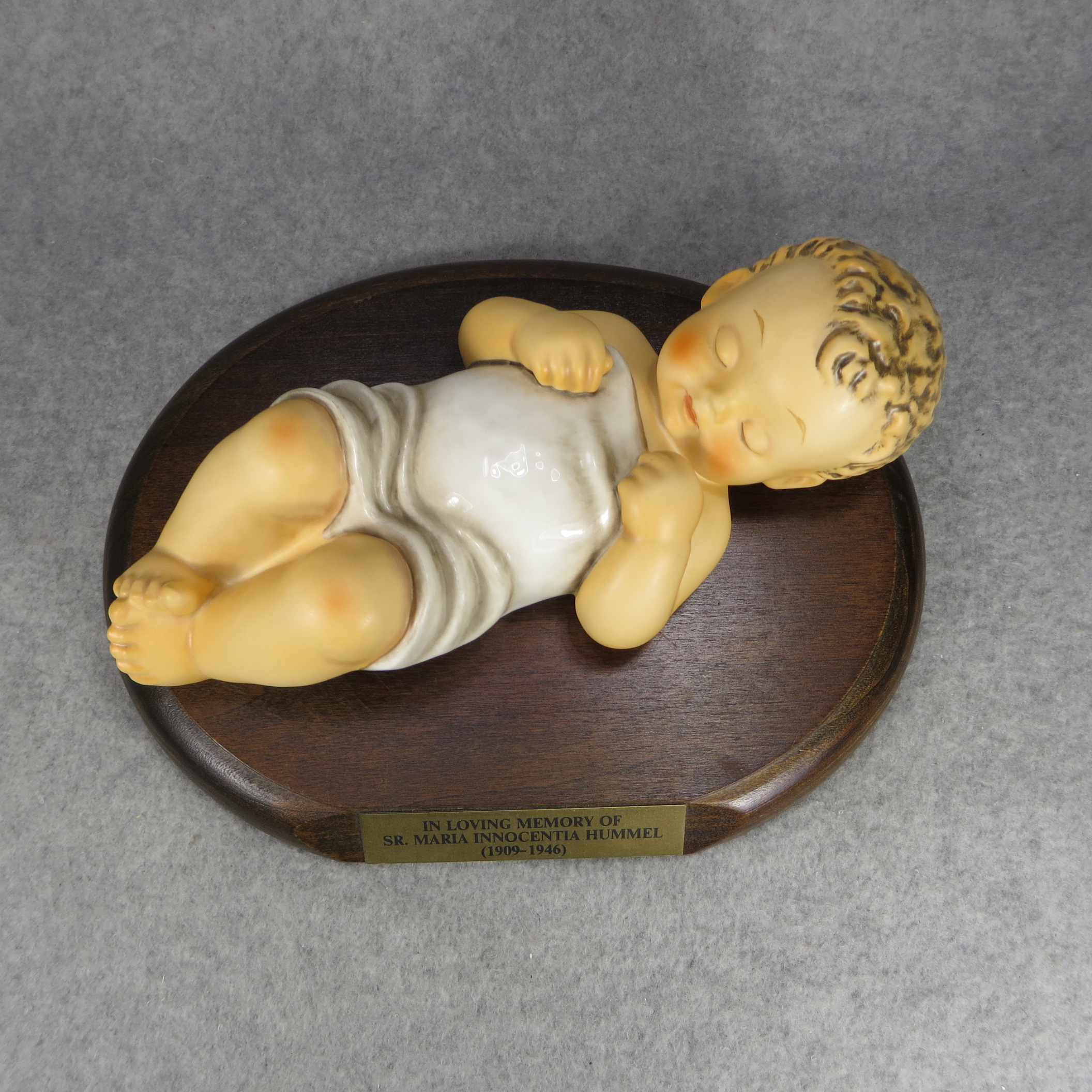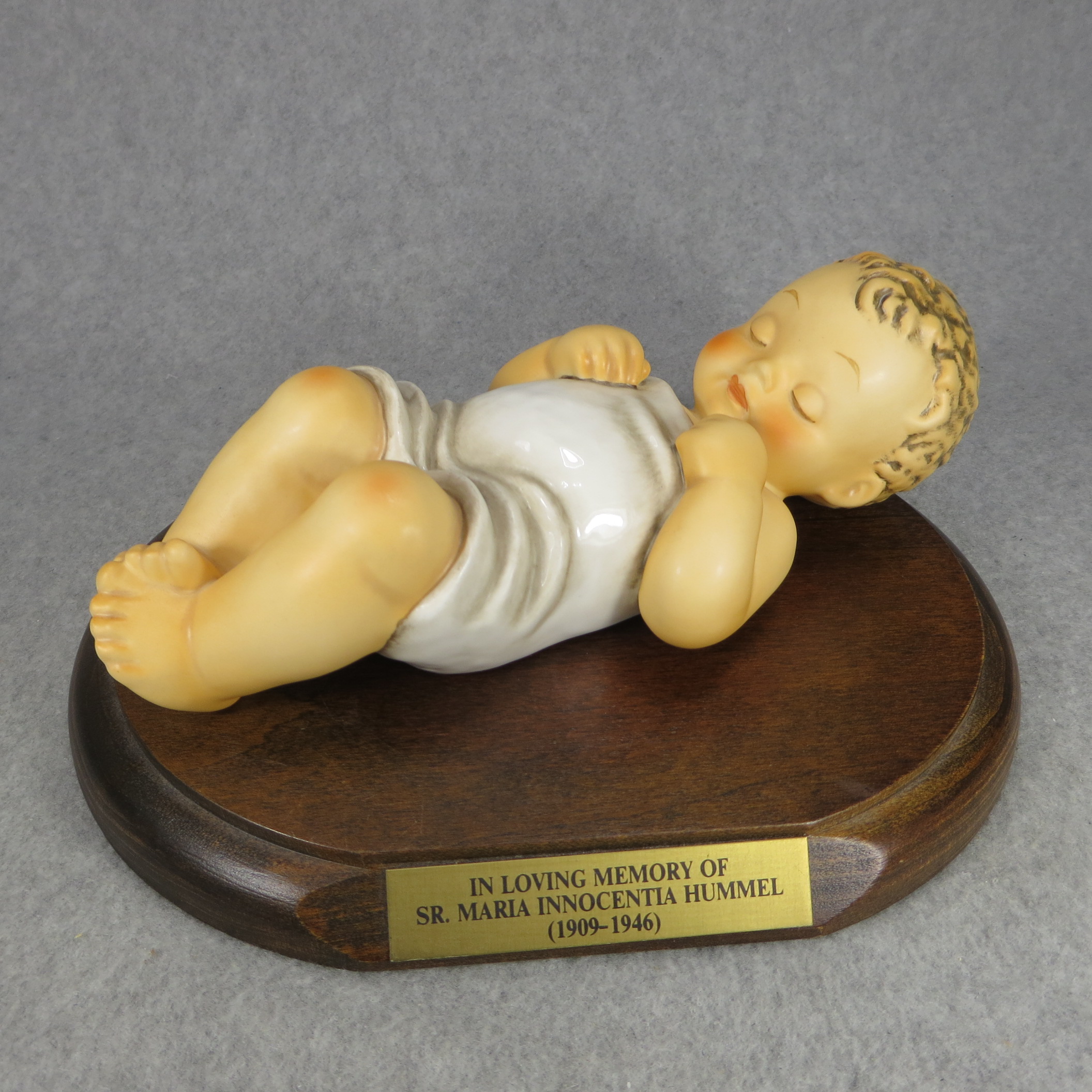 April 05, 2026 - 7-3/4 inches long. Bottom is incised 78/V and 1966 with Maria Hummel's signature. Goebel TMK 8 trademark imprinted in blue on the bottom. Artist hand-initialed and dated in black ink. Base name plate engraved 'IN LOVING MEMORY OF SR. MARIA INNOCENTIA HUMMEL / (1909/1946)'