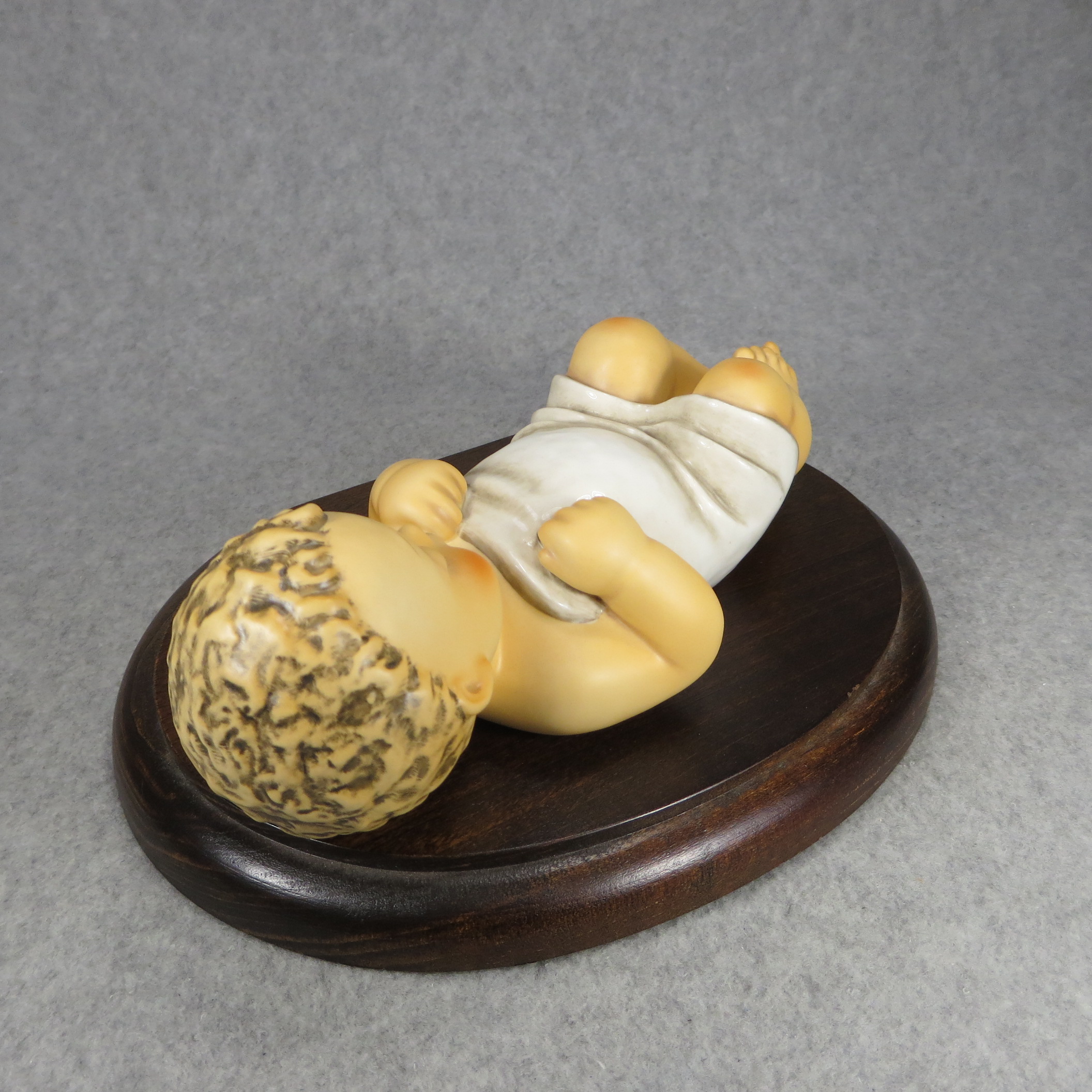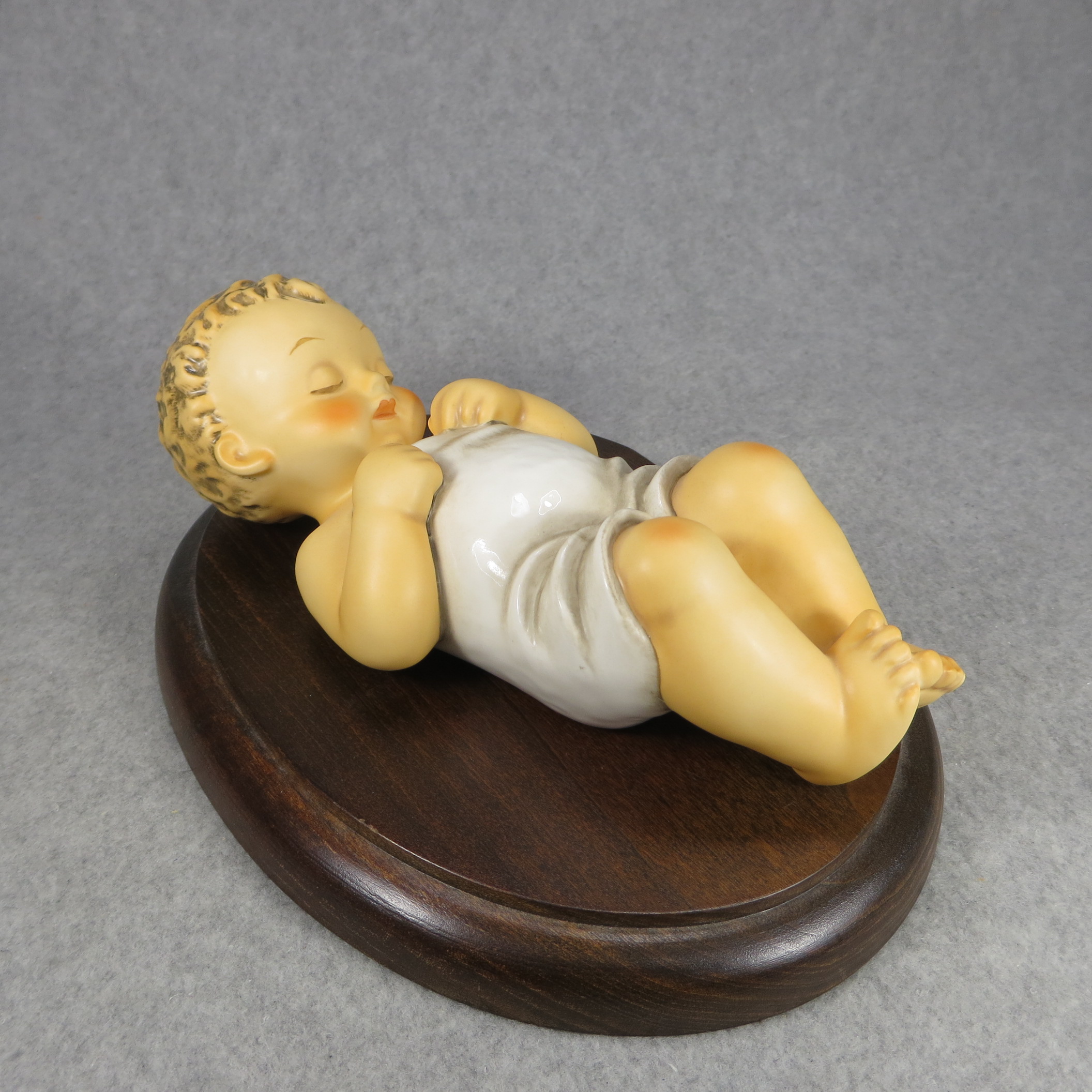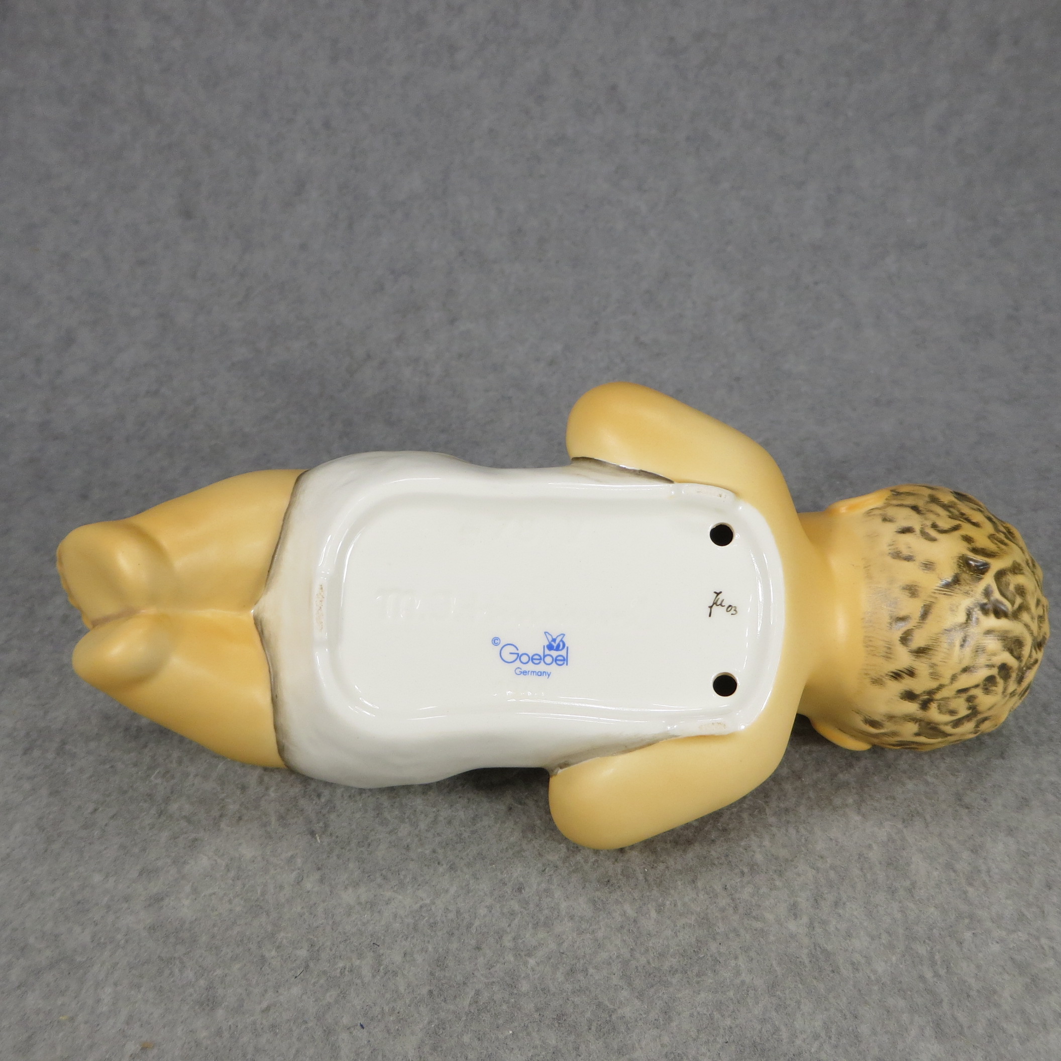 April 05, 2026 - 7-3/4 inches long. Bottom is incised 78/V and 1966 with Maria Hummel's signature. Goebel TMK 8 trademark imprinted in blue on the bottom. Artist hand-initialed and dated in black ink. Base name plate engraved 'IN LOVING MEMORY OF SR. MARIA INNOCENTIA HUMMEL / (1909/1946)'