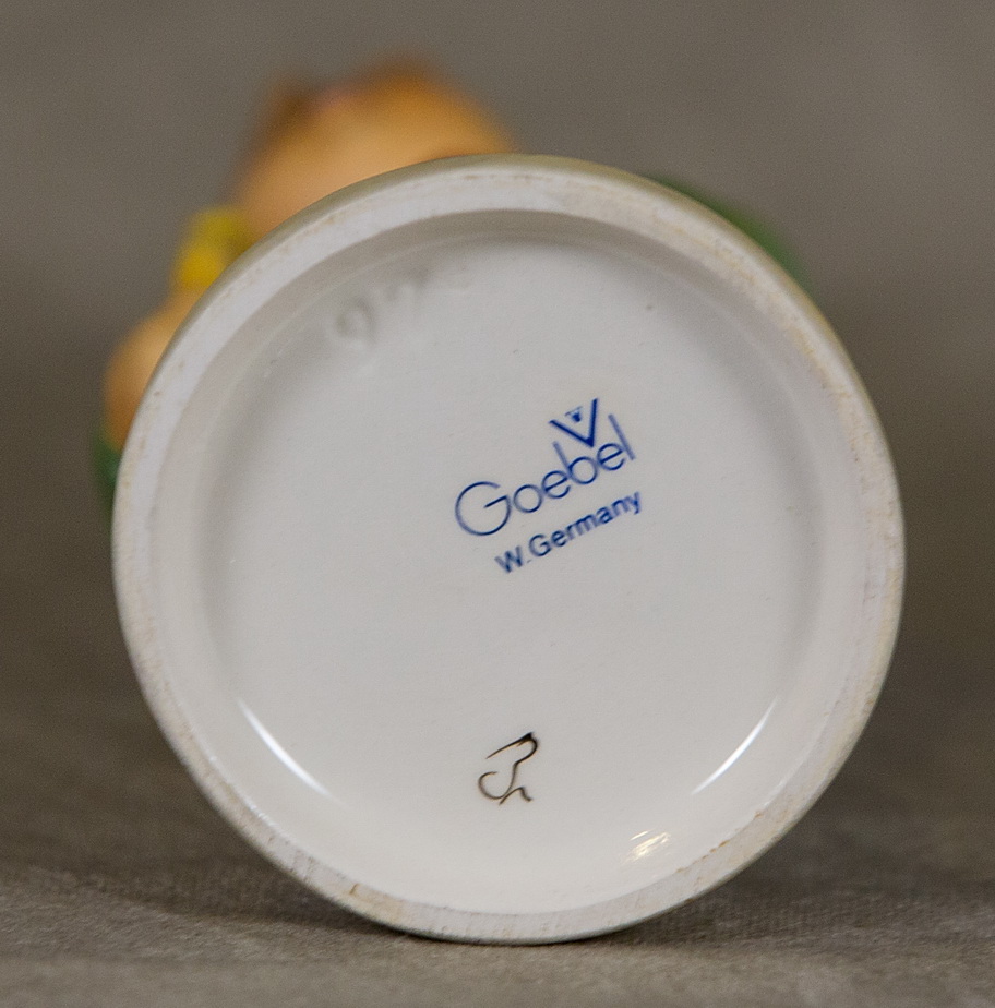 October 28, 2025 - 4-3/4 inches tall. Base is incised 97. Goebel TMK 5 trademark imprinted in blue on bottom of base. Painter hand-initialed in black ink on bottom of base.
