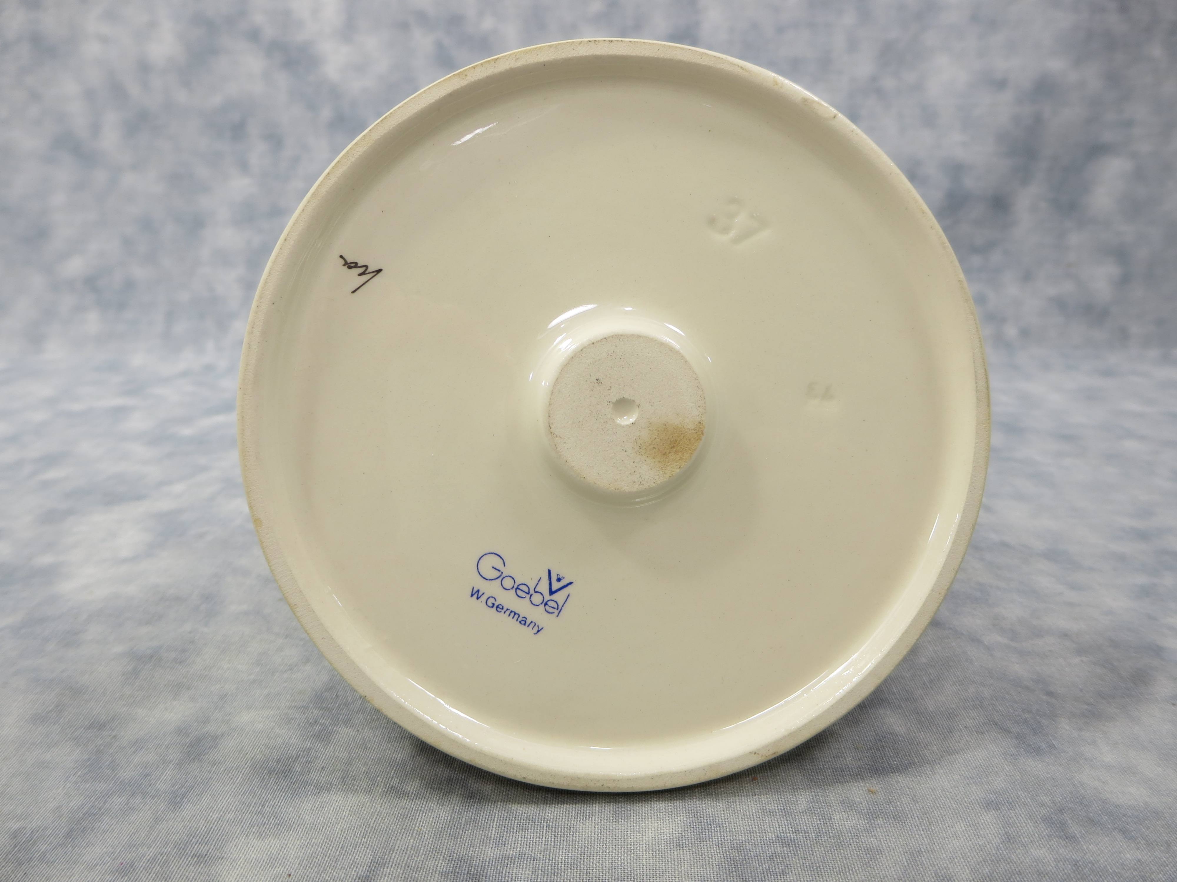 March 16, 2026 - 3 inches tall. 4-1/2 wide. Base is incised 37. Goebel TMK 5 trademark imprinted in blue on bottom of base. Painter hand-initialed in black ink on bottom of base.