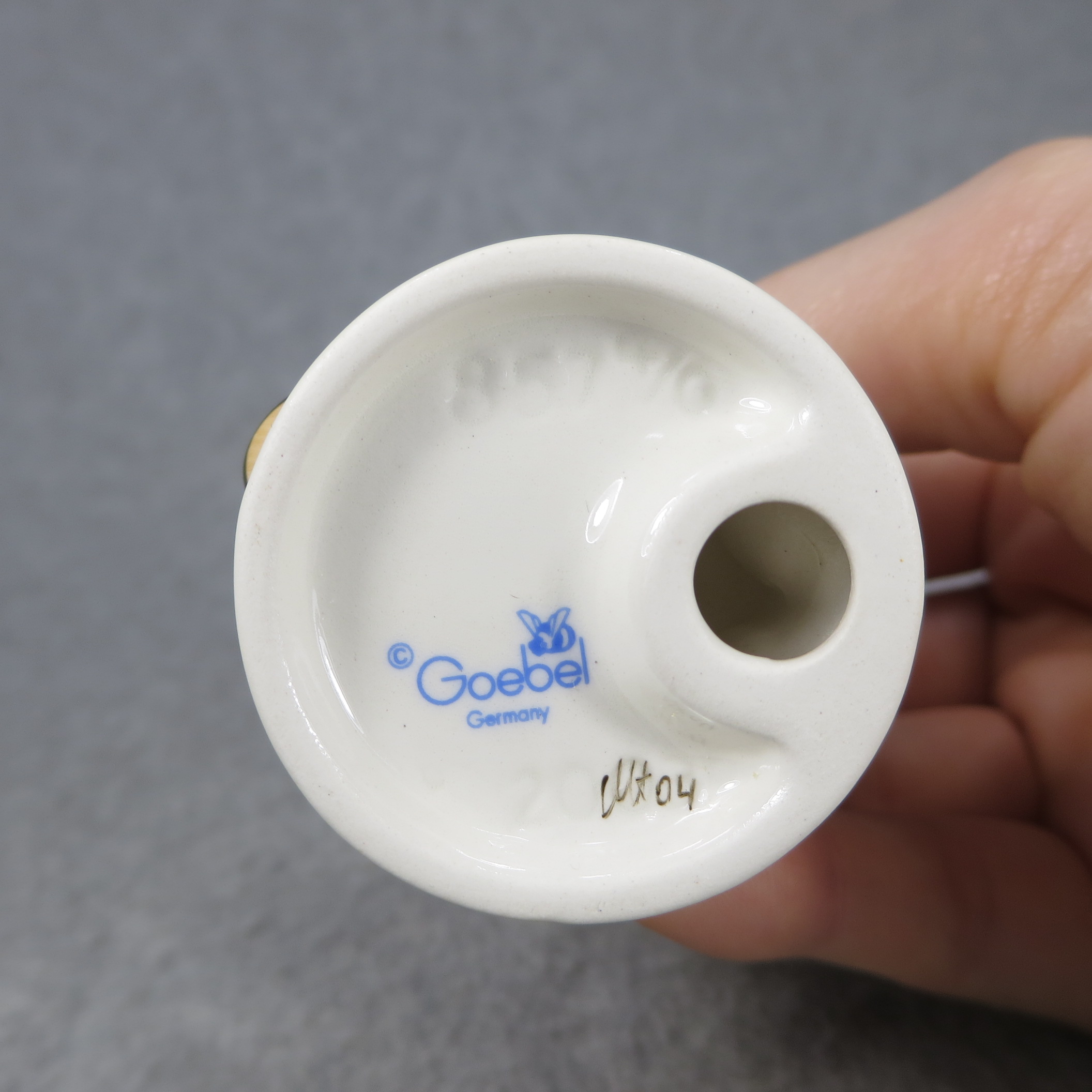April 25, 2026 - 2-3/4 inches tall. Base is incised 857 4/0 and 2003. Goebel TMK 8 trademark imprinted in blue on bottom of base. Painter hand-initialed and dated in black ink on bottom of base.