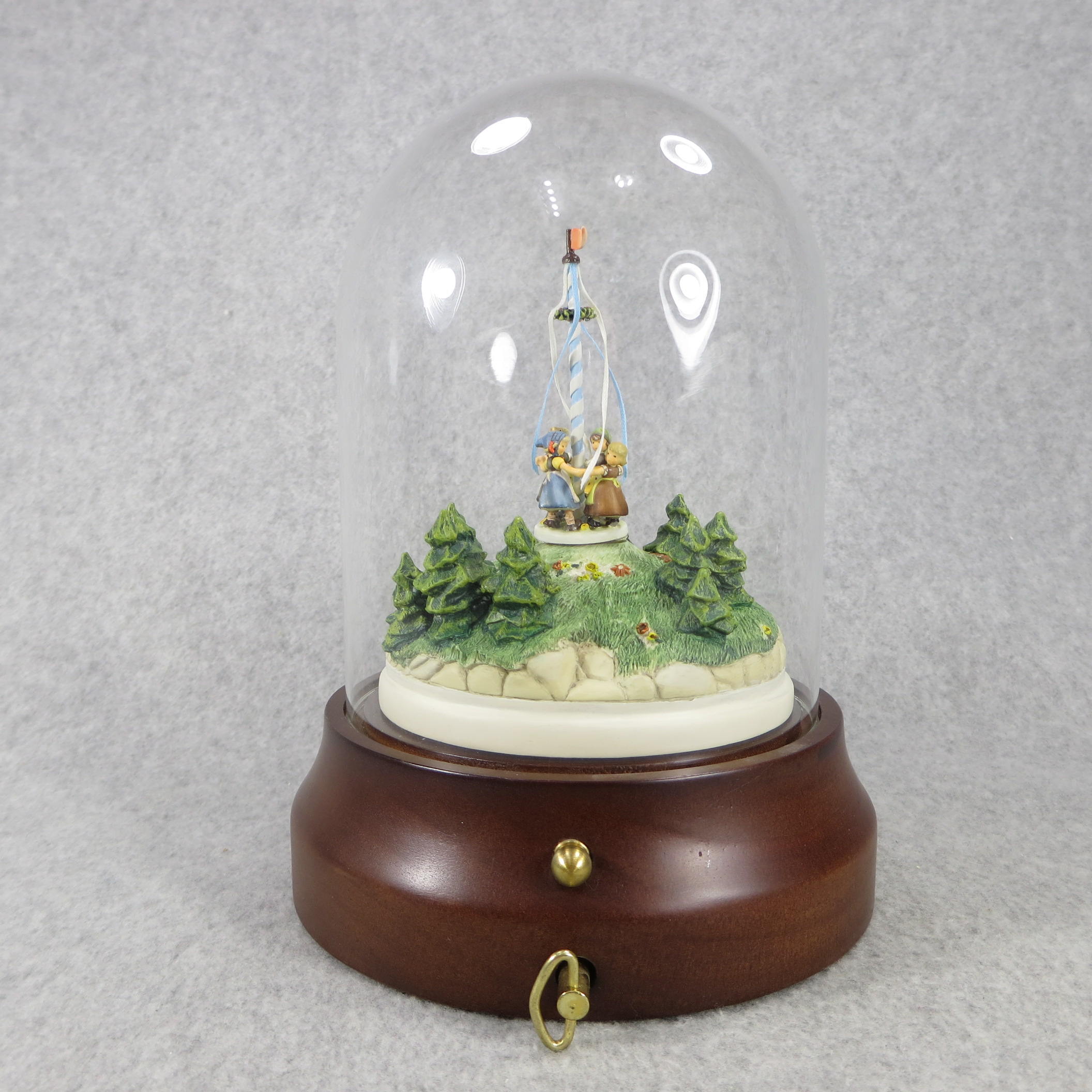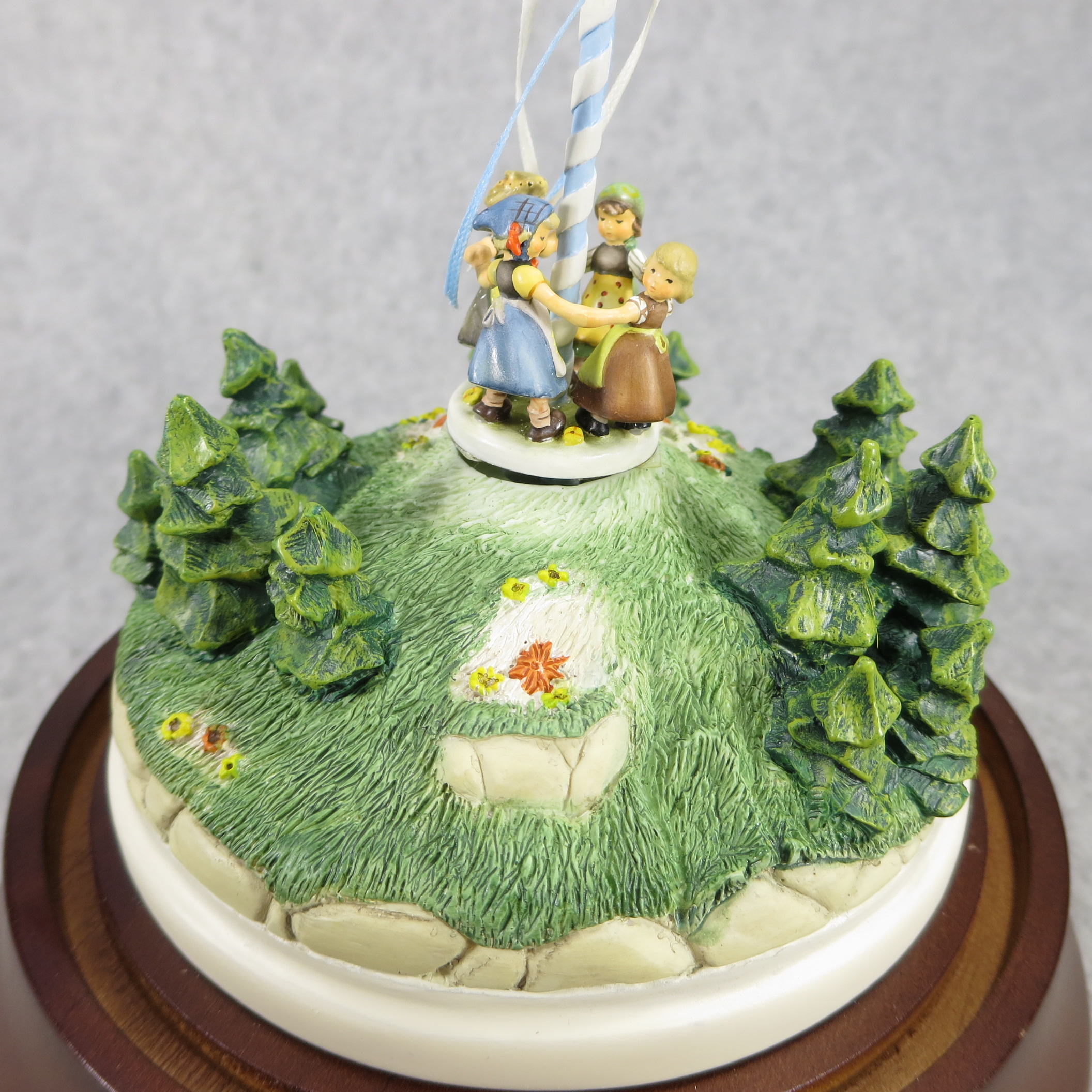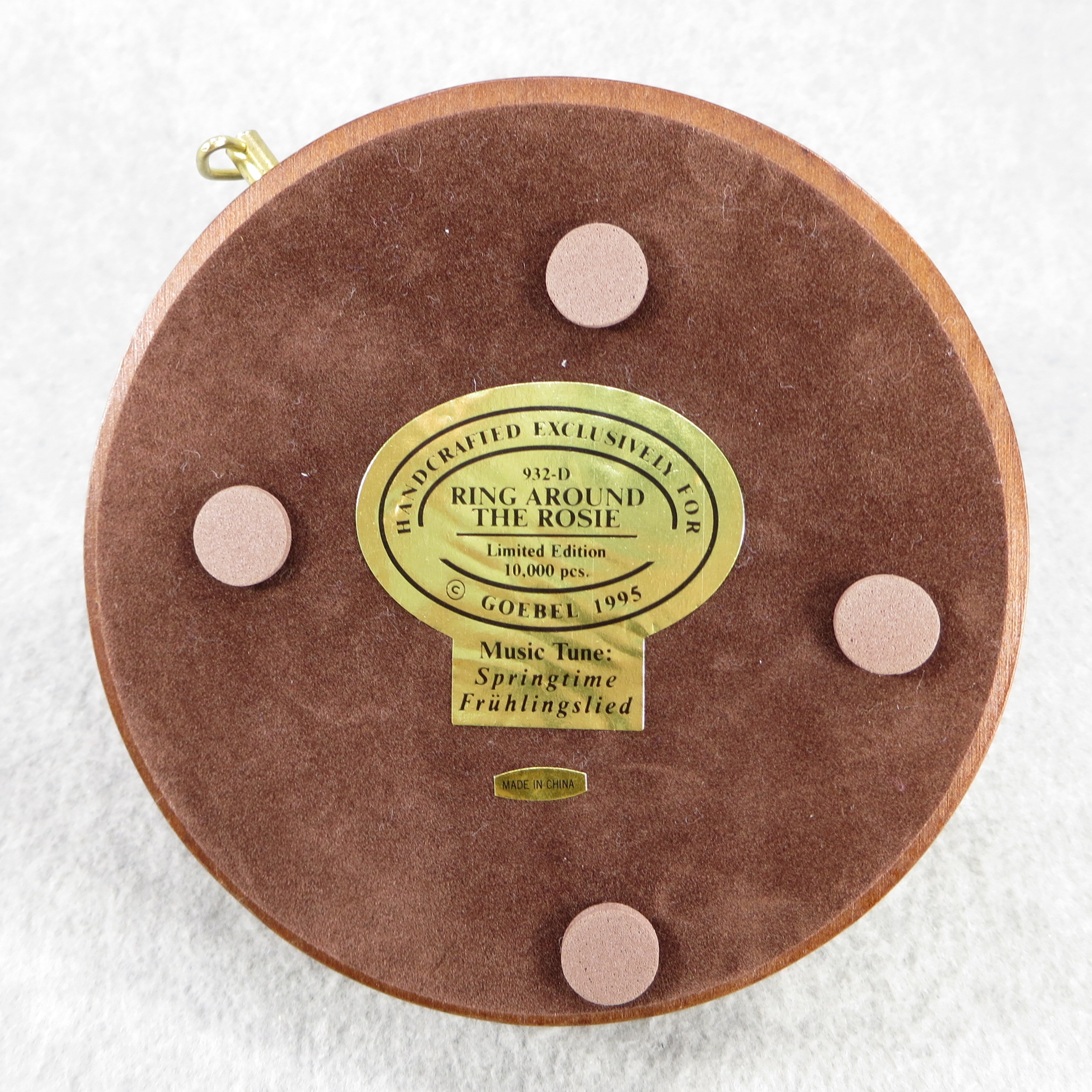MUSICAL SCAPE IS AS FOLLOWS: 8 inches tall by 5-3/4 inches wide at base. Base nameplate is stamped HANDCRAFTED EXCLUSIVELY FOR / 932-D / RING AROUND THE ROSIE / Limited Edition / 10,000 pcs / GOEBEL 1995 / Music Tune: Springtime