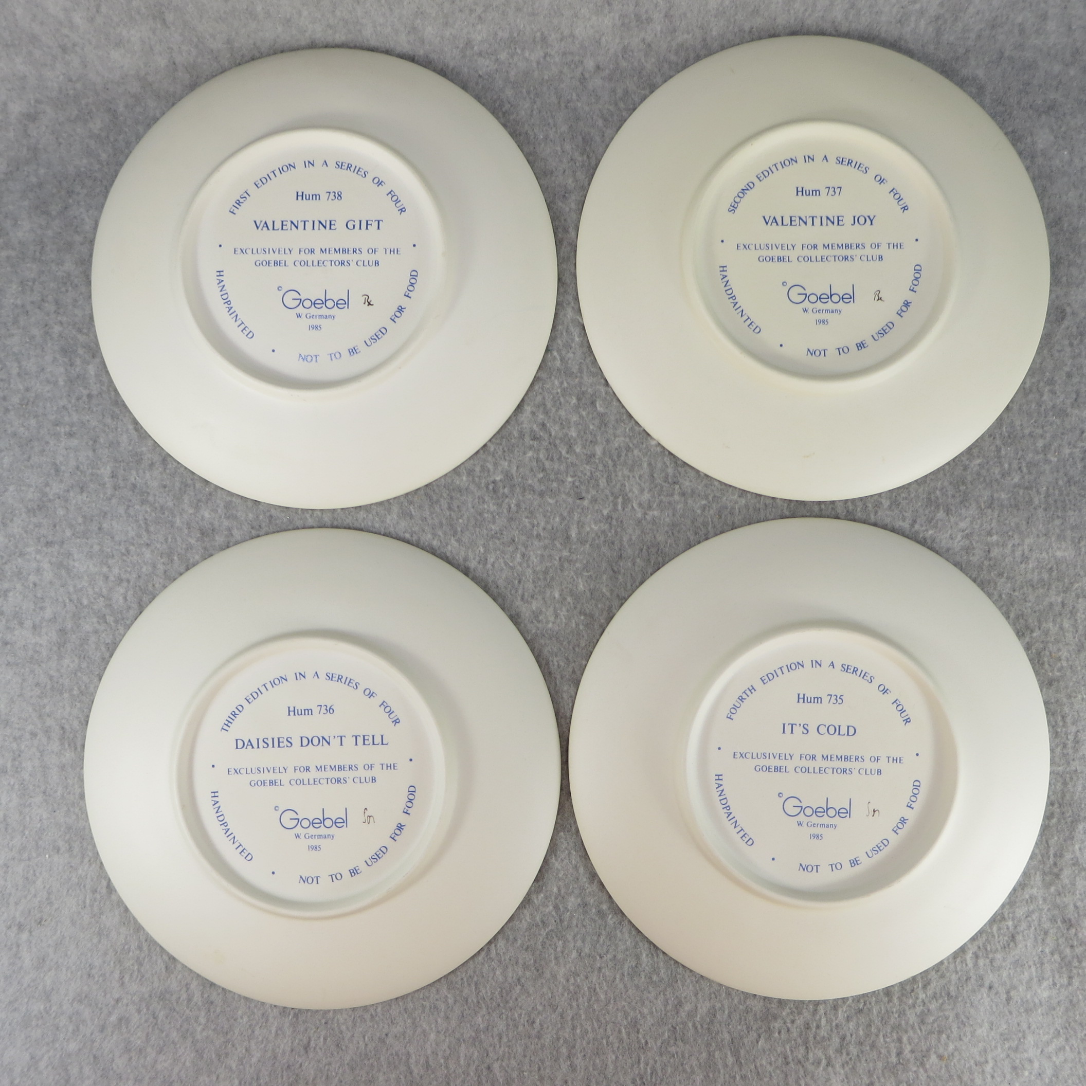 October 28, 2025 - Each plate is 6-1/4 inches in diameter. The following is imprinted in blue on bottom of the plates: XXX EDITION IN A SERIES OF FOUR, Hum 73#, EXCLUSIVELY FOR MEMBERS OF THE GOEBEL COLLECTORS' CLUB, Goebel TMK 6 trademark, HANDPAINTED, NOT TO BE USED FOR FOOD.
