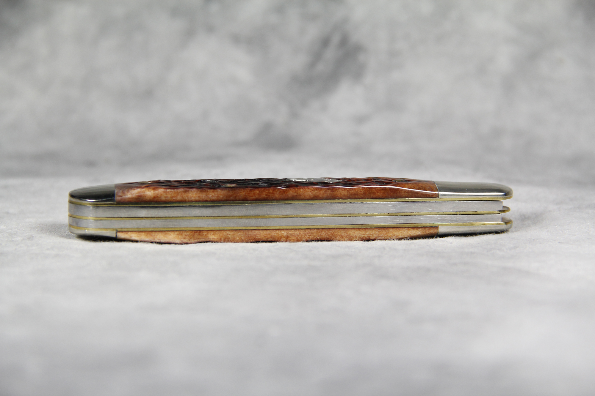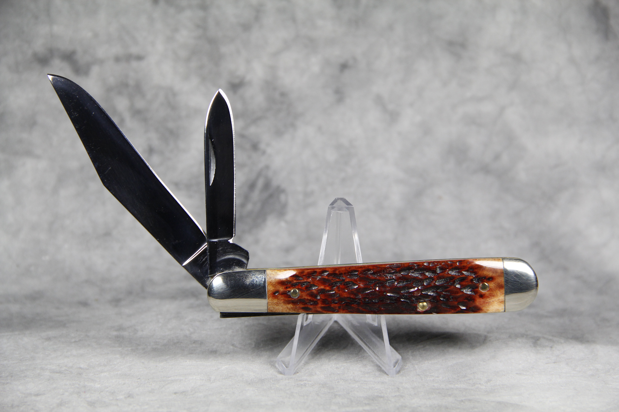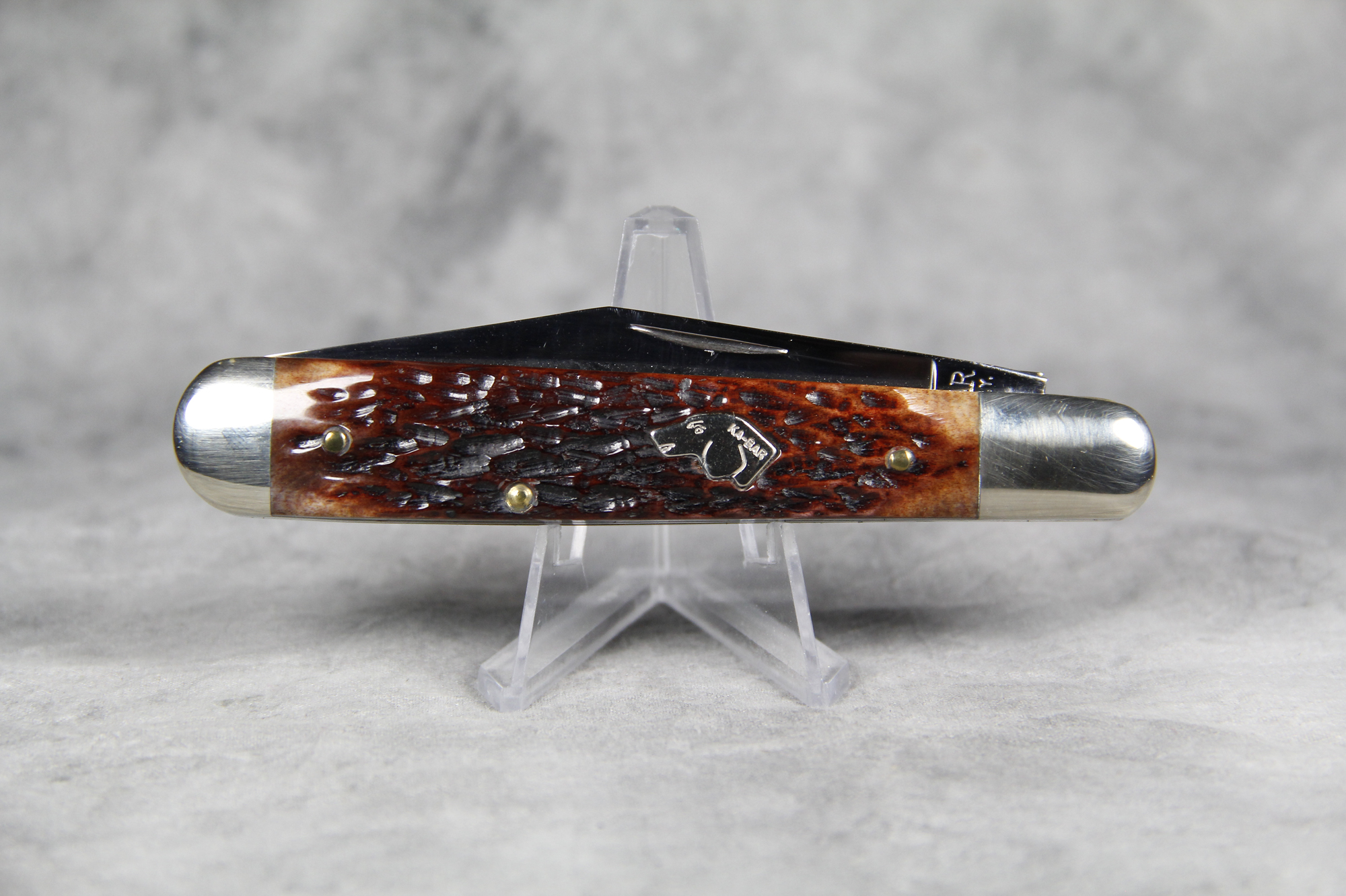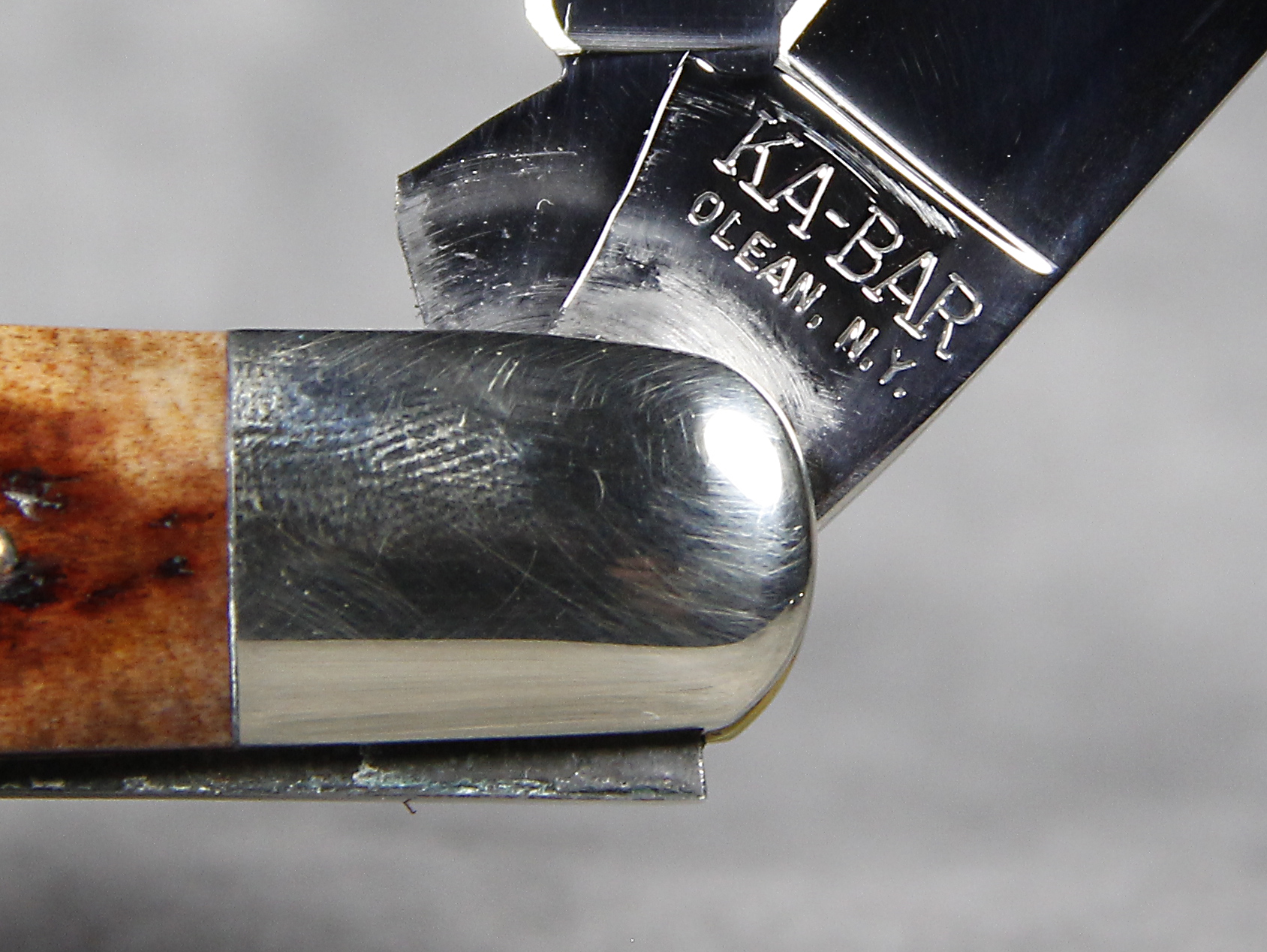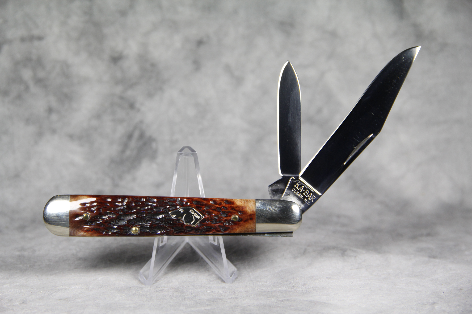 October 26, 2025 - 2-Blade Large Jack Knife. 4-1/2 inches closed. 8 inches open. Made in USA. "KA-BAR OLEAN, N.Y." tang stamp. KA-BAR Dog's Head shield. Stainless Steel blades. Jigged Bone handle. Nickel Silver bolsters. Brass liner.