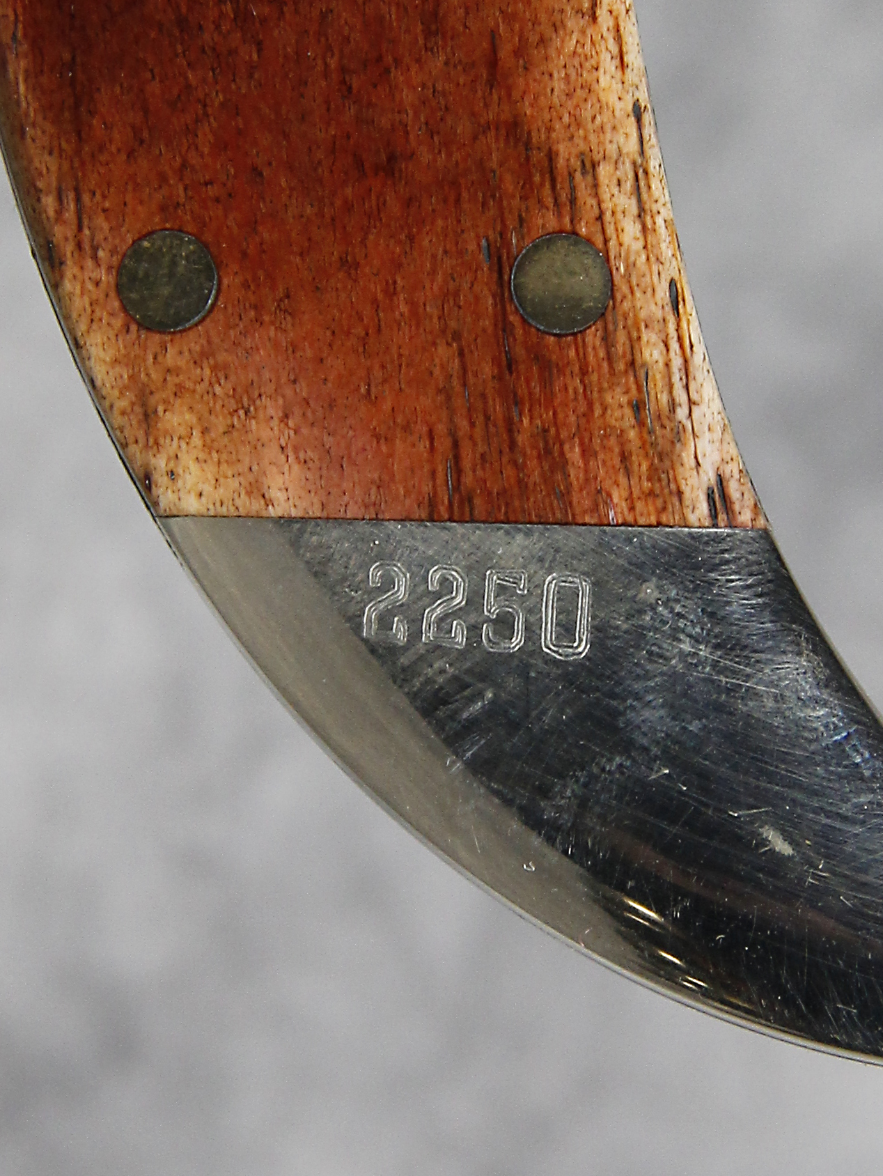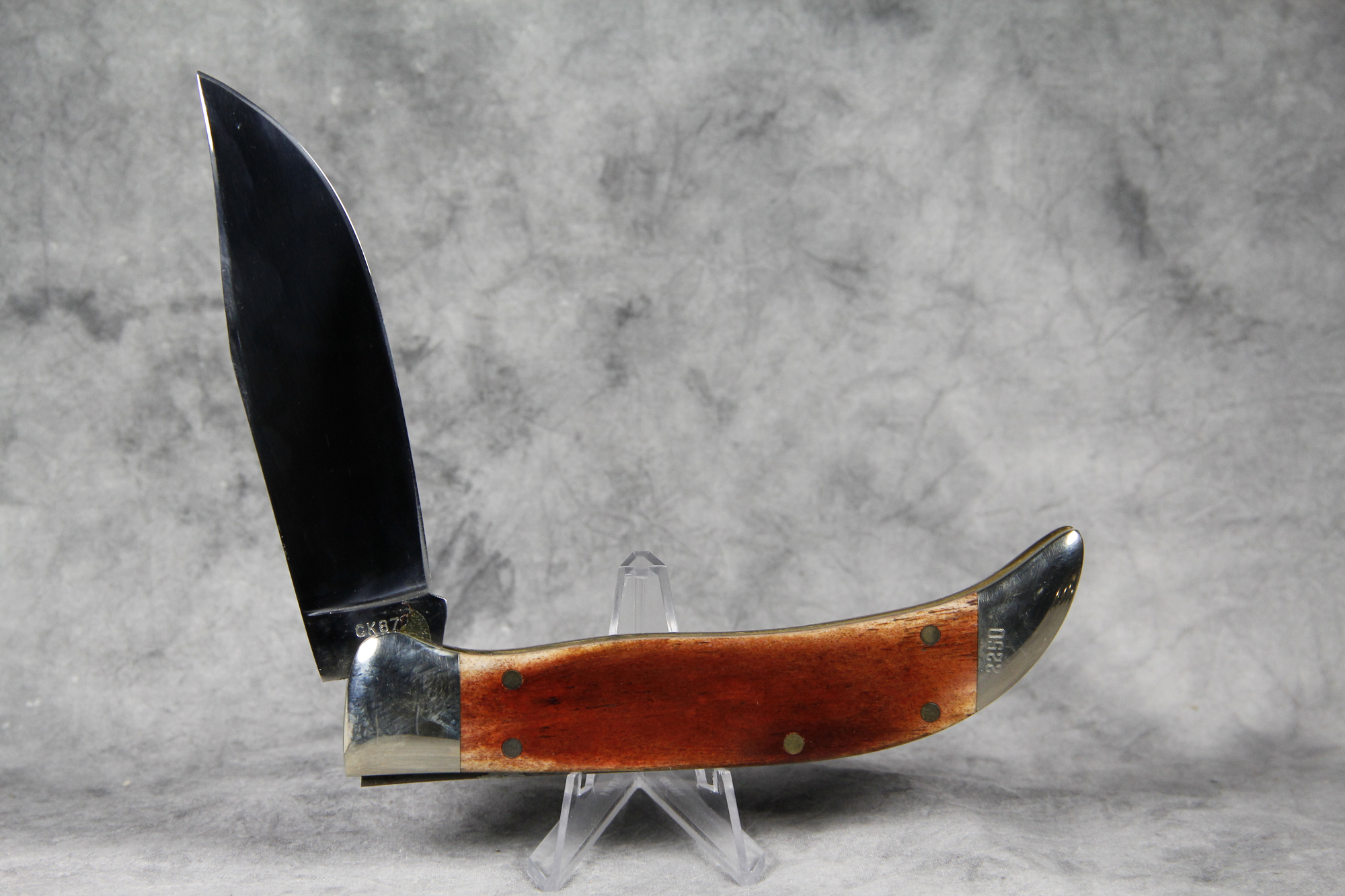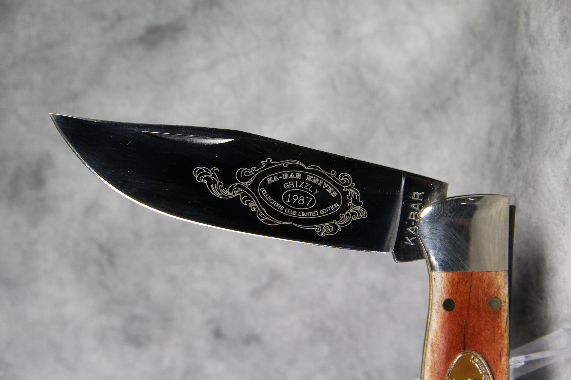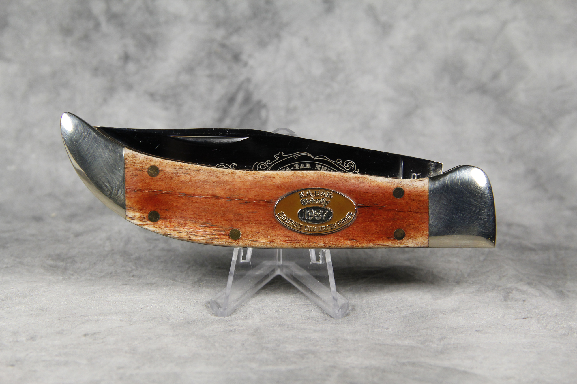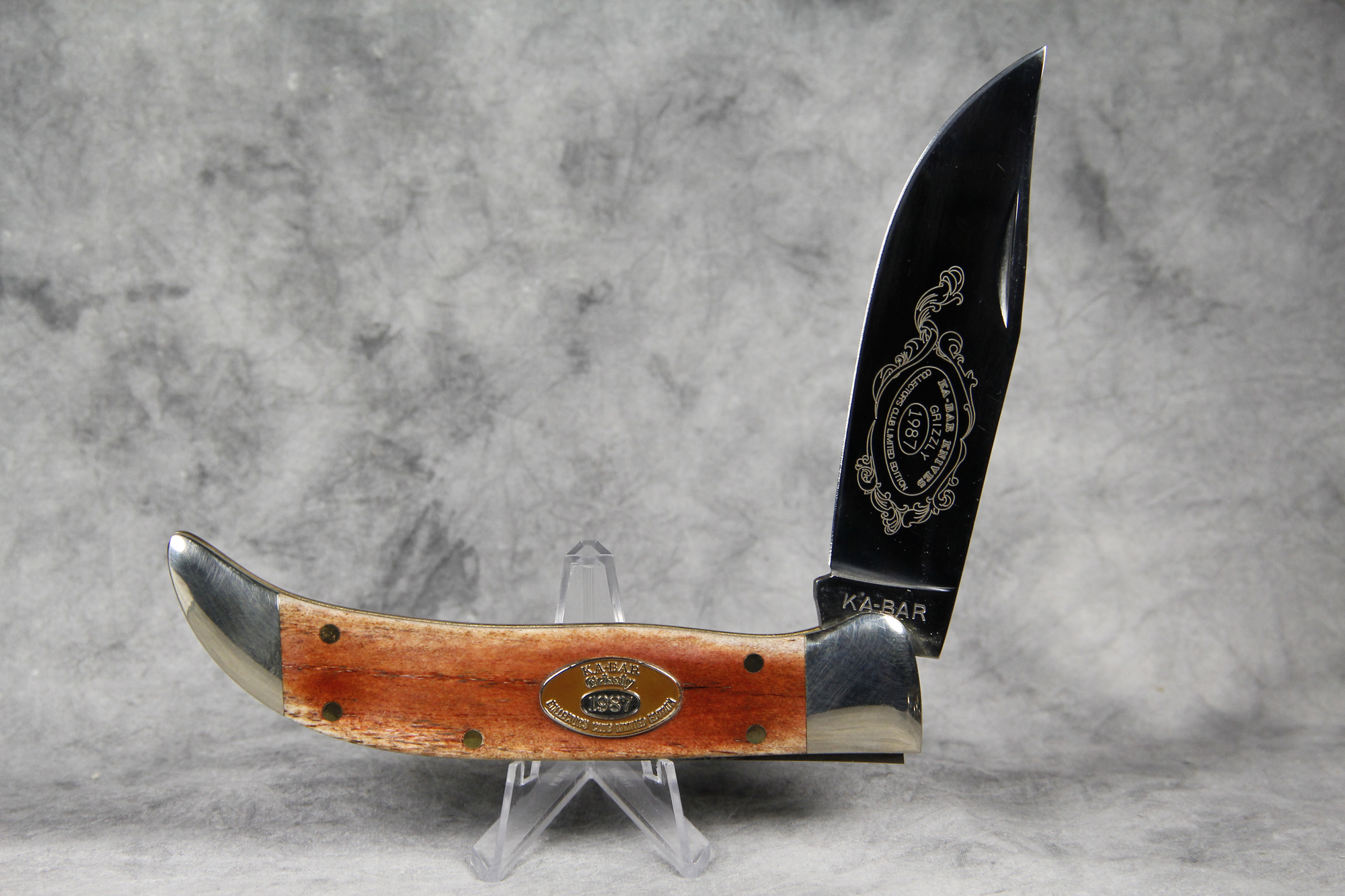 October 26, 2025 - Single Blade Grizzly Folding Hunters Knife. Limited Edition #2250 etched into rear bolster. 5-1/2 inches closed. 9-3/4 inches open. Made in USA. "KA-BAR" and "CK87" tang stamps. Oval "KA-BAR KNIVES Grizzly" shield. Stainless Steel blade etched with beautiful scrollwork and "KA-BAR KNIVES GRIZZLY 1987 COLLECTOR'S CLUB LIMITED EDITION". Smooth Polished Bone handle. Nickel Silver bolsters. Brass liner.