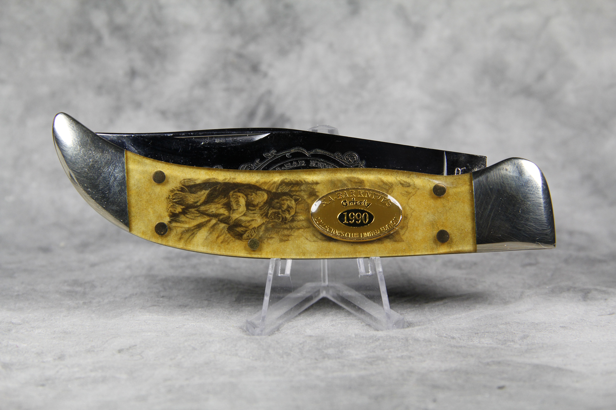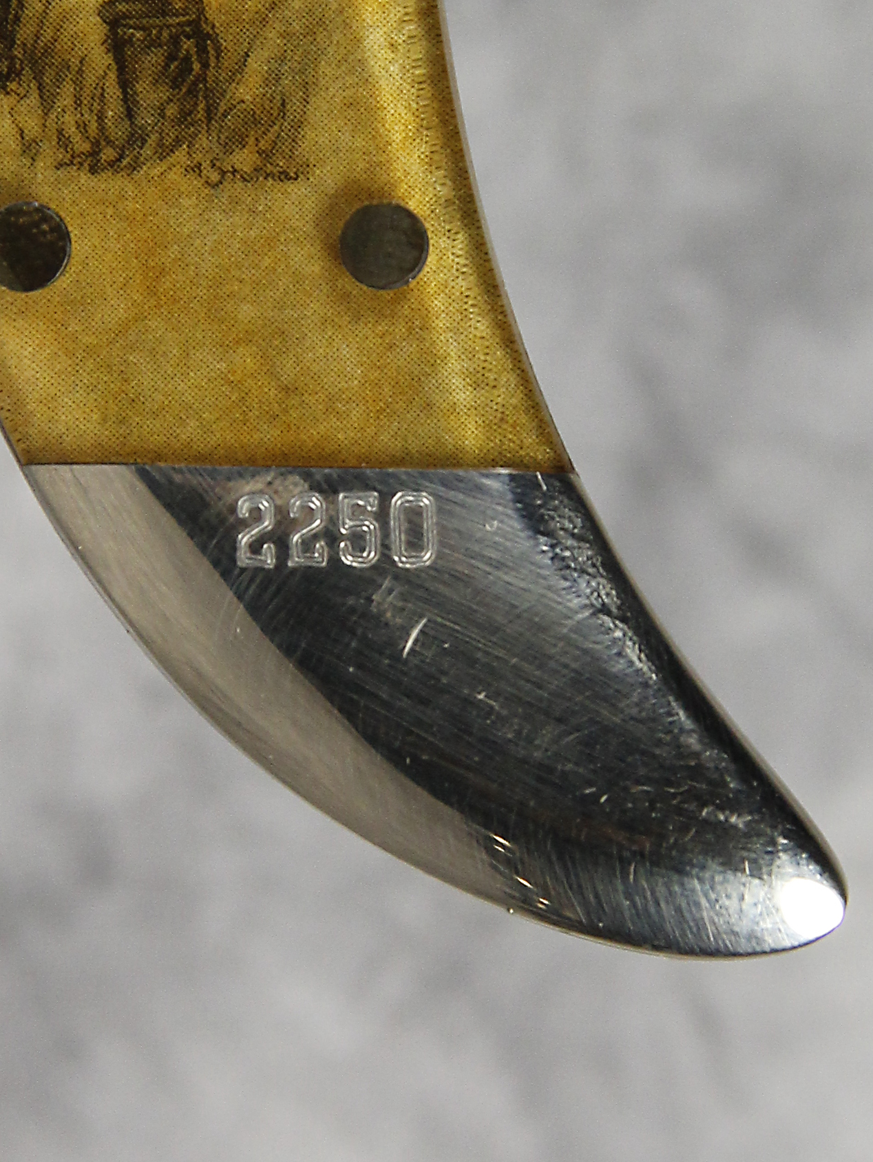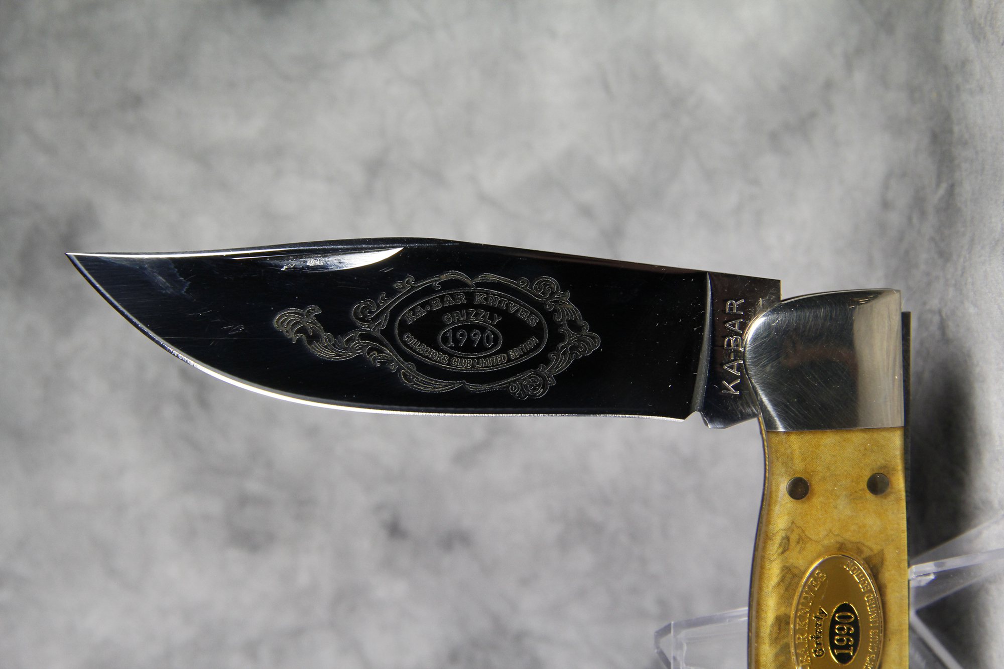 February 03, 2026 - Single Blade Grizzly Folding Hunters Knife. Limited Edition #2250 etched into rear bolster. 5-1/2 inches closed. 9-3/4 inches open. Made in USA. "KA-BAR" and "CK90" tang stamps. Oval "KA-BAR KNIVES Grizzly" shield. Stainless Steel blade etched with beautiful scrollwork and "KA-BAR KNIVES GRIZZLY 1990 COLLECTOR'S CLUB LIMITED EDITION". Epoxy Embedded Original Grizzly Drawings on both sides of handle. Nickel Silver bolsters. Brass liner.