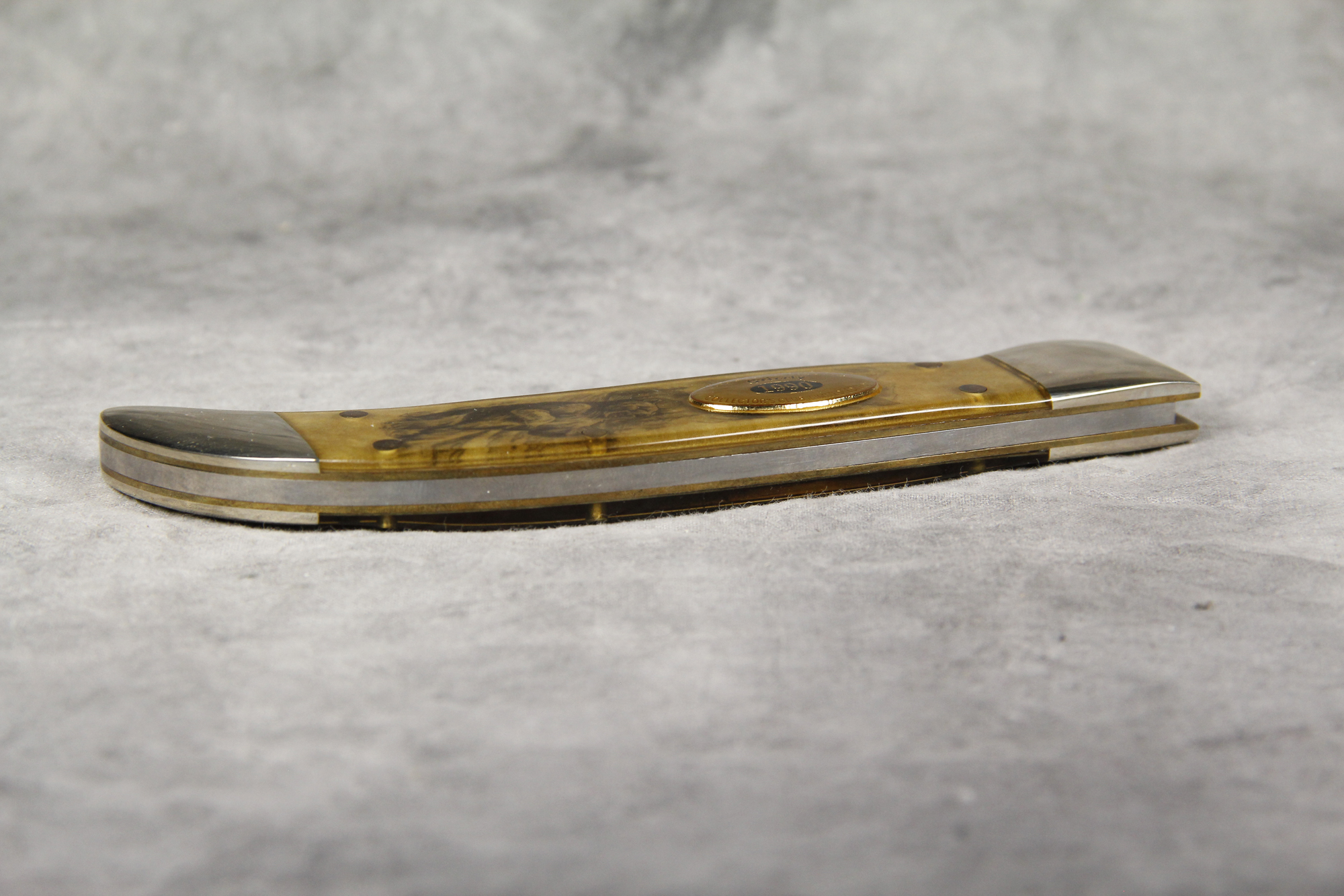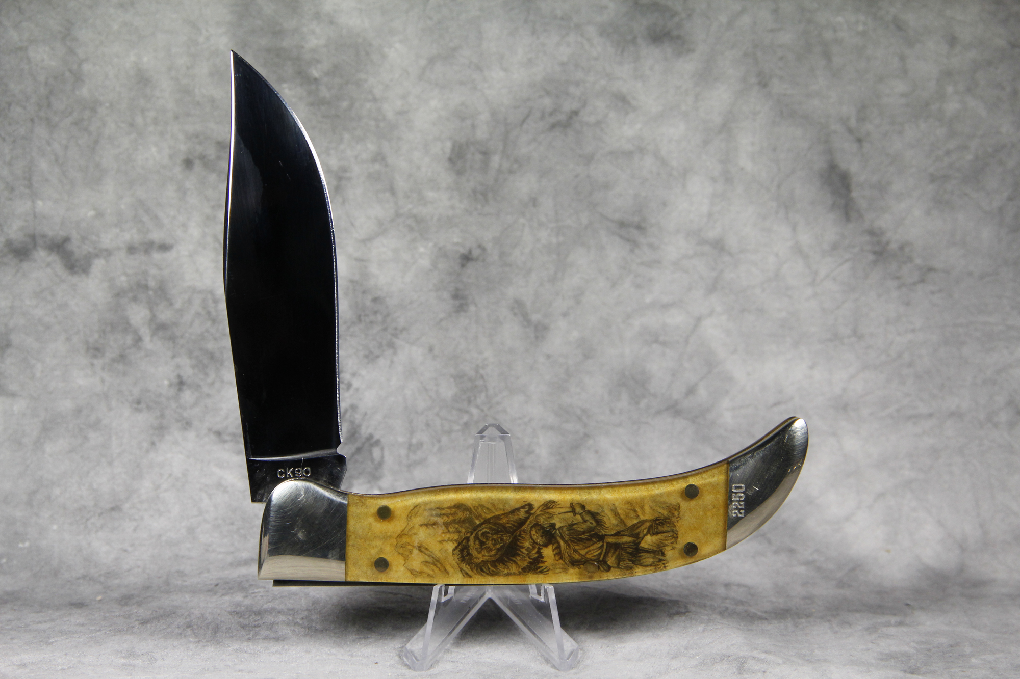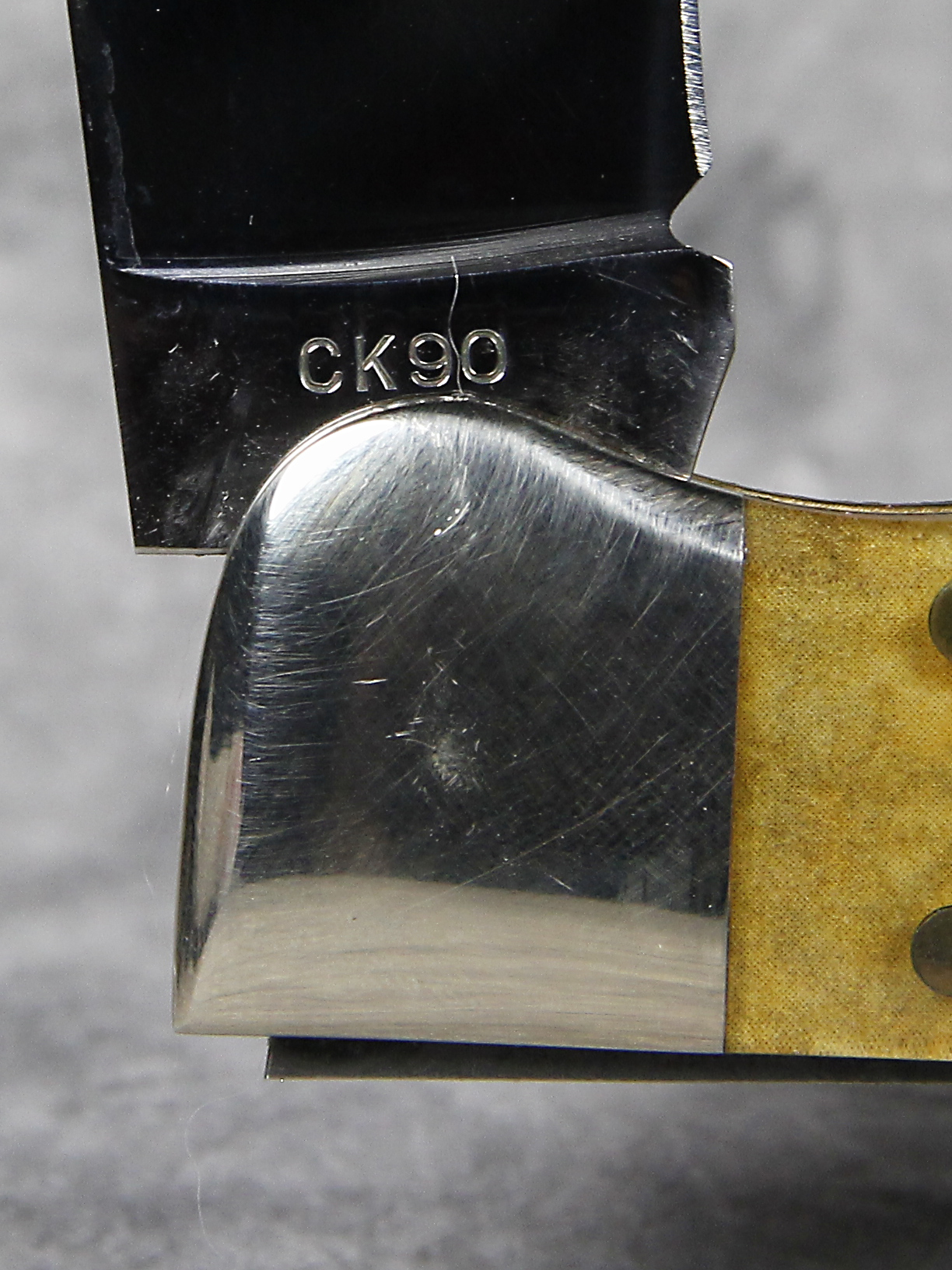 February 03, 2026 - Single Blade Grizzly Folding Hunters Knife. Limited Edition #2250 etched into rear bolster. 5-1/2 inches closed. 9-3/4 inches open. Made in USA. "KA-BAR" and "CK90" tang stamps. Oval "KA-BAR KNIVES Grizzly" shield. Stainless Steel blade etched with beautiful scrollwork and "KA-BAR KNIVES GRIZZLY 1990 COLLECTOR'S CLUB LIMITED EDITION". Epoxy Embedded Original Grizzly Drawings on both sides of handle. Nickel Silver bolsters. Brass liner.