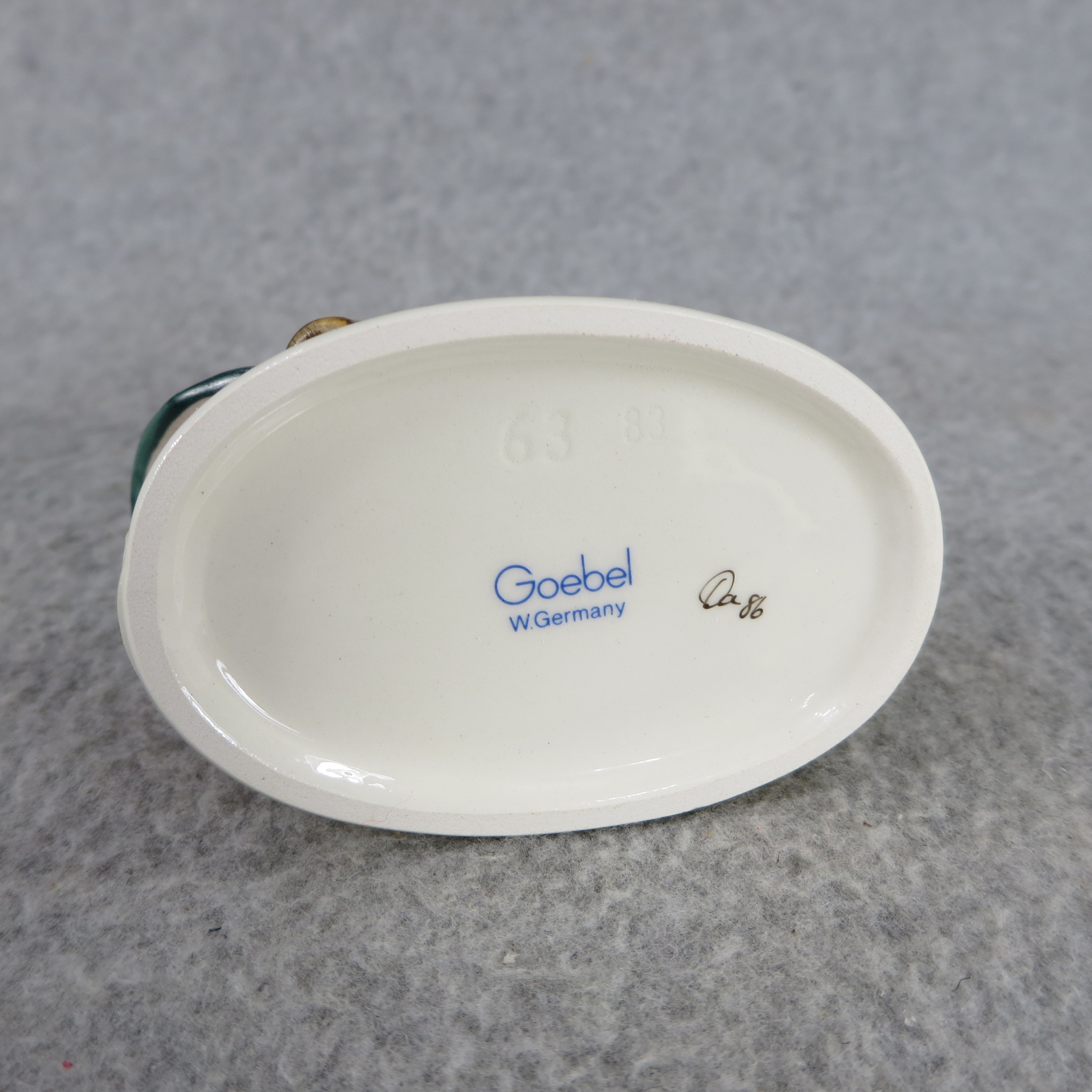 October 28, 2025 - 3 inches tall. Base is incised 63. Goebel TMK 6 trademark imprinted in blue on bottom of base. Painter hand-initialed and dated in black ink on bottom of base.