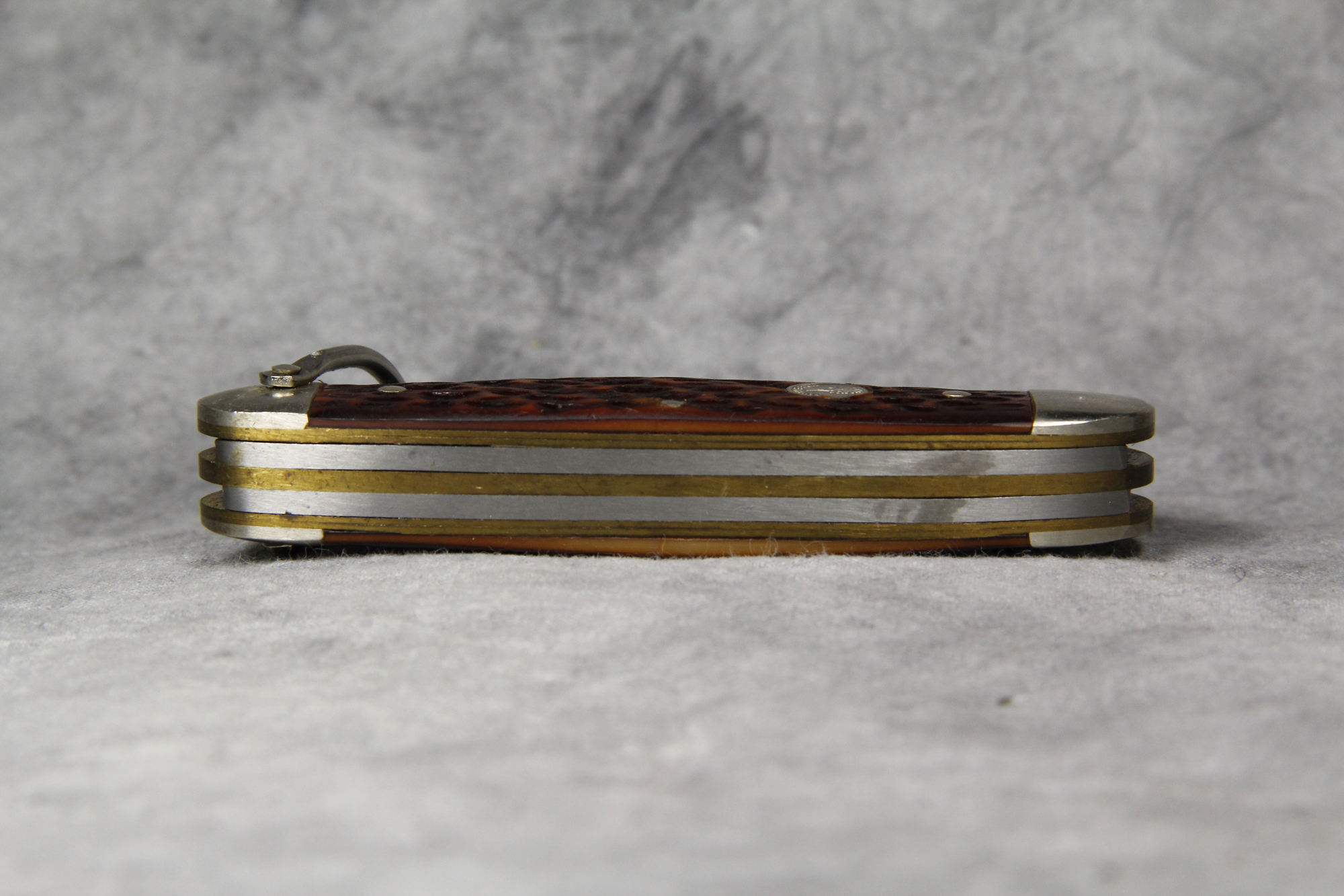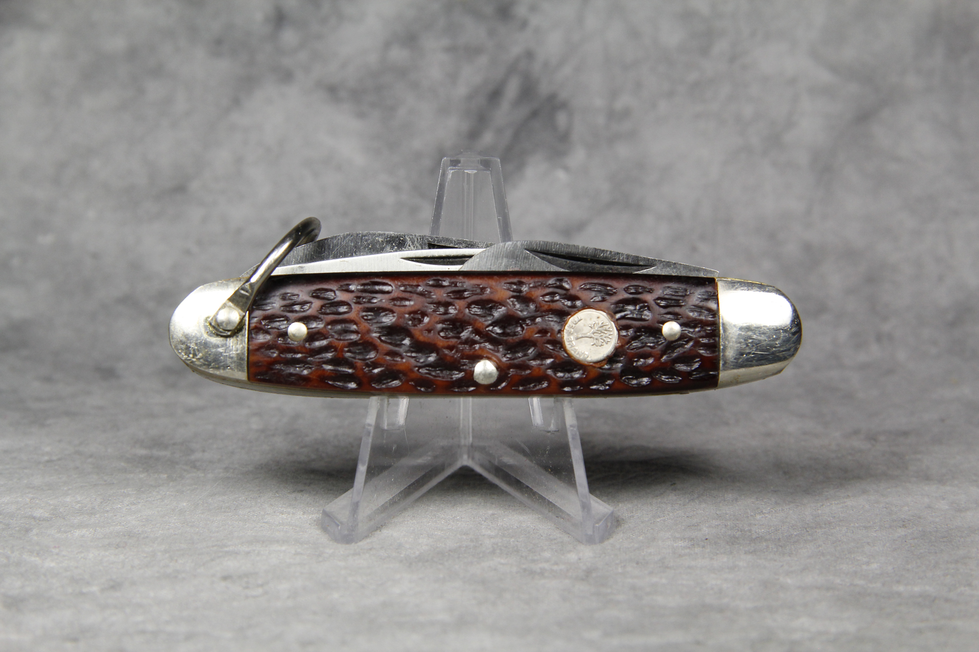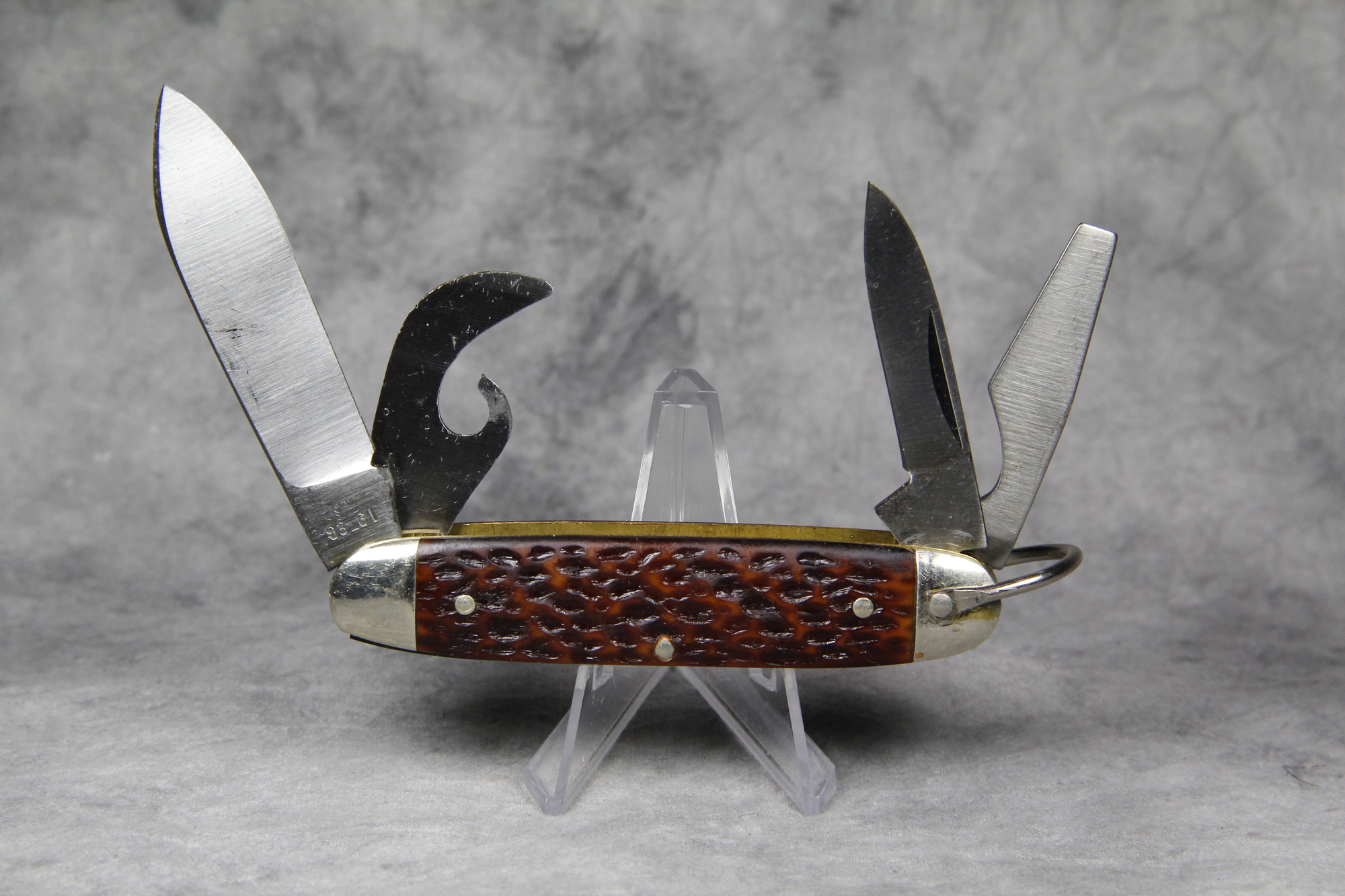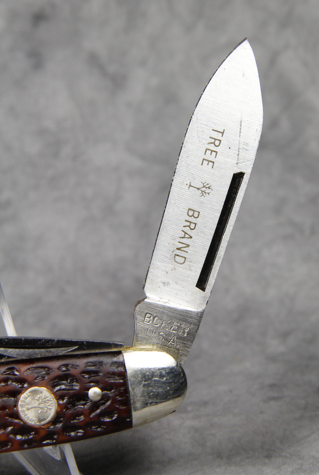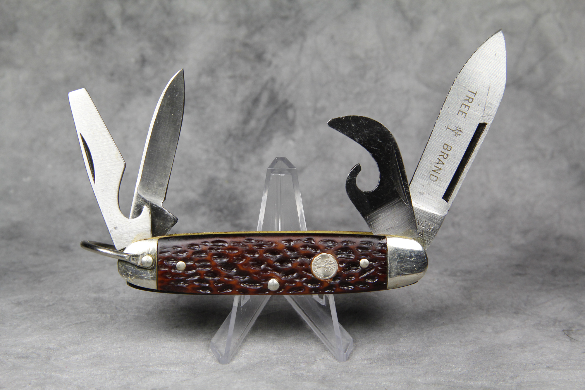 December 04, 2025 - 4-Blade Utility Scout Knife. 3-3/4 inches closed. 6-1/4 inches open. "BOKER U.S.A" and "9361" with tree logo tang stamps. Circle Tree Brand shield. Carbon Steel blades. Master blade etched "TREE BRAND" with tree logo. Jigged Delrin handle. Nickel Silver bolsters. Brass liner.
