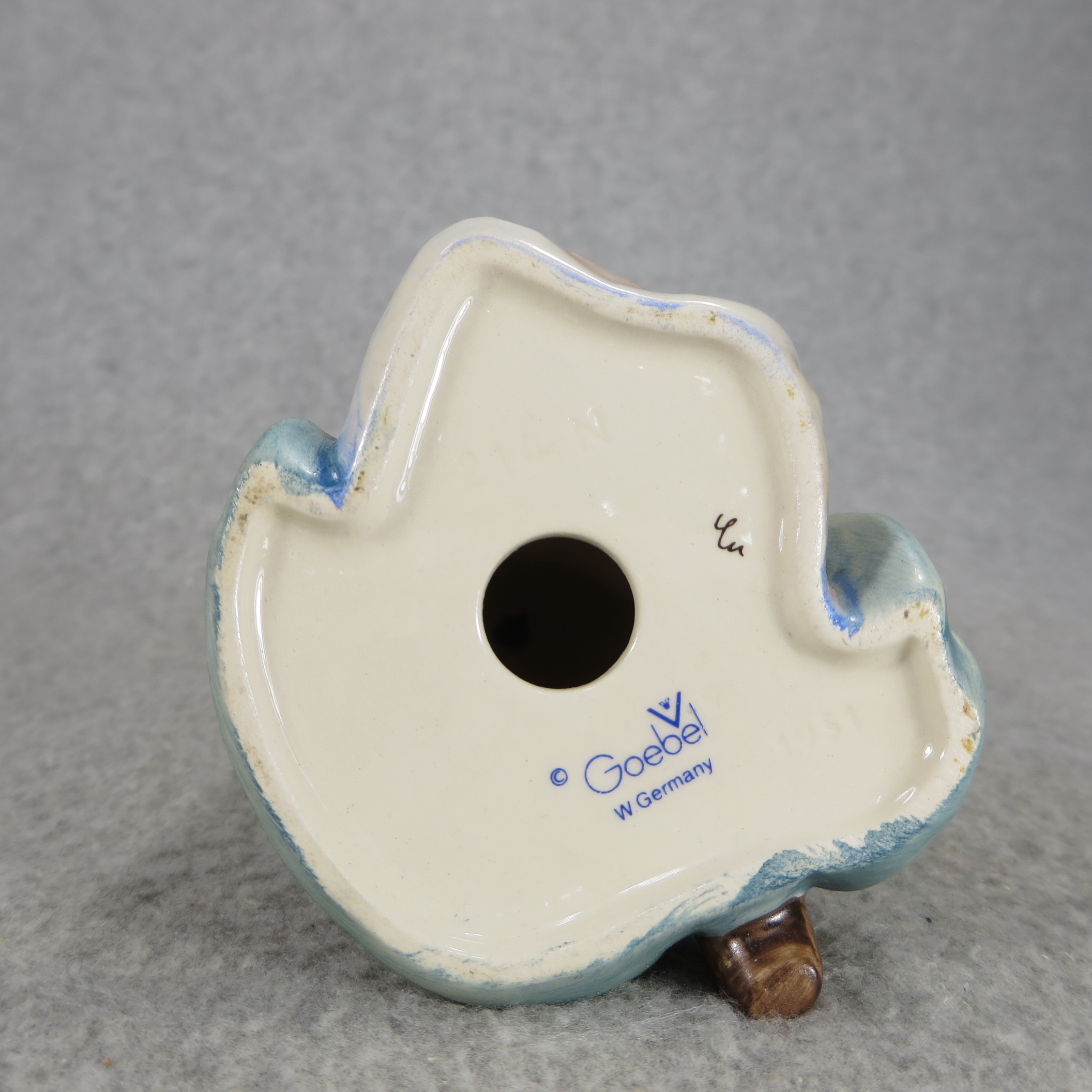 April 05, 2026 - 5-1/2 inches tall. Base is incised 214/N and 1951. Goebel TMK 5 trademark imprinted in blue on bottom of base. Painter hand-initialed in black ink on bottom of base.
