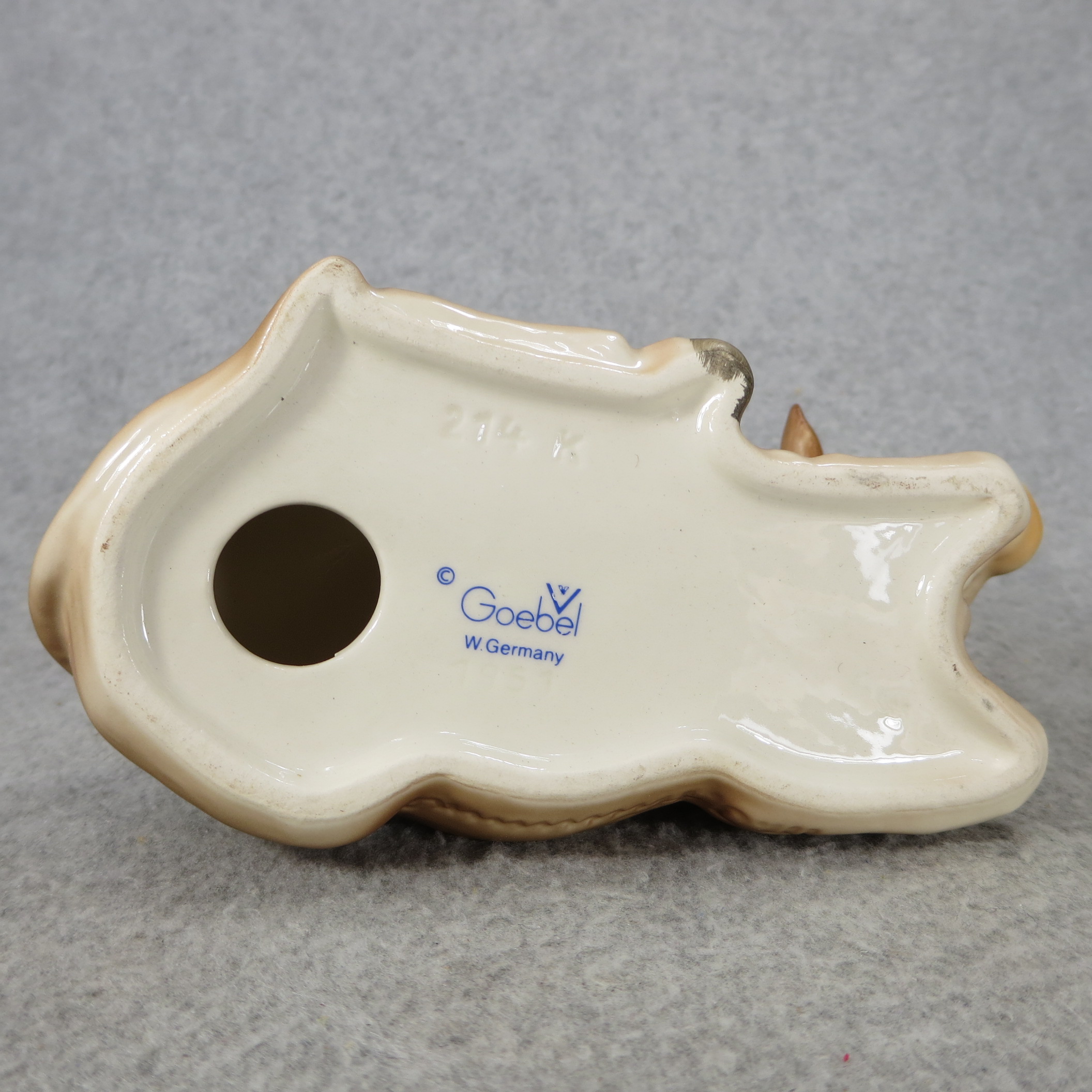 April 05, 2026 - 6-1/4 inches wide. 3-1/2 inches tall. Base is incised 214/K and 1951. Goebel TMK 5 trademark imprinted in blue on bottom of base.
