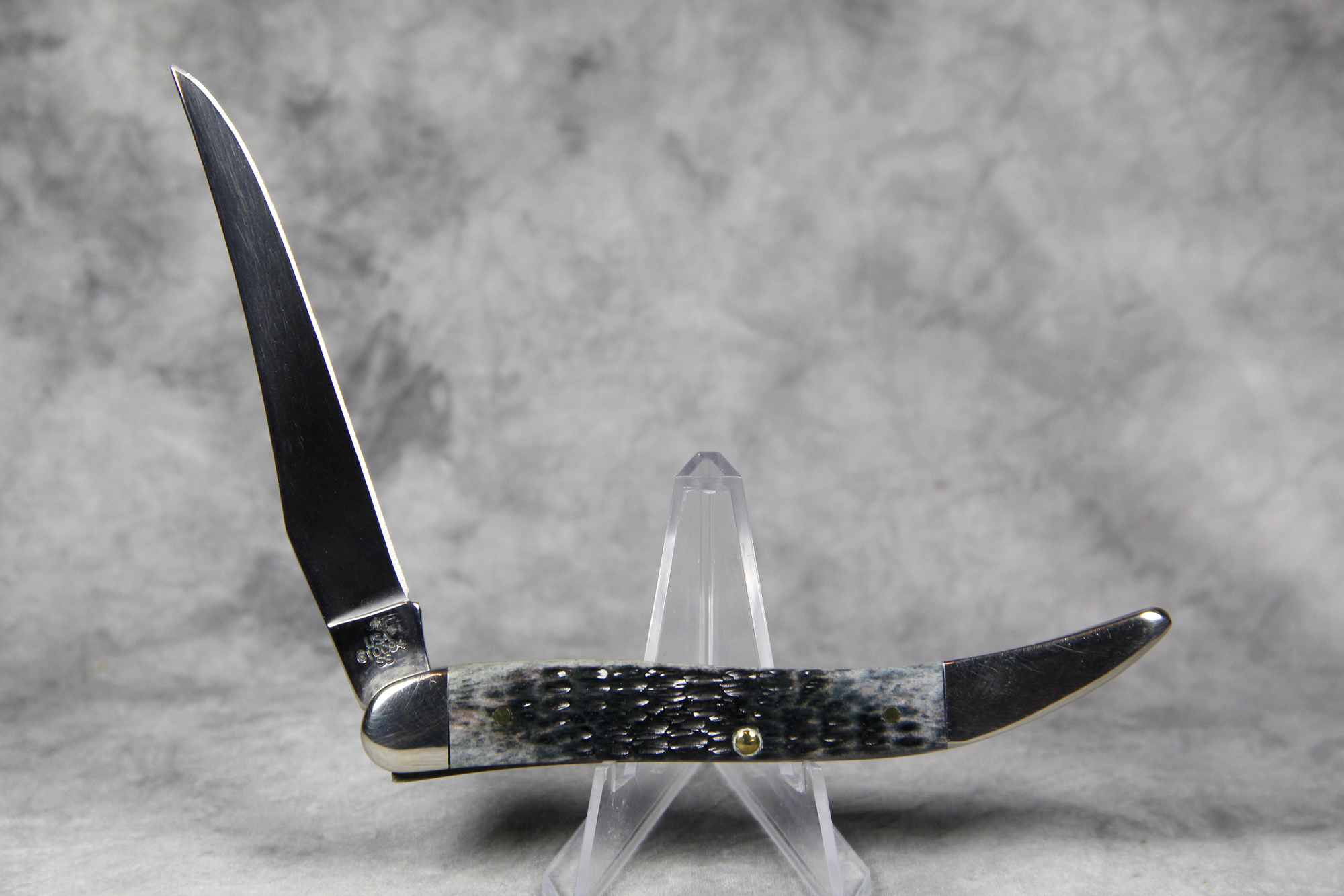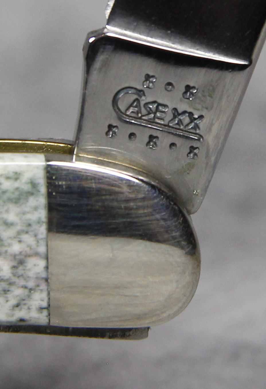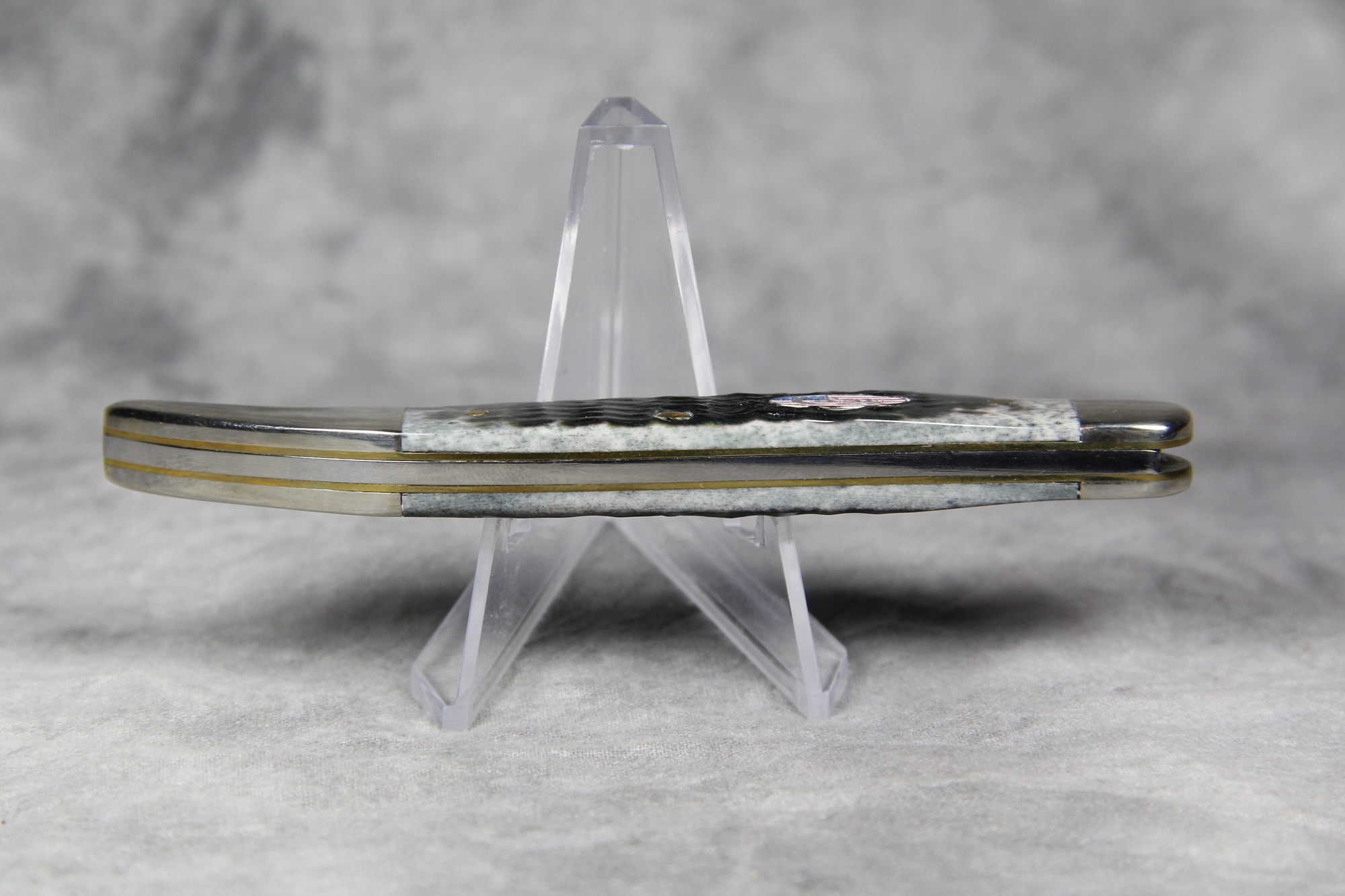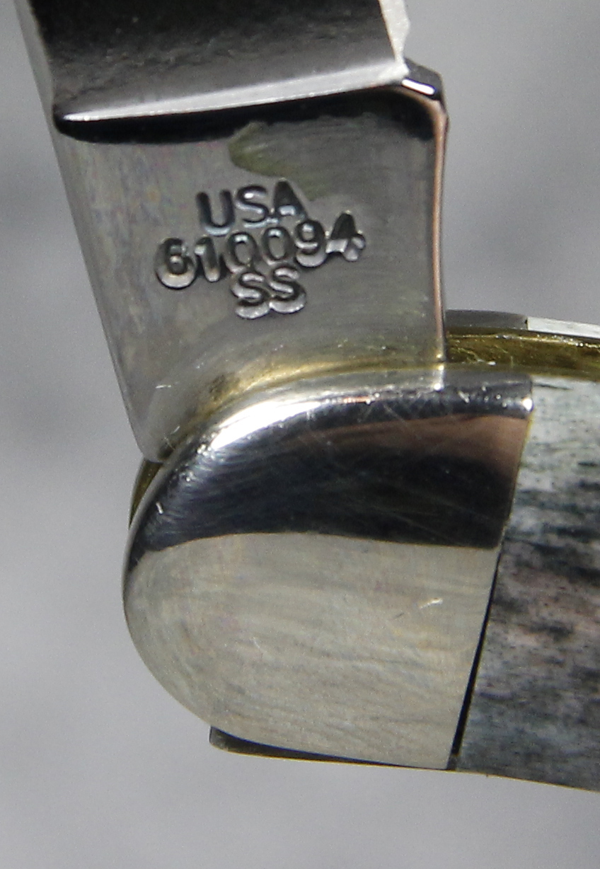 April 05, 2026 - 4-1/4 inches closed. 7-5/8 inches open. Made in USA. " x*x Case XX x*x*x " (with lightning bolt S) and "USA 610094 SS" tang stamps. Single oval red, white, and blue American Flag shield. Introduction of the American flag shield made after the twin tower bombings of 9/11/2001. Stainless Steel blade. Pitch Black Jigged Bone handle. Nickel Silver bolsters. Brass liner.
