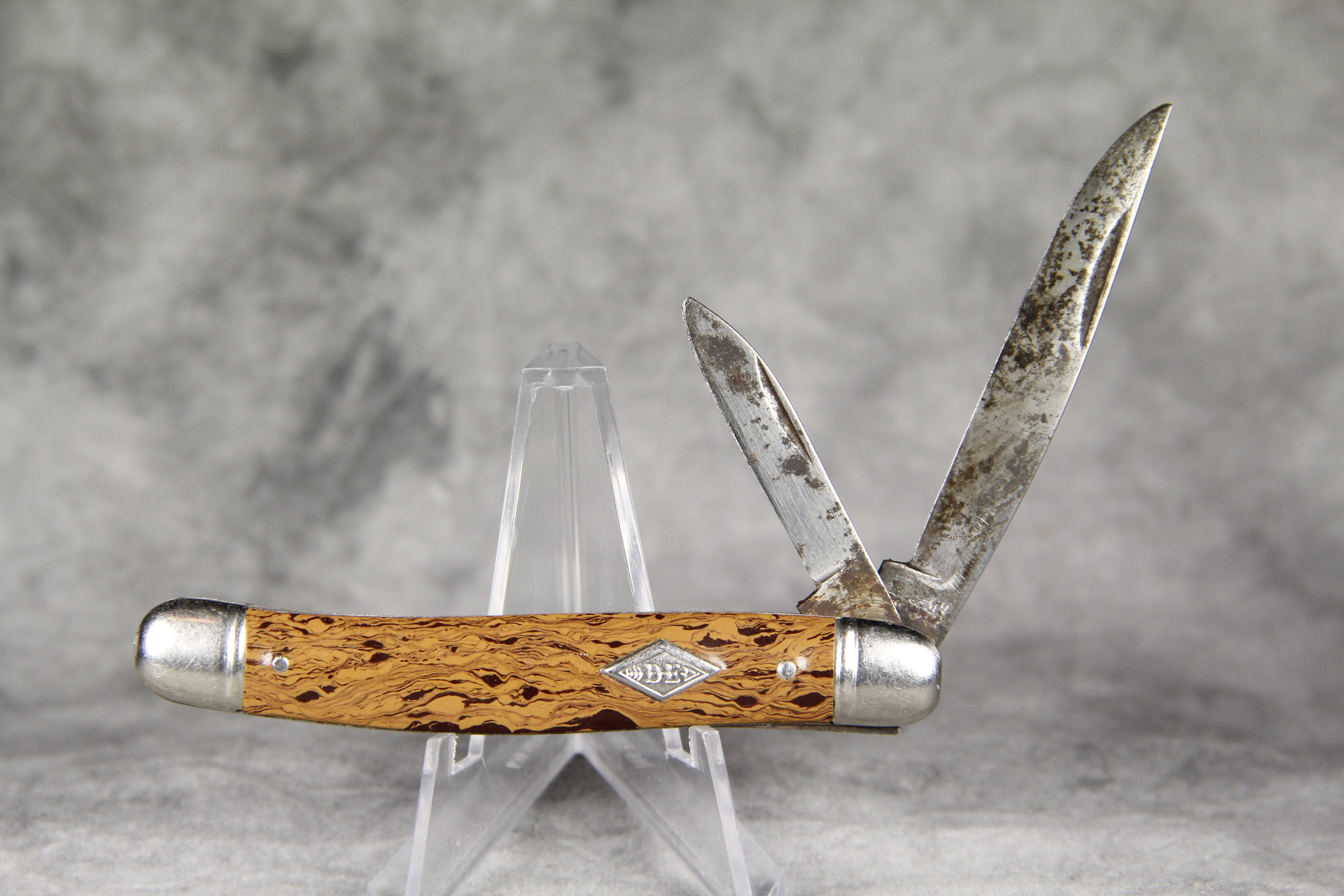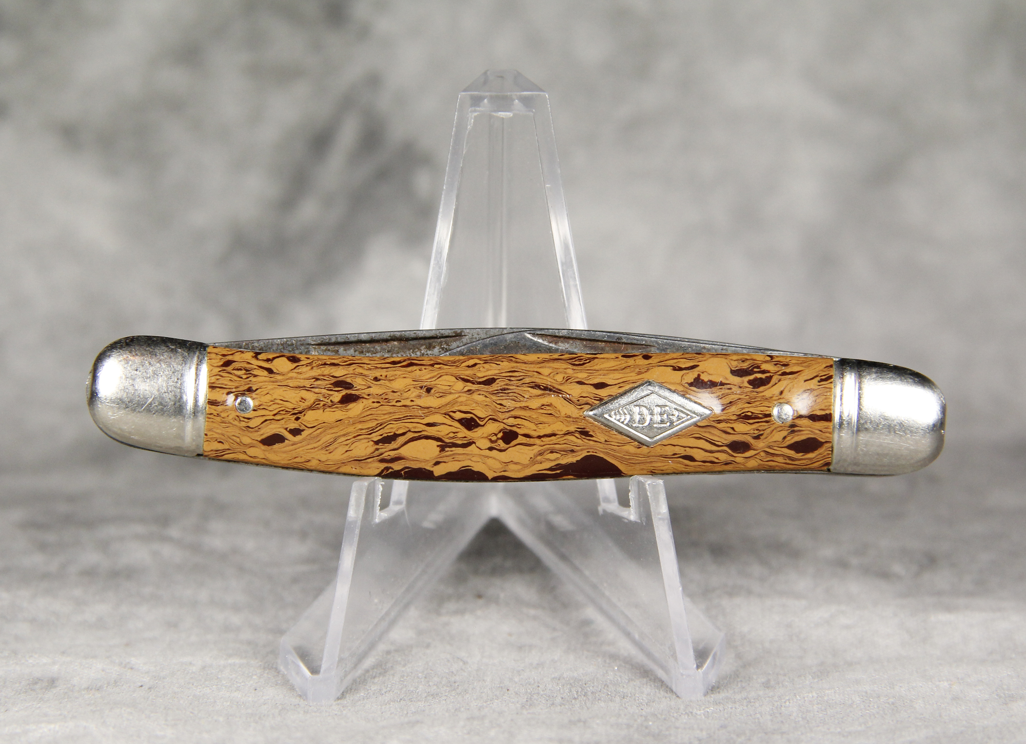April 05, 2026 - 2-Blade Serpentine Jack Knife. 3-1/4 inches closed. 5-5/8 inches open. "Imperial PROV. R.I. USA" tang stamp. Diamond-shaped "DE" with Arrow shield. Chocolate Swirl Celluloid handle. Pinched bolsters.