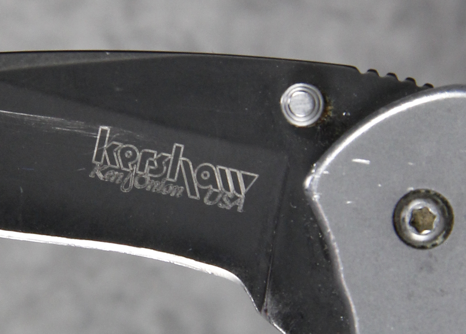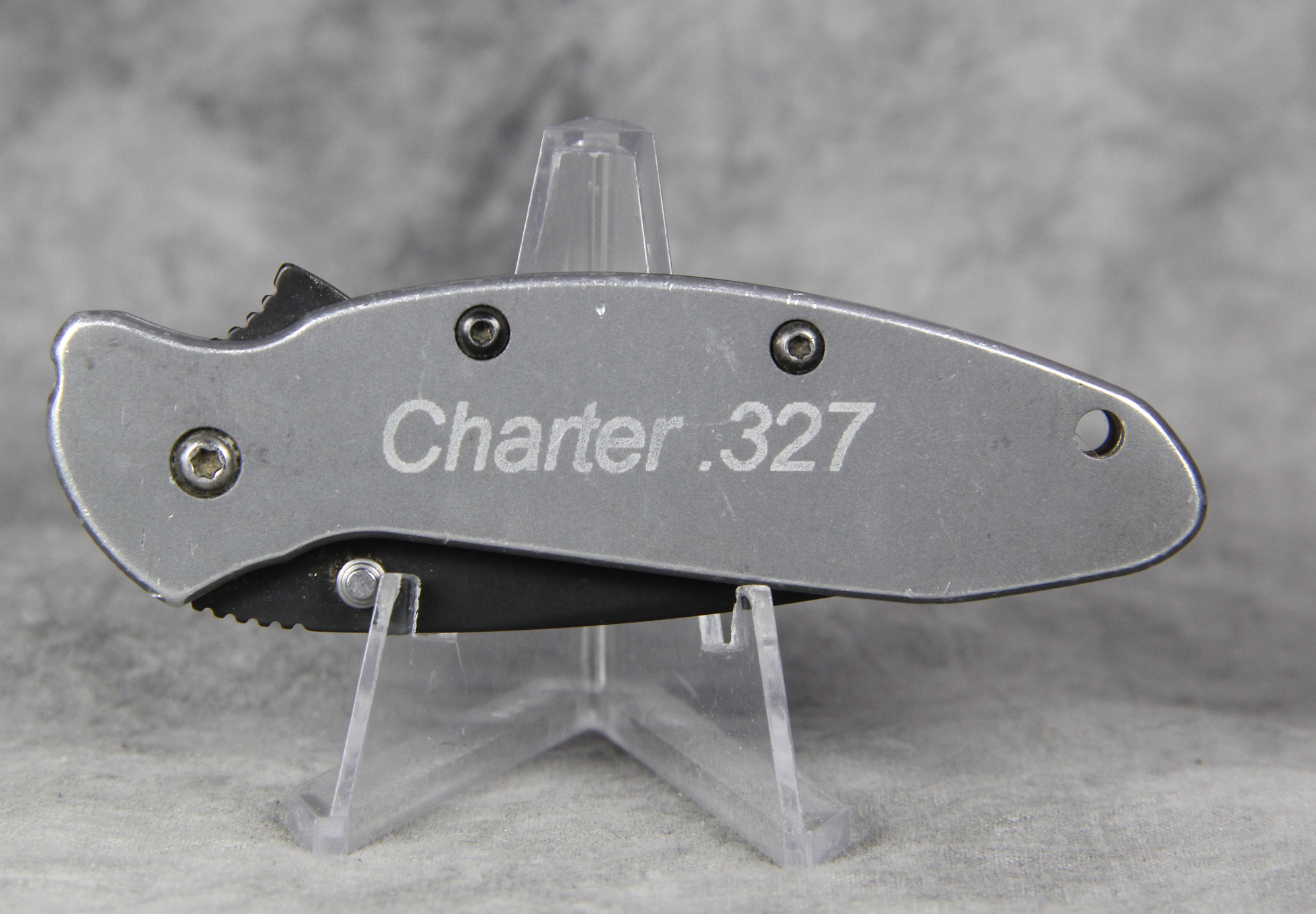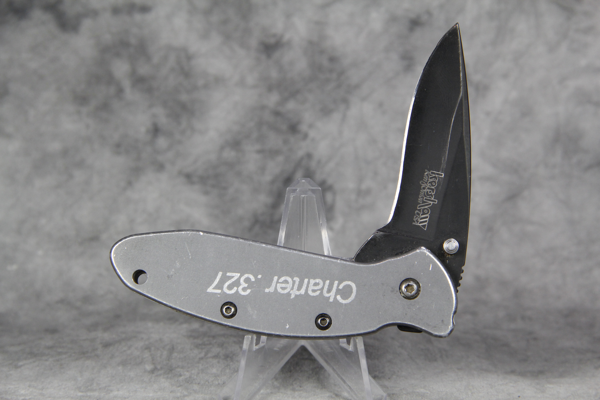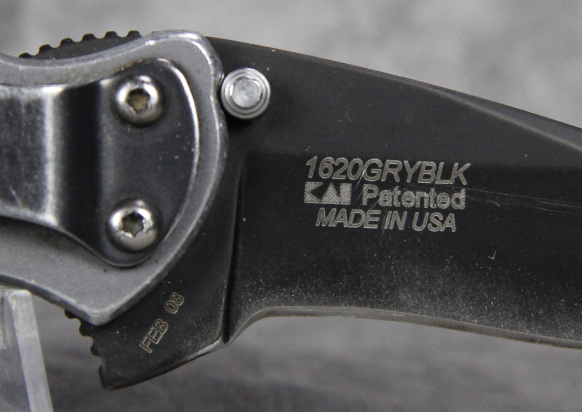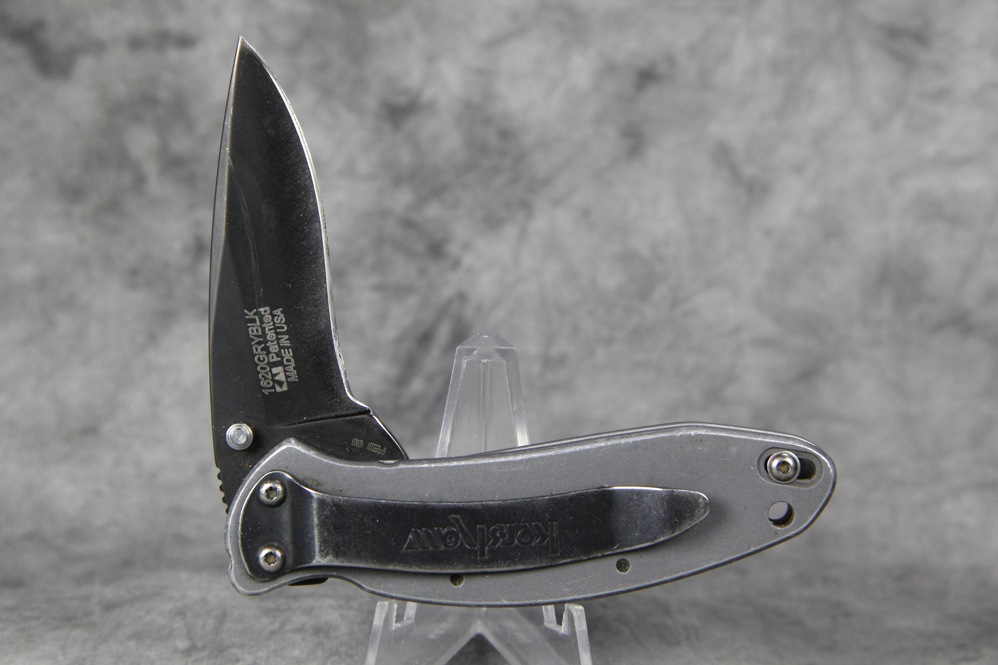October 26, 2025 - Made in USA. 3-1/2 inches closed. 5-3/4 inches open. Grey stainless steel handle etched "Charter .327". Black finish stainless steel blade etched "kershaw Ken Onion USA" and "1620GRYBLK KAL Patented MADE IN USA". Stainless steel clip deep etched "kershaw". "Feb 08" tang stamp.